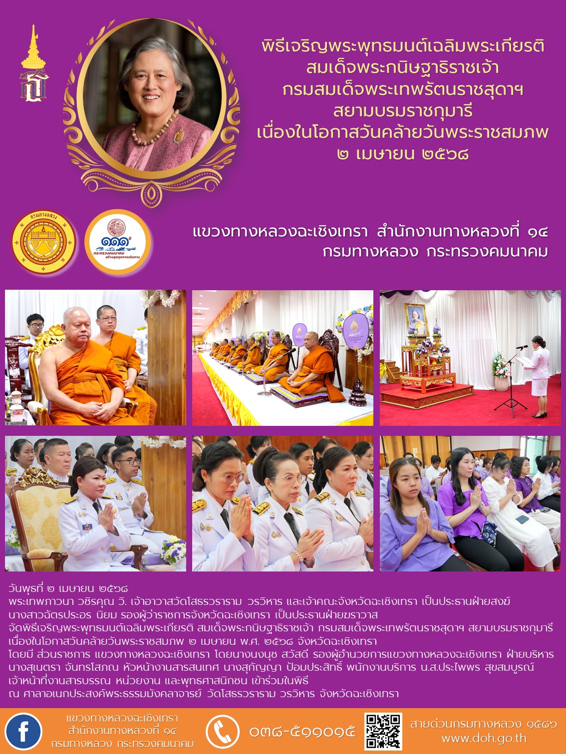 พิธีเจริญพระพุทธมนต์เฉลิมพระเกียรติ สมเด็จพระกนิษฐาธิราชเจ้า กรมสมเด็จพระเทพรัตนราชสุดาฯ สยามบรมราชกุมารี เนื่องในโอกาสวันคล้ายวันพระราชสมภพ ๒ เมษายน ๒๕๖๘ จังหวัดฉะเชิงเทรา