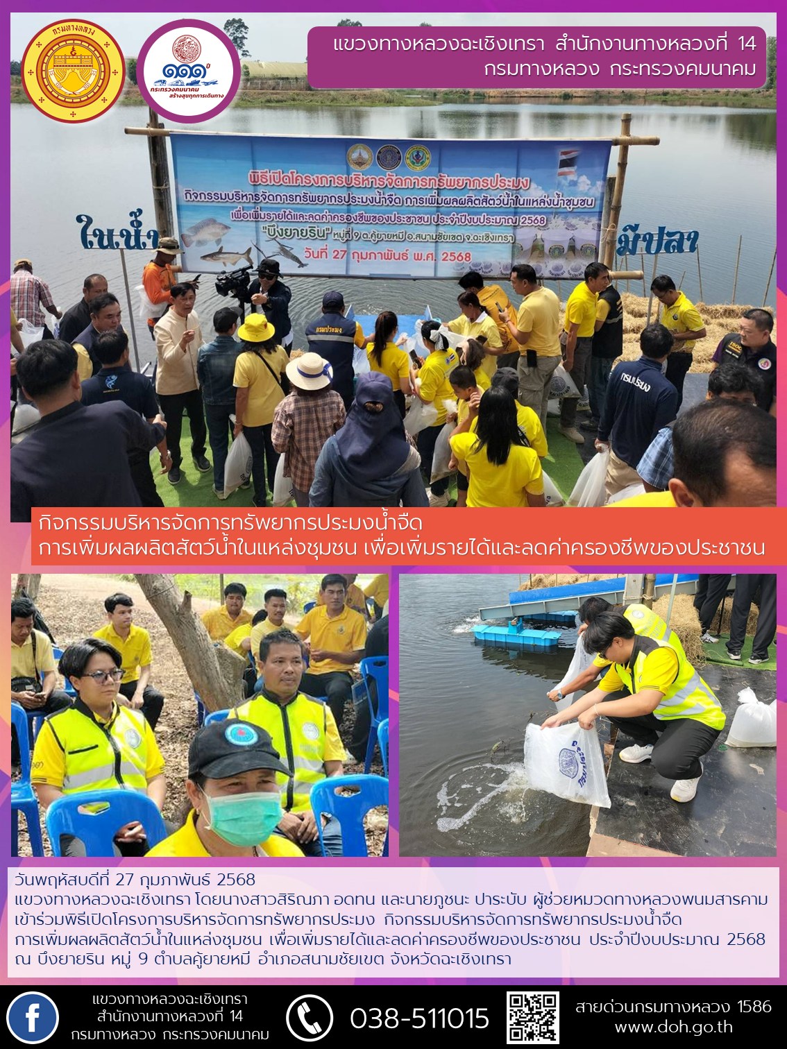 กิจกรรมบริหารจัดการทรัพยากรประมงน้ำจืด การเพิ่มผลผลิตสัตว์น้ำในแหล่งชุมชน เพื่อเพิ่มรายได้และลดค่าครองชีพของประชาชน