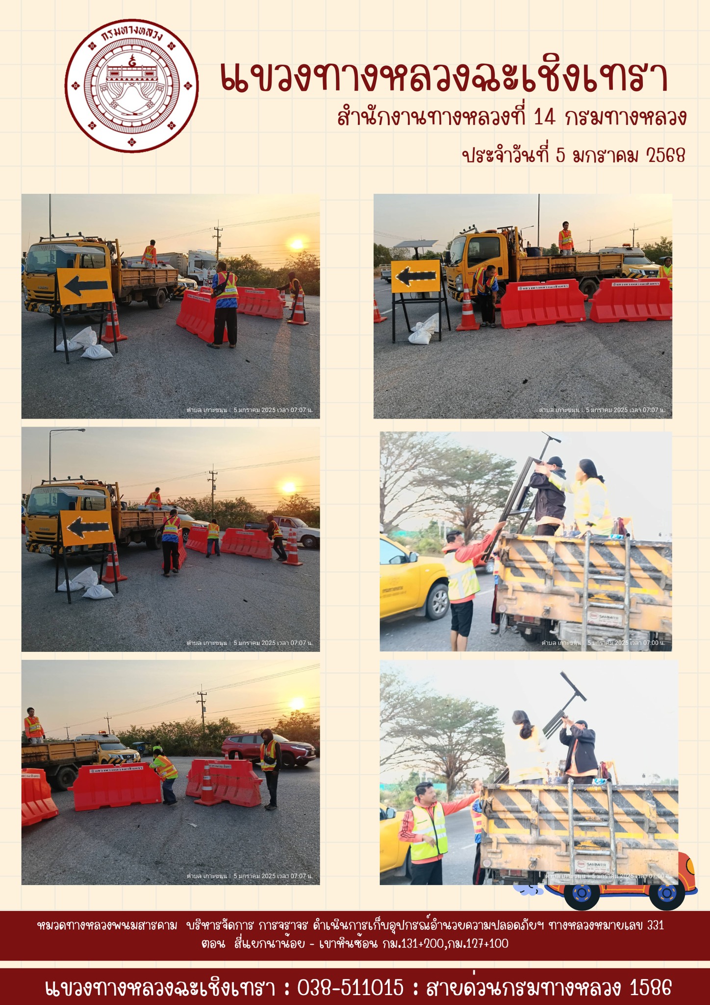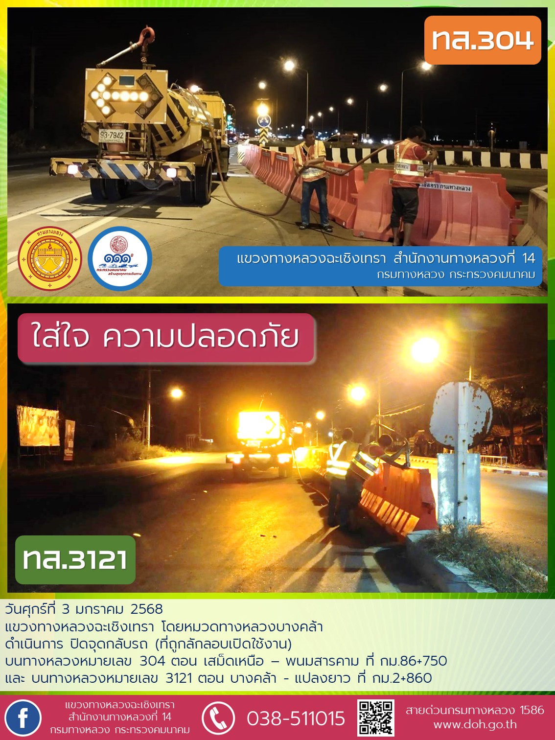 ดำเนินการอำนวยความปลอดภัยใช้ผงดูดชับคราบน้ำมันที่รั่วไหลเพื่อเปิดผิวจราจรได้เป็นปกติ |