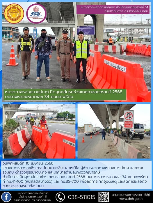 ปิดจุดกลับรถช่วงเทศกาลสงกรานต์ 2568 บนทางหลวงหมายเลข 34 ถนนเทพรัตน |
