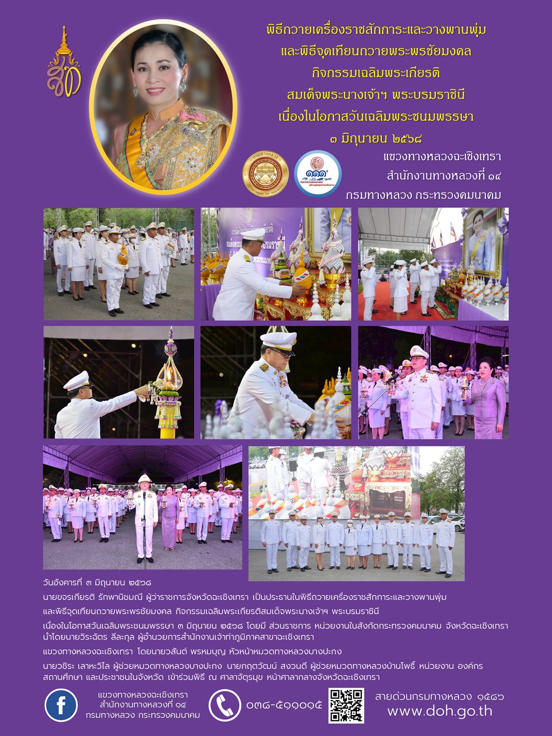 นายขจรเกียรติ รักพานิชมณี ผู้ว่าราชการจังหวัดฉะเชิงเทรา เป็นประธานในพิธีถวายเครื่องราชสักการะและวางพานพุ่ม และพิธีจุดเทียนถวายพระพรชัยมงคล กิจกรรมเฉลิมพระเกียรติสมเด็จพระนางเจ้าฯ พระบรมราชินี เนื่องในโอกาสวันเฉลิมพระชนมพรรษา ๓ มิถุนายน ๒๕๖๘ โดยมี ส่วนราชการ หน่วยงานในสังกัดกระทรวงคมนาคม จังหวัดฉะเชิงเทรา นำโดยนายวิระฉัตร ลีละกุล ผู้อำนวยการสำนักงานเจ้าท่าภูมิภาคสาขาฉะเชิงเทรา แขวงทางหลวงฉะเชิงเทรา โดยนายวสันต์ พรหมบุญ หัวหน้าหมวดทางหลวงบางปะกง นายวชิระ เลาหะวิไล ผู้ช่วยหมวดทางหลวงบางปะกง นายกฤตวัฒน์ สงวนดี ผู้ช่วยหมวดทางหลวงบ้านโพธิ์ หน่วยงาน องค์กร สถานศึกษา และประชาชนในจังหวัด เข้าร่วมพิธี ณ ศาลาจัตุรมุข หน้าศาลากลางจังหวัดฉะเชิงเทรา