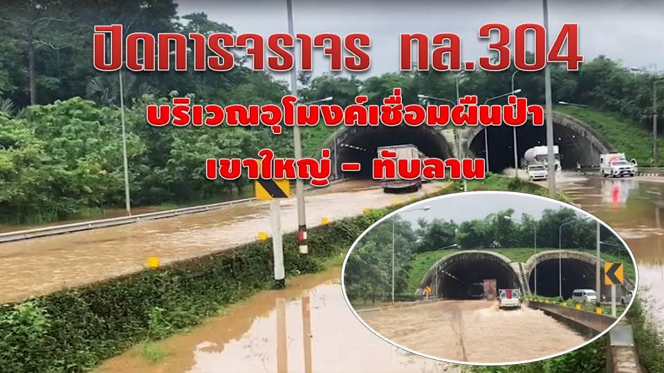เนื่องจากสถานการณ์น้ำท่วม ทางหลวงหมายเลข 304 บริเวณอุโมงค์เชื่อมผืนป่าเขาใหญ่-ทับลาน ช่วง กม.191+600 - กม.196+000 มีปริมาณน้ำเพิ่มสูงขึ้นอย่างรวดเร็วและต่อเนื่อง จึงมีความจำเป็นต้องปิดเส้นทางการจราจร ช่วงบ้านห้วยกระบอก ถึงบริเวณอุโมงค์เชื่อมผืนป่าเขาใหญ่-ทับลาน ทั้งสองฝั่ง เพื่อความปลอดภัยของผู้ใช้เส้นทาง