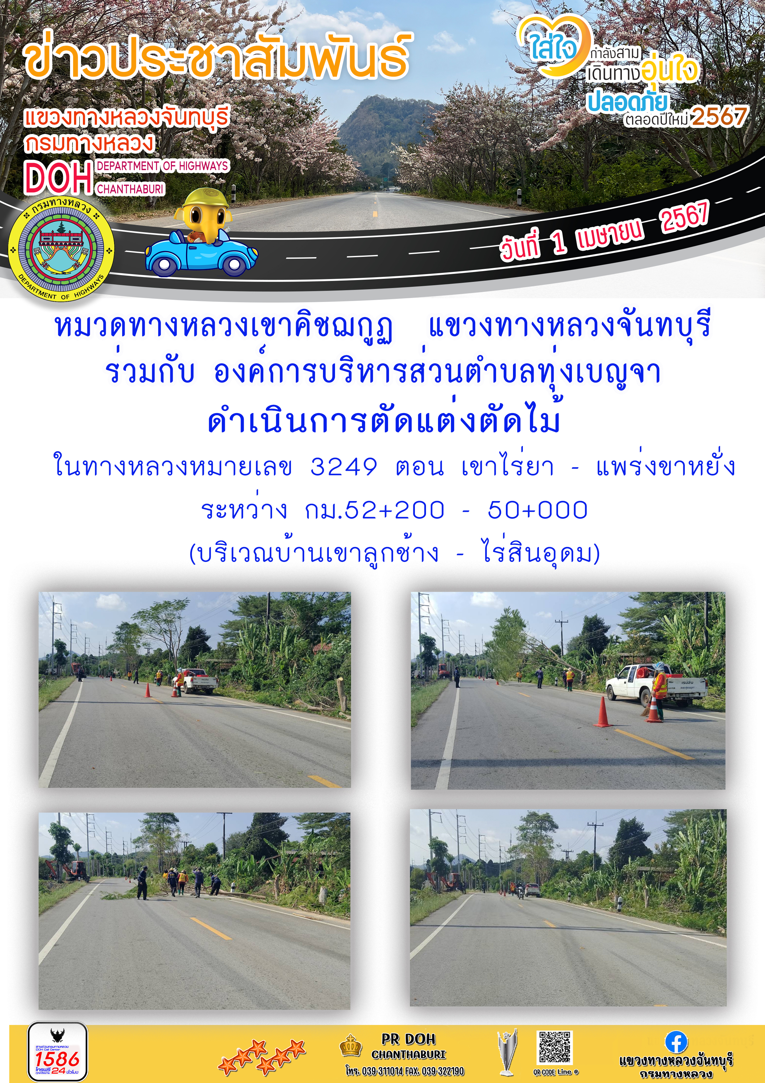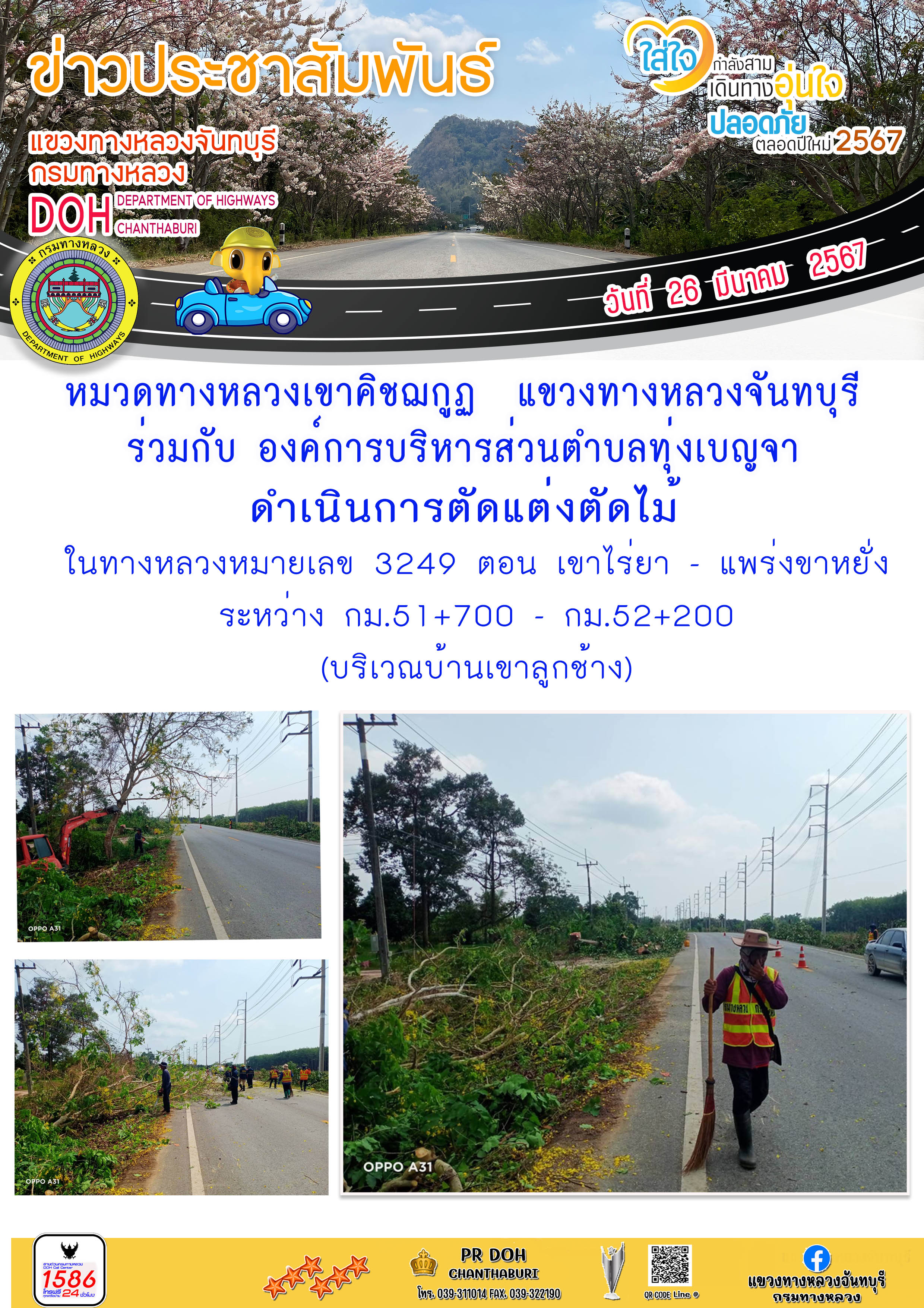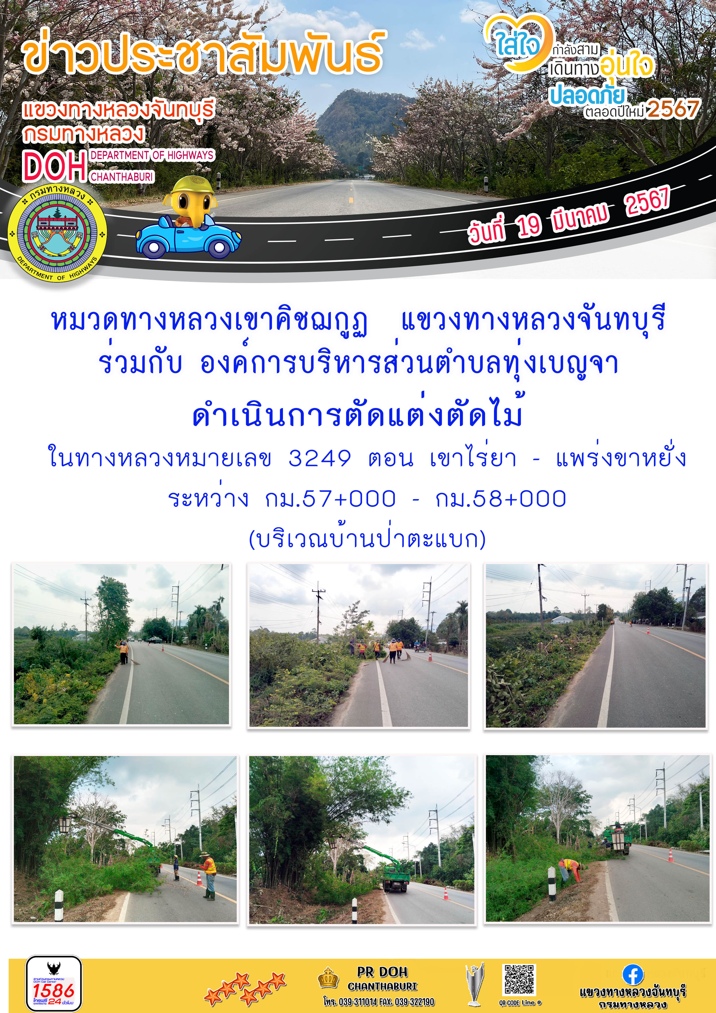 หมวดทางหลวงเขาคิชฌกูฎ แขวงทางหลวงจันทบุรี ร่วมกับ องค์การบริหารส่วนตำบลทุ่งเบญจา ดำเนินการตัดแต่งต้นไม้