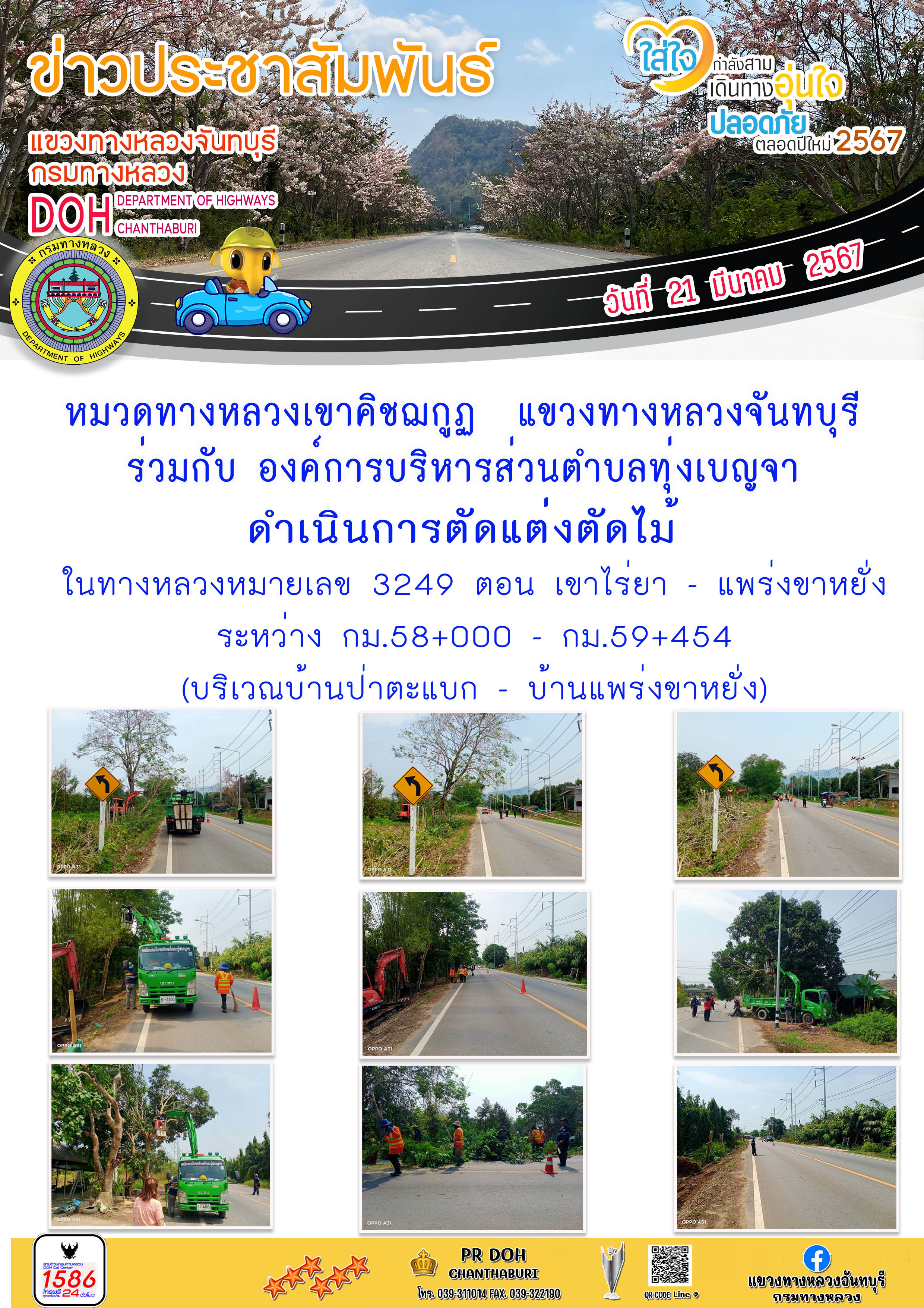 หมวดทางหลวงบางกะจะ ดำเนินการ บริหารเบี่ยงช่องทางการจราจร ตัดแต่งต้นไม้ที่ยื่นล้ำผิวทางและแนวสายไฟฟ้า ในทางหลวงหมายเลข 3348 ตอน หนองขอน - จันทนิมิต