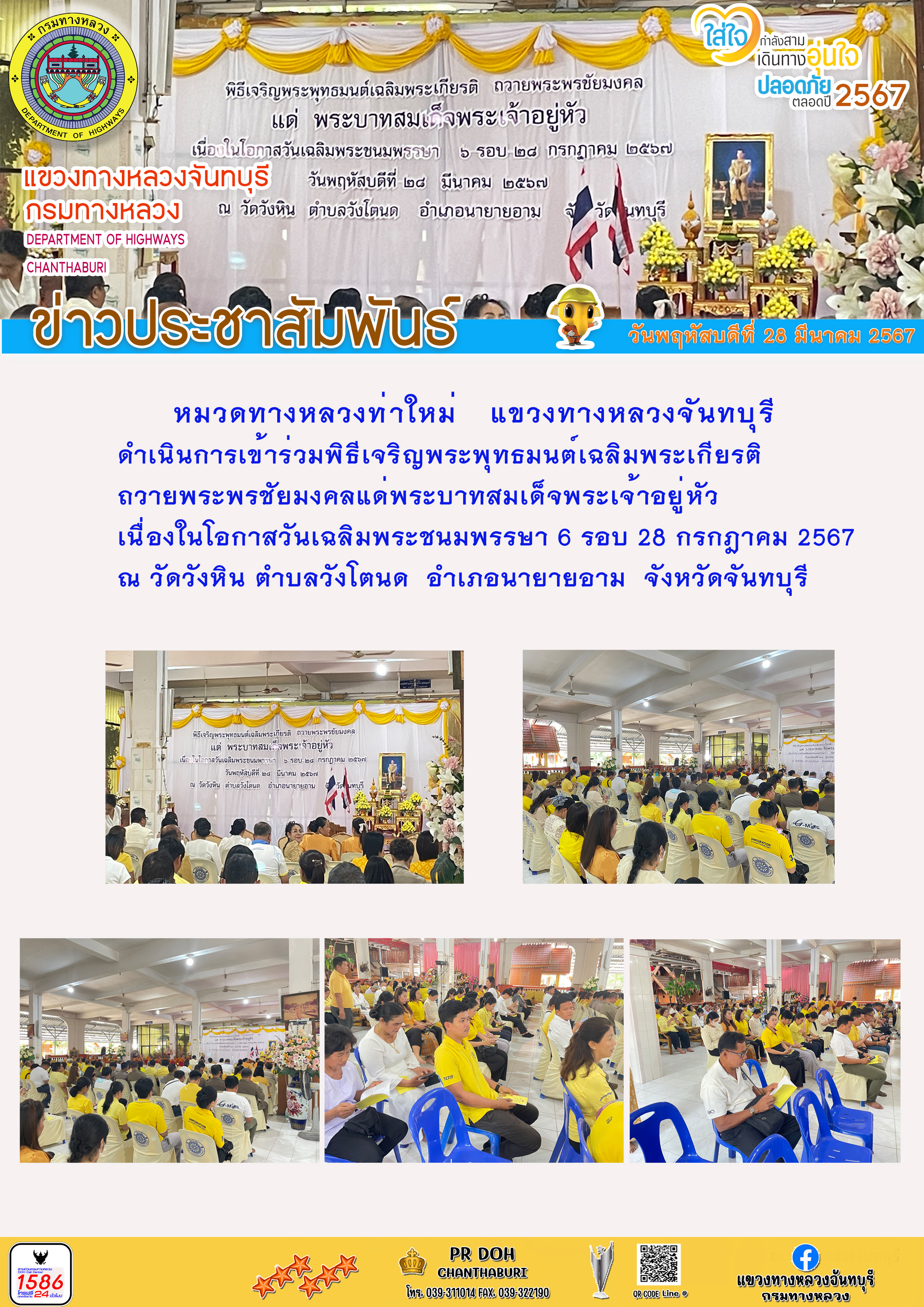 หมวดทางหลวงท่าใหม่ แขวงทางหลวงจันทบุรี ดำเนินการเข้าร่วมเข้าร่วมพิธีเจริญพระพุทธมนต์ เฉลิมพระเกียรติถวายพระพรชัยมงคลแด่พระบาทสมเด็จพระเจ้าอยู่หัว