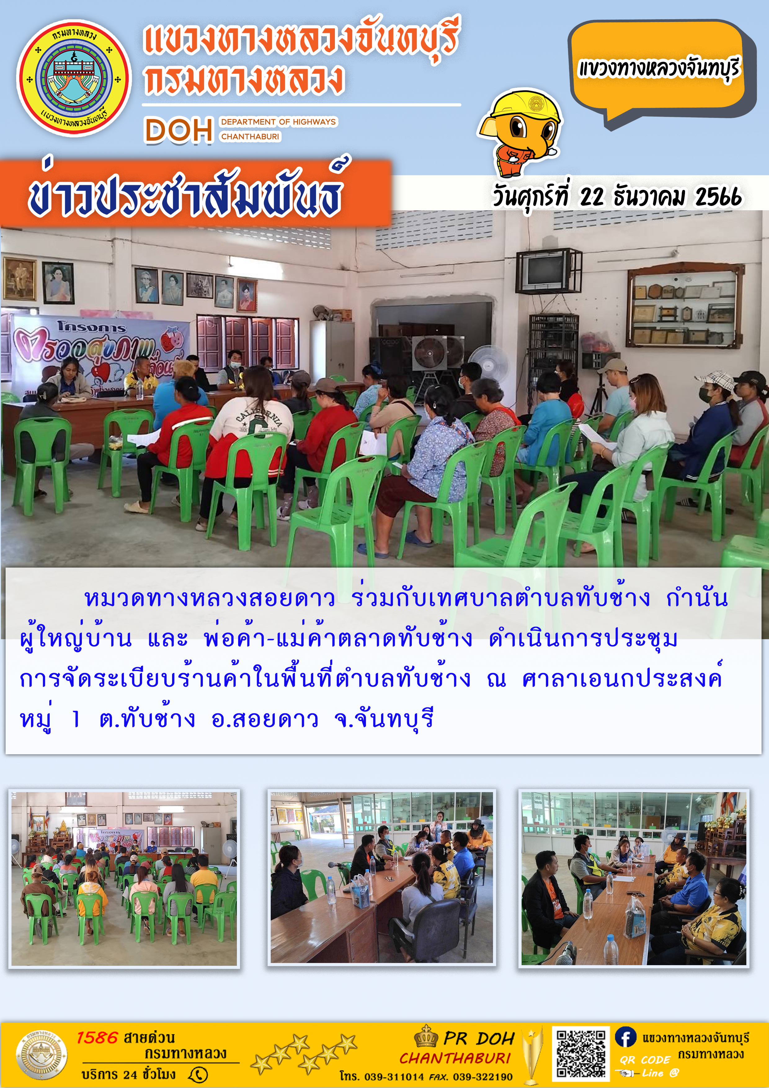 หมวดทางหลวงสอยดาว ร่วมกับเทศบาลตำบลทับช้าง กำนัน ผู้ใหญ่บ้าน และ พ่อค้าแม่ค้า ตลาดทับช้าง จัดระเบียบร้านค้าในพื้นที่ตำบลทับช้าง
