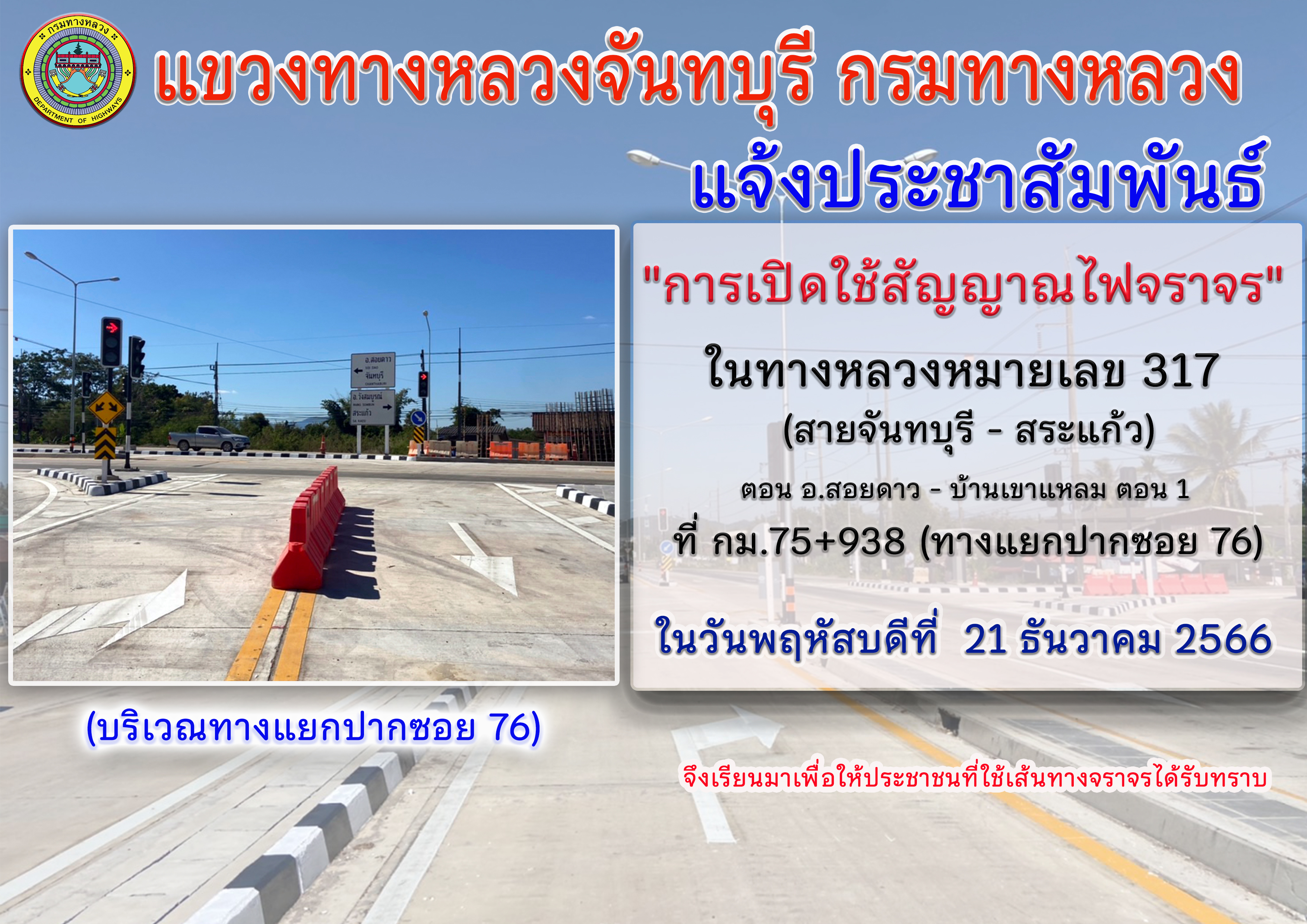การเปิดใช้สัญญาณไฟจราจร ในทางหลวงหมายเลข 317 ตอน อ.สอยดาว - บ้านเขาแหลม ตอน 1 ที่ กม.75+938 ในวันพฤหัสบดีที่ 21 ธันวาคม 2566
