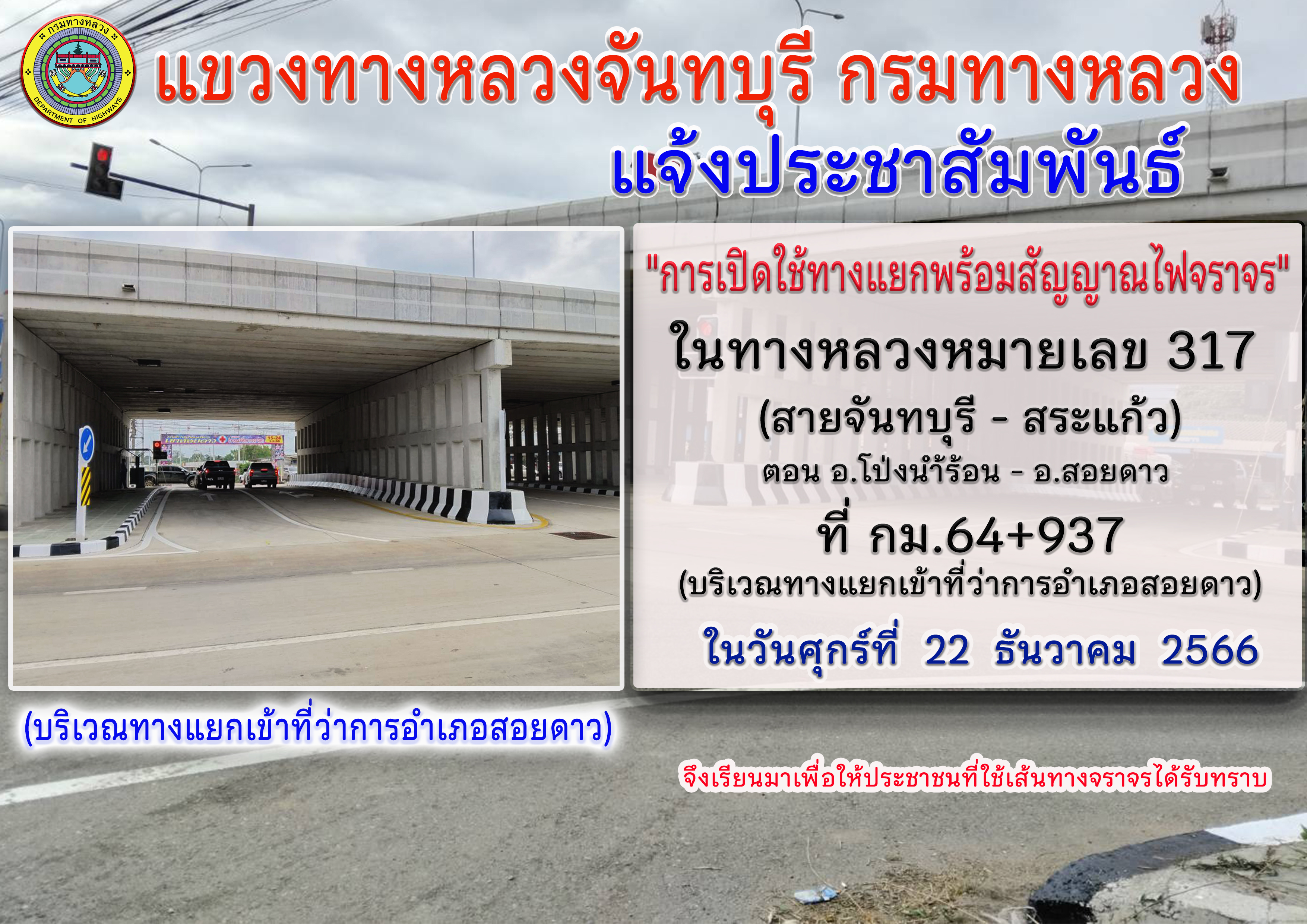 การเปิดใช้ทางแยกพร้อมสัญญาณไฟจราจร ในทางหลวงหมายเลข 317 ตอน อ.โป่งน้ำร้อน - อ.สอยดาว ที่ กม.64+937 ในวันศุกร์ที่ 22 ธันวาคม 2566