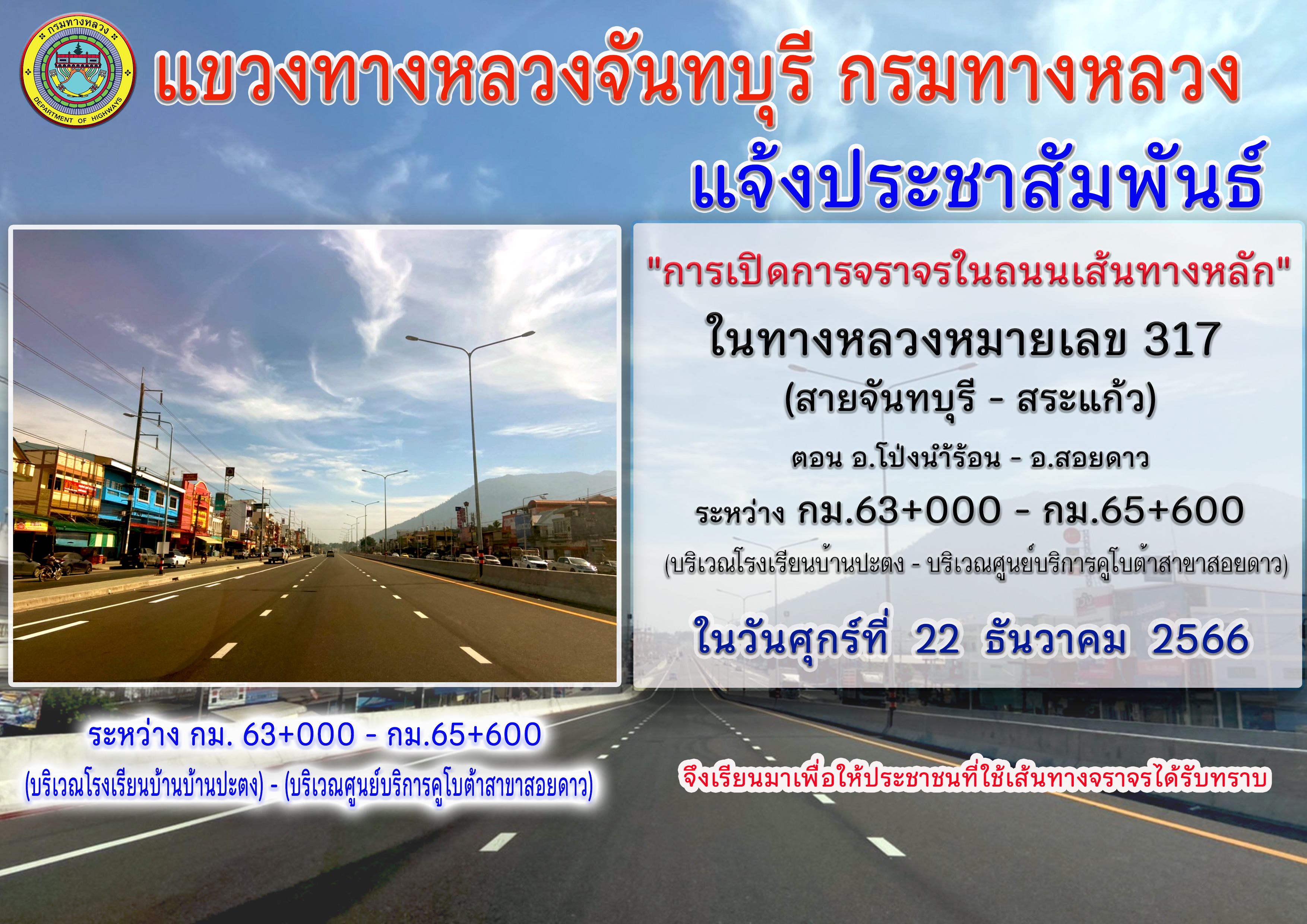 เปิดการจราจรในถนนเส้นทางหลัก Main Road " ในทางหลวงหมายเลข 317 (สายจันทบุรี - สระแก้ว) ตอน อ.โป่งน้ำร้อน - อ.สอยดาว ระหว่าง กม.63+000-กม.65+600 ในวันศุกร์ที่ 22 ธันวาคม 2566