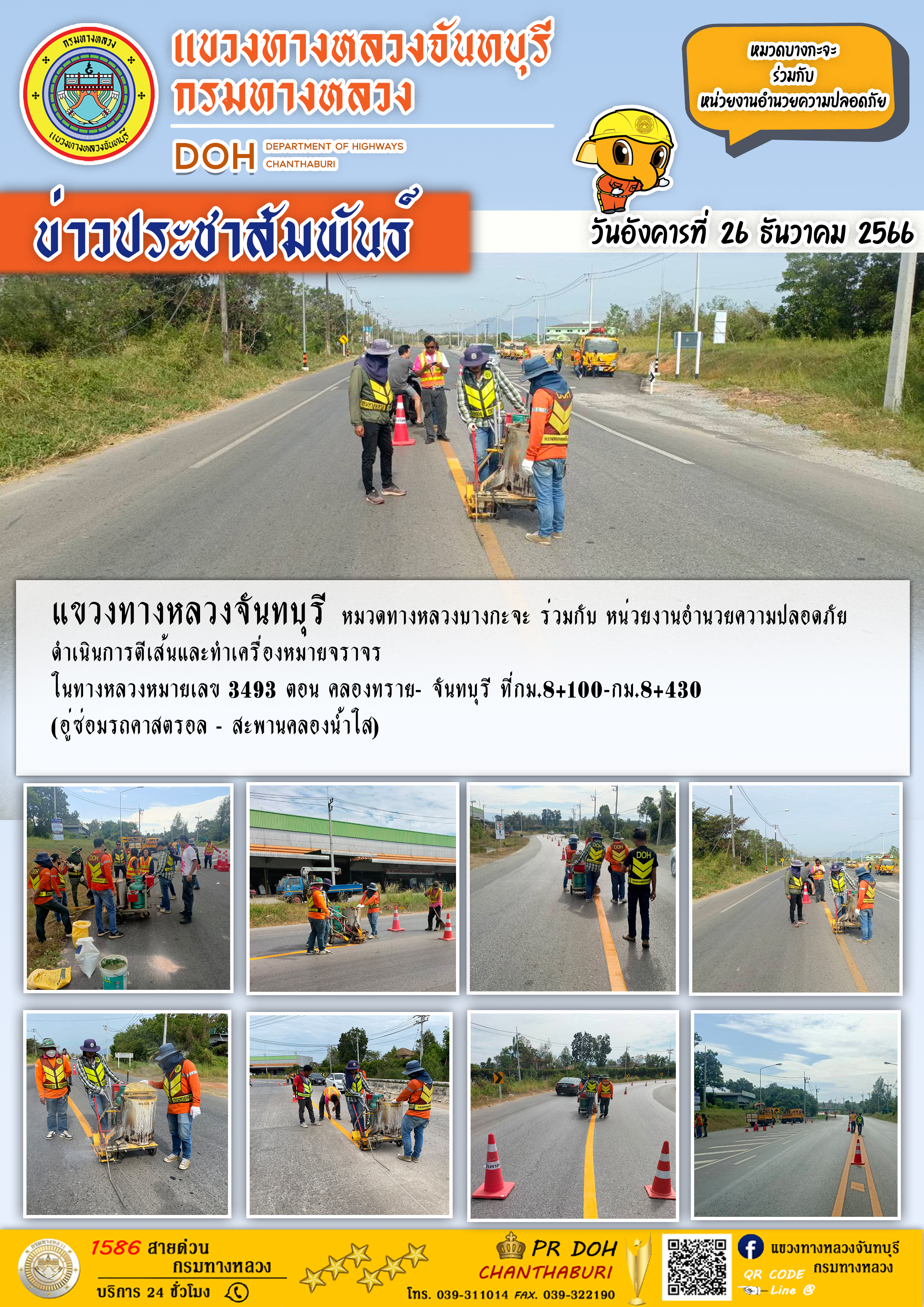 หมวดทางหลวงบางกะจะร่วมกับงานอำนวยความปลอดภัย ดำเนินการตีเส้นจราจร ในทางหลวงหมายเลข 3493 ตอน คลองทราย- จันทบุรี ที่กม.8+100-กม.8+430 (อู่ซ่อมรถคาสตรอล - สะพานคลองน้ำใส)