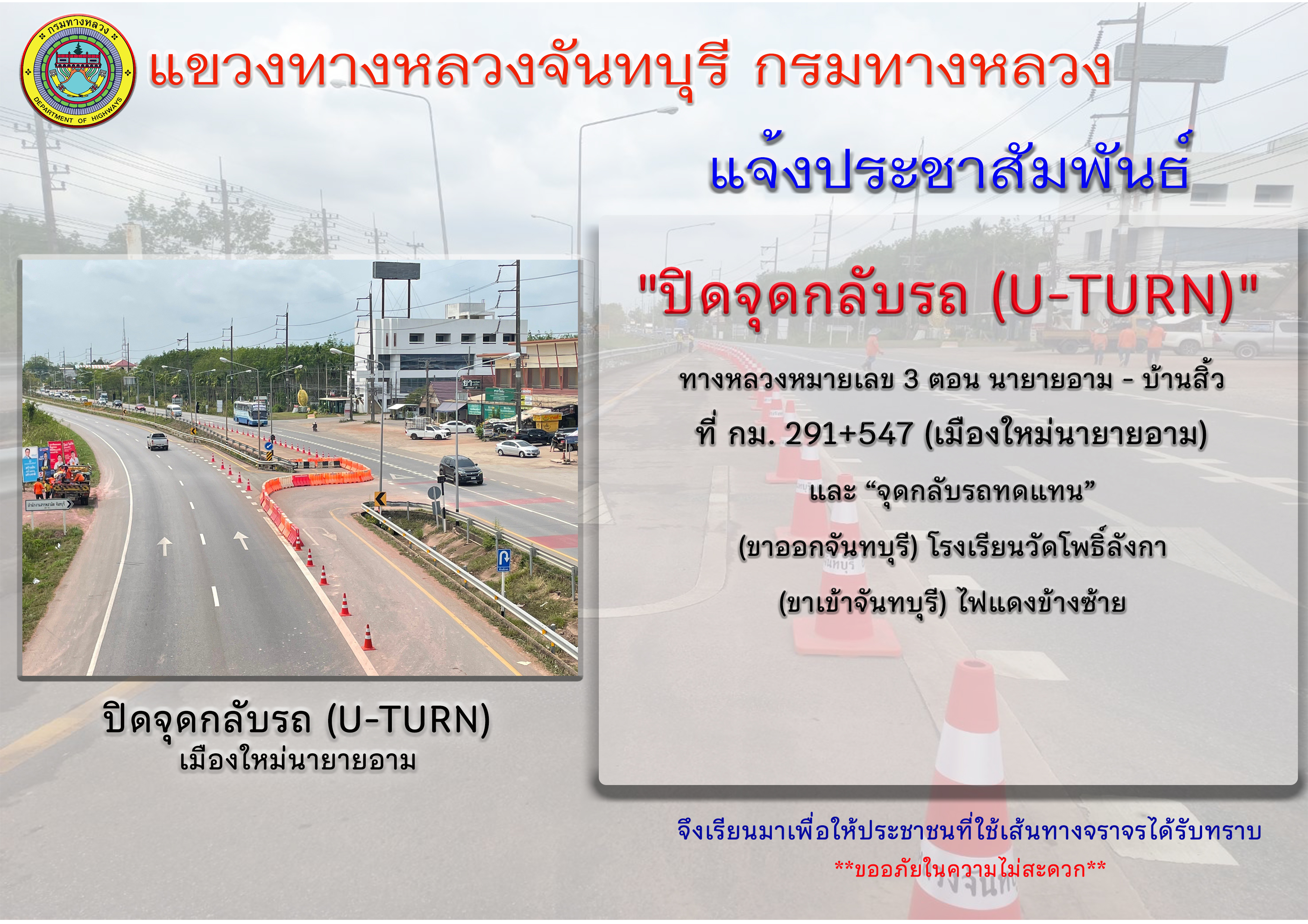 ปิดจุดกลับรถ (U-TURN)" ช่วงเทศกาลปีใหม่ 2567 ระหว่างวันที่ 28 ธันวาคม 2566 - วันที่ 5 มกราคม 2567