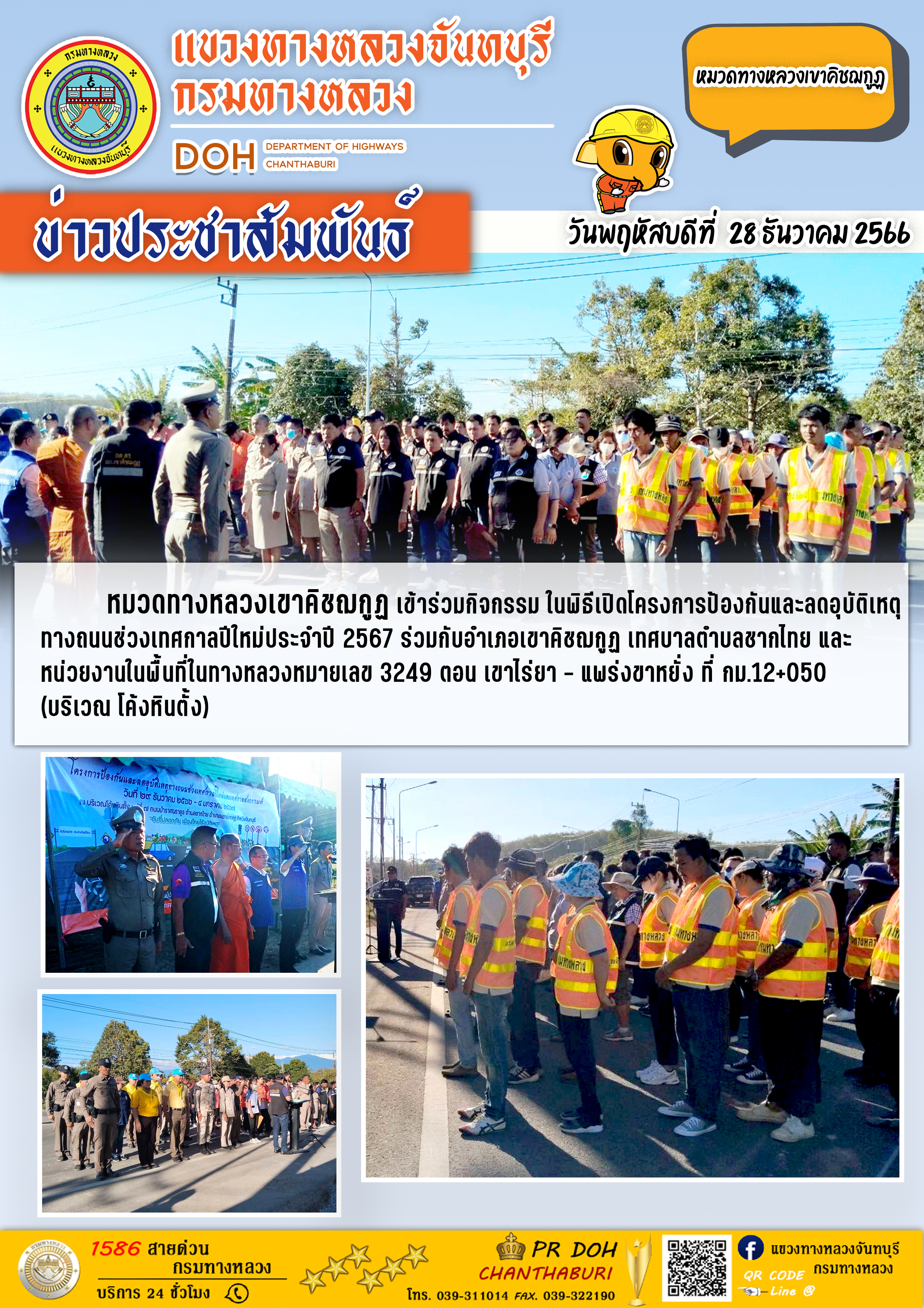 หมวดทางหลวงเขาคิชฌกูฏเข้าร่วมกิจกรรม ในพิธีเปิดโครงการป้องกันและลดอุบัติเหตุทางถนนช่วงเทศกาลปีใหม่ประจำปี 2567
