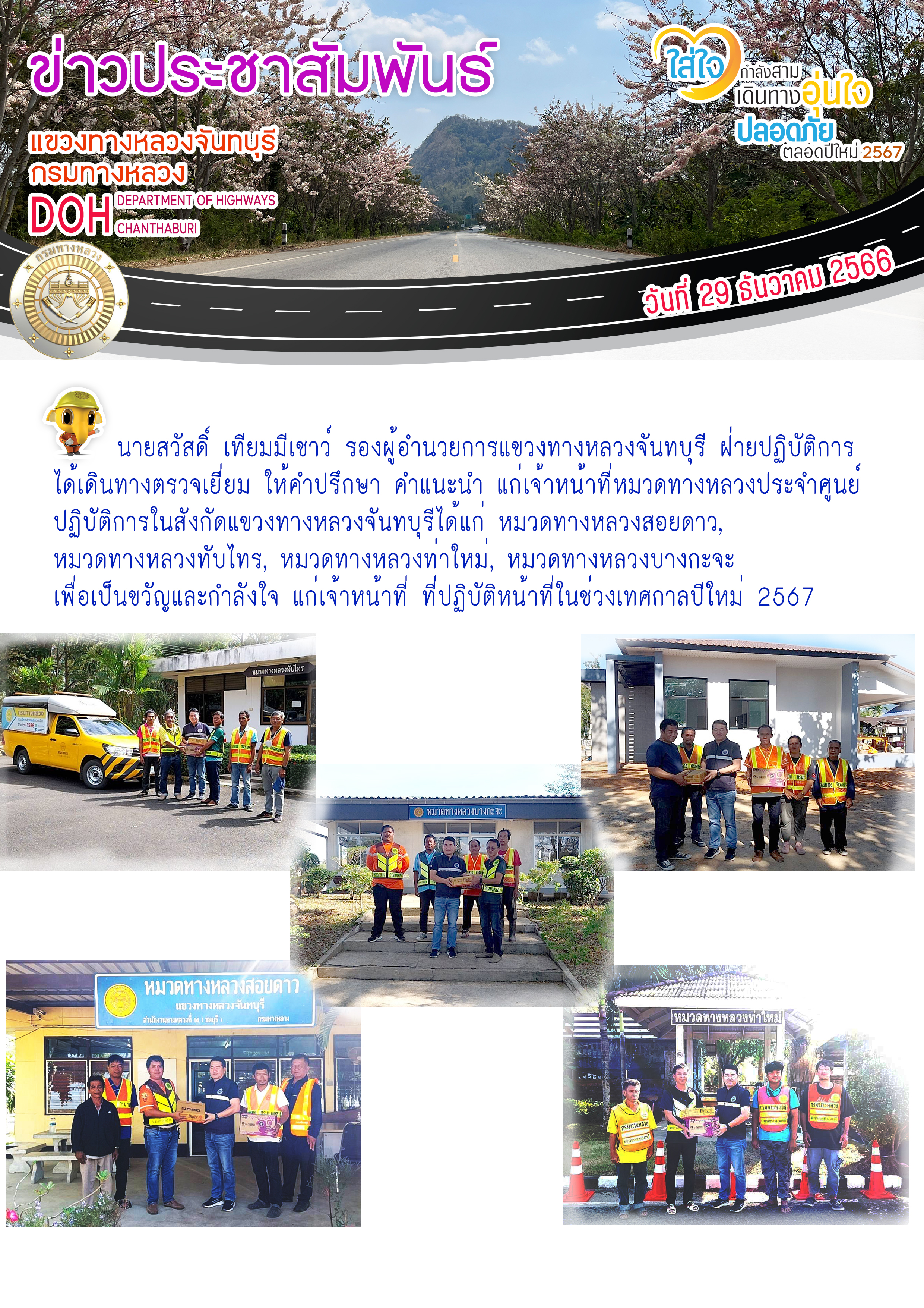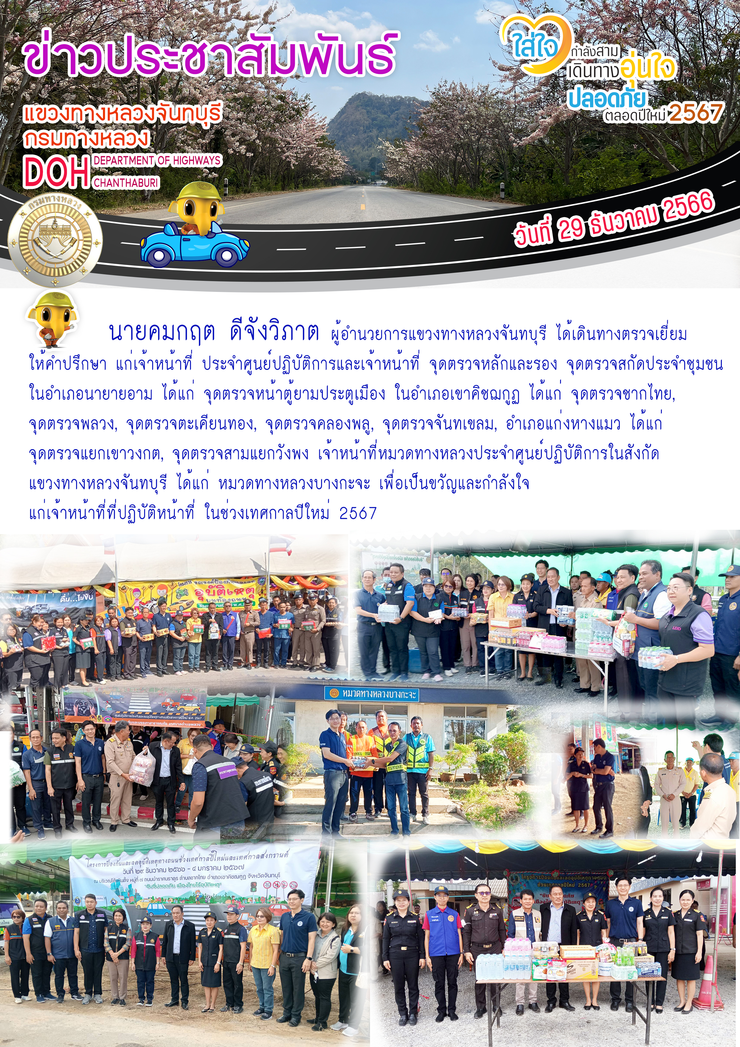 นายสวัสดิ์ เทียมมีเชาว์ รองผู้อำนวยการแขวงทางหลวงจันทบุรี ฝ่ายปฏิบัติการ ได้เดินทางตรวจเยี่ยม ให้คำปรึกษา คำแนะนำ แก่ เจ้าหน้าที่หมวดทางหลวงประจำศูนย์ปฏิบัติการในสังกัด แขวงทางหลวงจันทบุรี เพื่อเป็นขวัญและกำลังใจ แก่เจ้าหน้าที่ ที่ปฏิบัติหน้าที่ ในช่วงเทศกาลปีใหม่ 2567