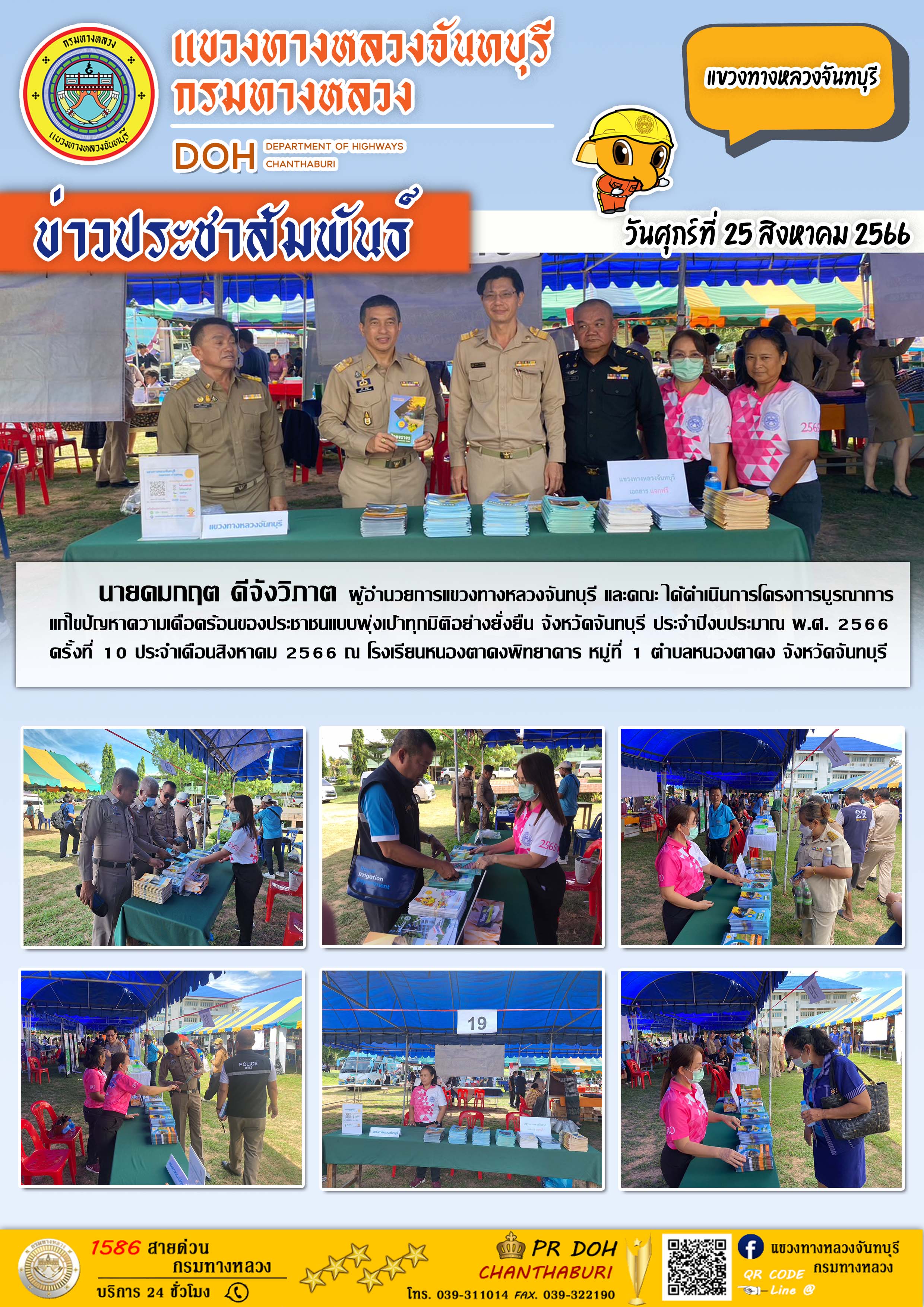 แขวงทางหลวงจันทบุรี ได้ดำเนินการโครงการบูรณาการ แก้ไขปัญหาความเดือดร้อนของประชาชนแบบพุ่งเป้าทุกมิติอย่างยั่งยืน จังหวัดจันทบุรี ประจำปีงบประมาณ พ.ศ. 2566 ครั้งที่ 10 ประจำเดือนสิงหาคม 2566