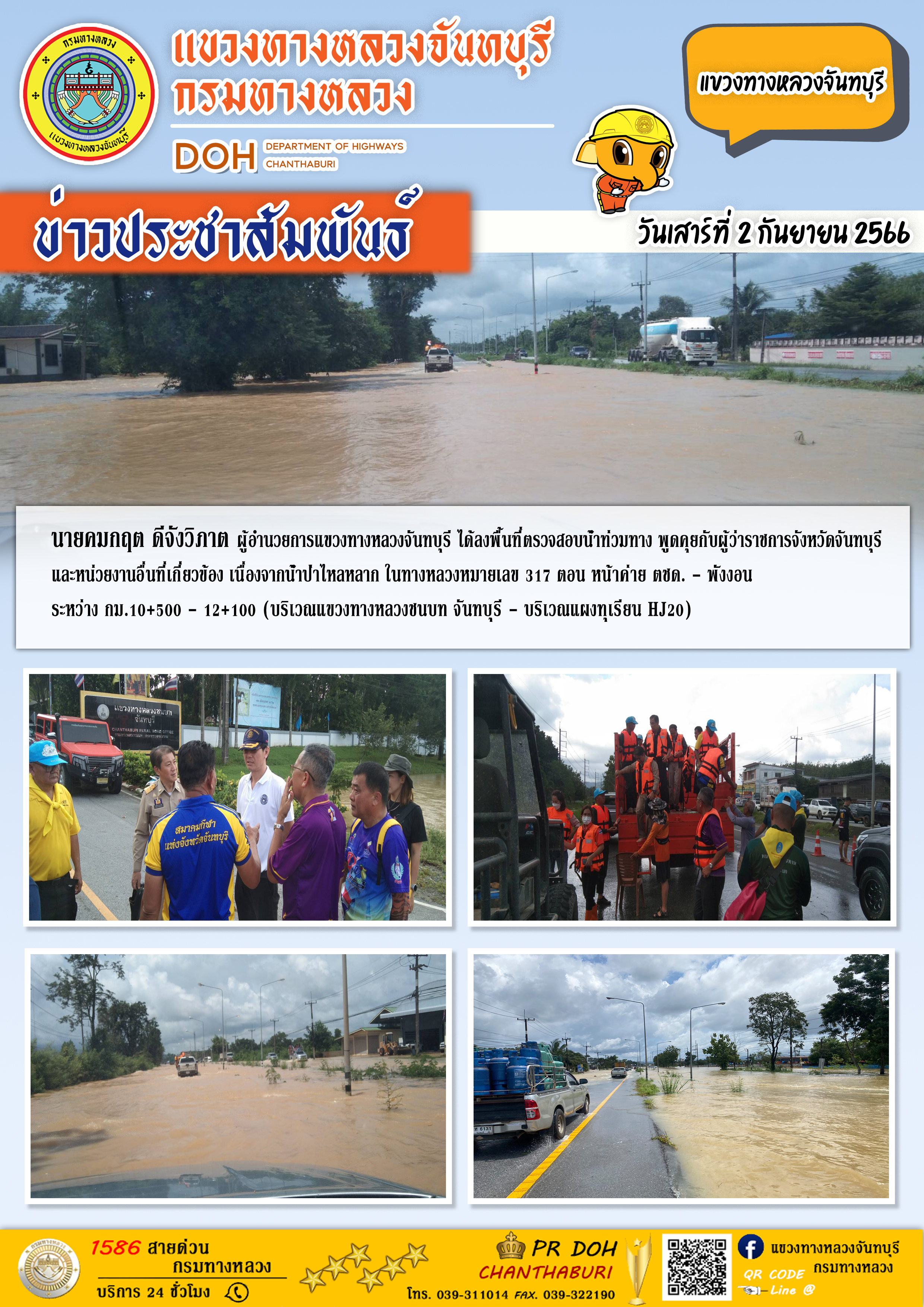 นายคมกฤต ดีจังวิภาต ผู้อำนวยการแขวงทางหลวงจันทบุรี ได้ลงพื้นที่ตรวจสอบน้ำท่วมทาง