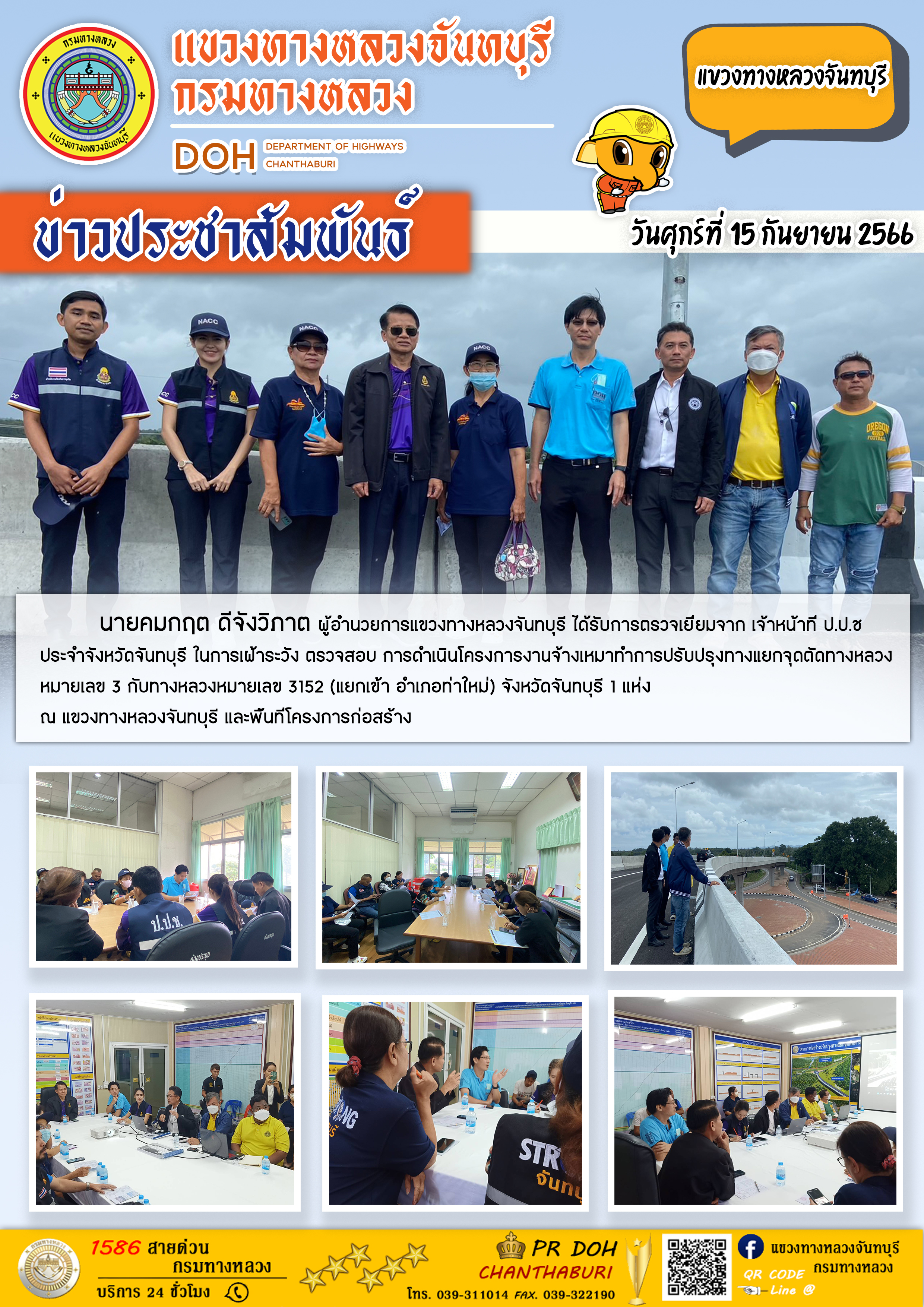 แขวงทางหลวงจันทบุรี ได้รับการตรวจเยี่ยมจาก เจ้าหน้าที่ ป.ป.ช ประจำจังหวัดจันทบุรี ในการเฝ้าระวัง ตรวจสอบ การดำเนินโครงการงานจ้างเหมาทำการปรับปรุงทางแยกจุดตัดทางหลวงหมายเลข 3 กับทางหลวงหมายเลข 3152 (แยกเข้า อำเภอท่าใหม่) จังหวัดจันทบุรี 1 แห่ง