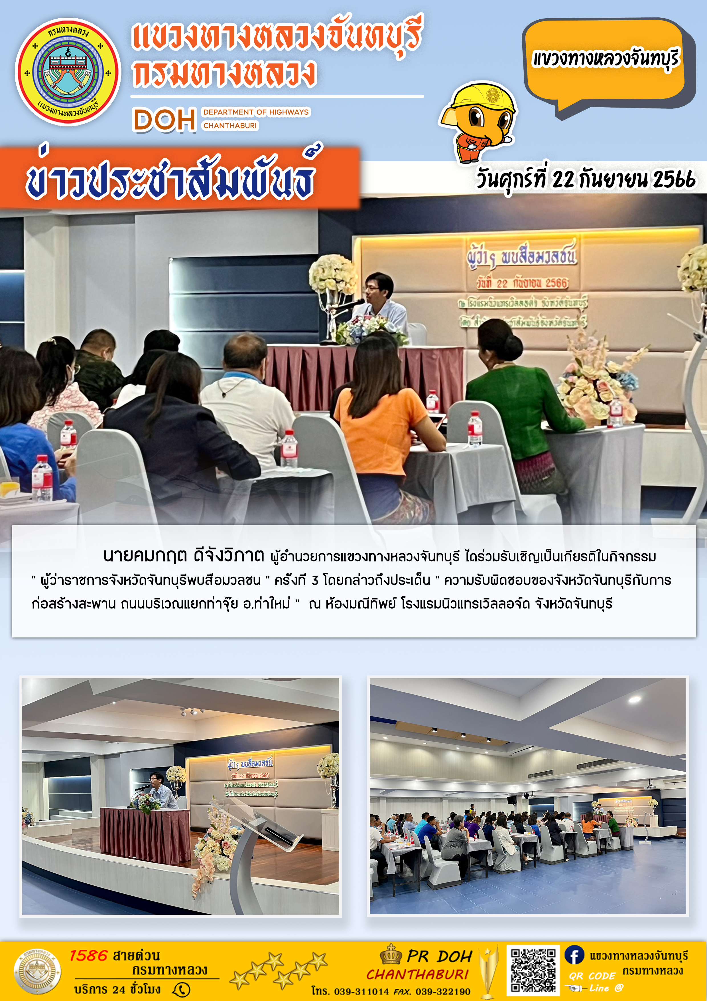นายคมกฤต ดีจังวิภาต ผู้อำนวยการแขวงทางหลวงจันทบุรี ไดร่วมรับเชิญเป็นเกียรติในกิจกรรม " ผู้ว่าราชการจังหวัดจันทบุรีพบสื่อมวลชน " ครั้งที่ 3