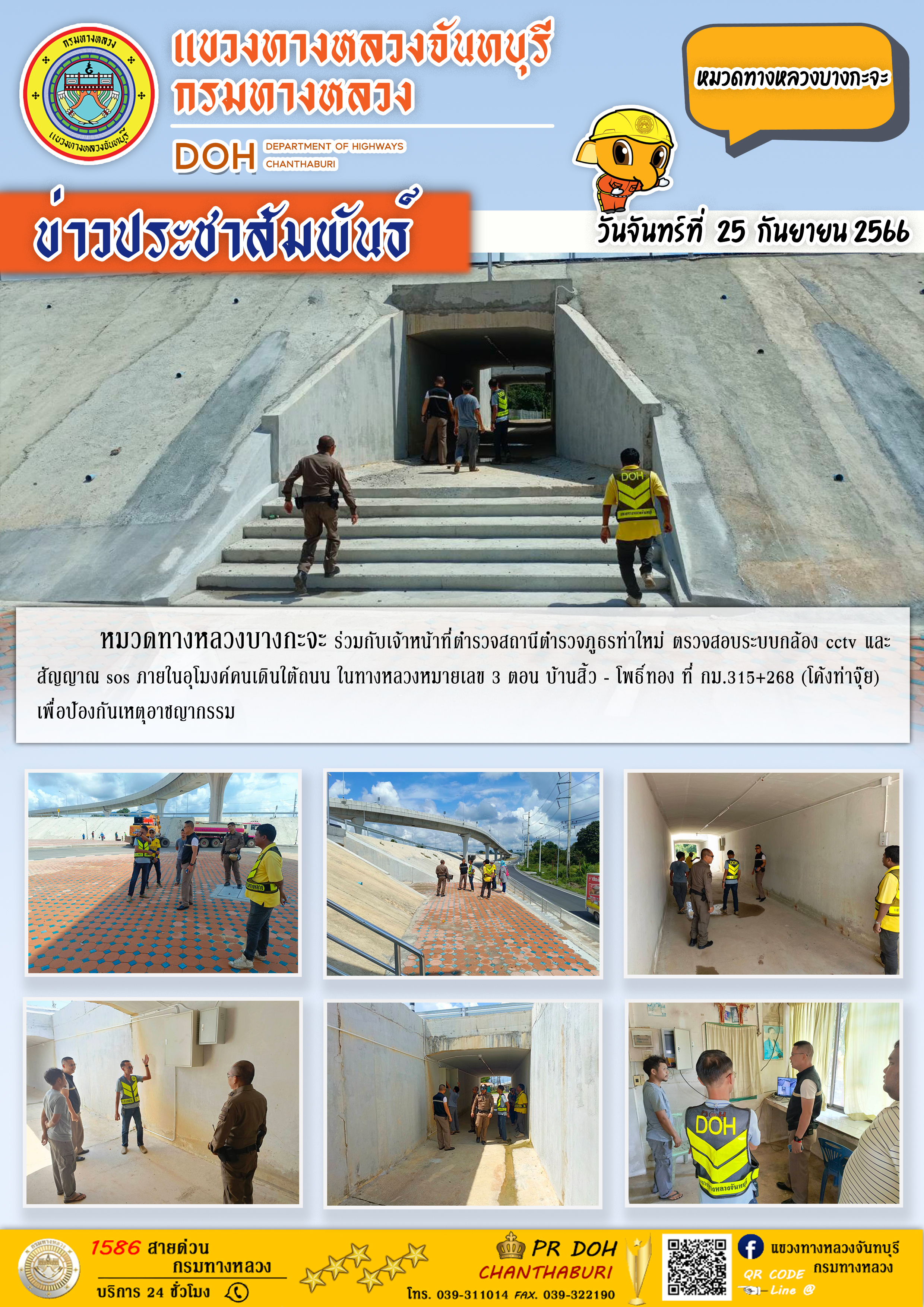 แขวงทางหลวงจันทบุรี โดยหมวดทางหลวงบางกะจะ ร่วมกับเจ้าหน้าที่ตำรวจสถานีตำรวจภูธรท่าใหม่ ตรวจสอบระบบกล้อง cctv และสัญญาณ sos ภายในอุโมงค์คนเดินใต้ถนน