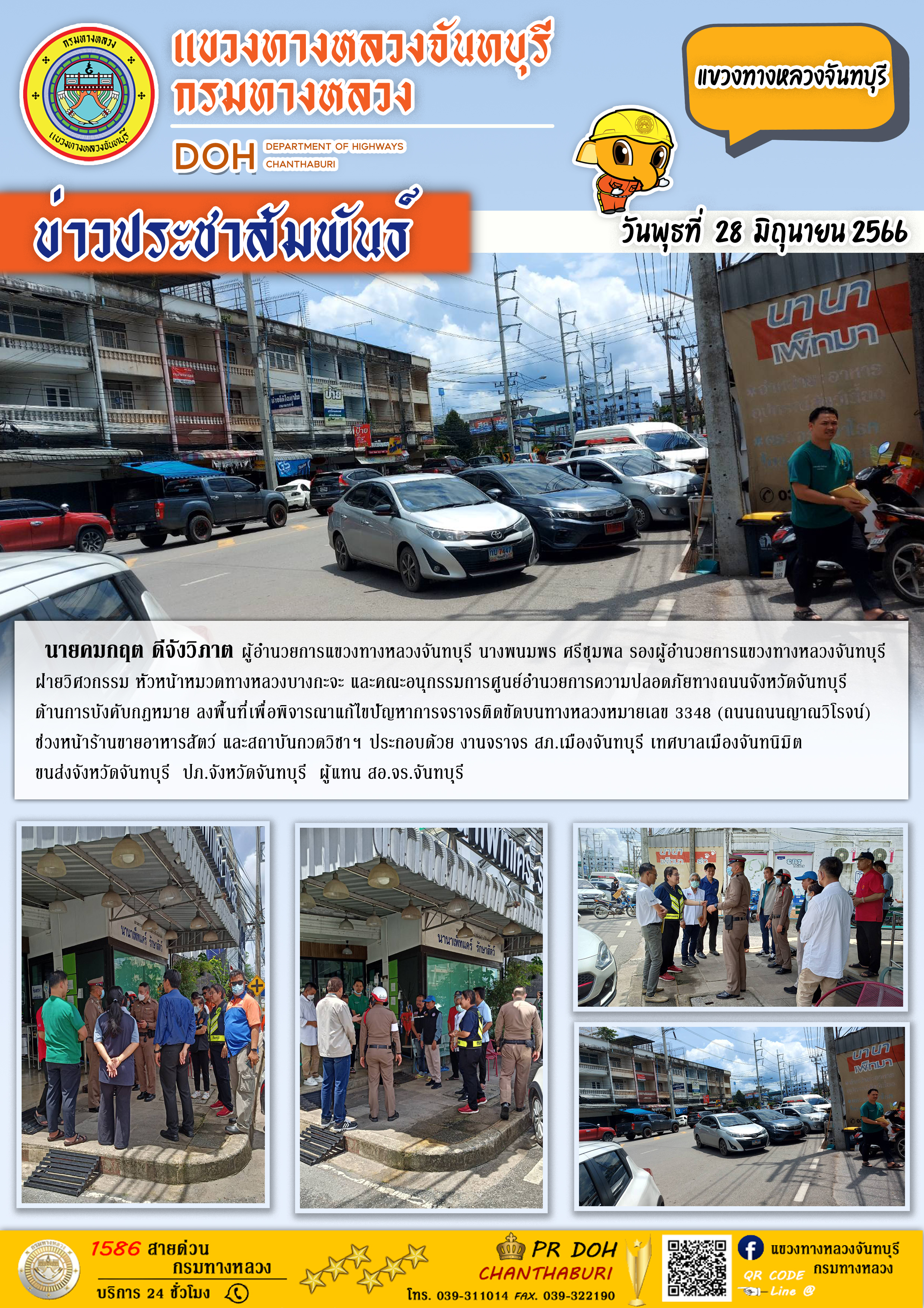 255 29/06/2566 แขวงทางหลวงจันทบุรี ลงพื้นที่เพื่อพิจารณาแก้ไขปัญหาการจราจรติดขัดบนทางหลวงหมายเลข 3348 (ถนนถนนญาณวิโรจน์) ช่วงหน้าร้านขายอาหารสัตว์ และสถาบันกวดวิชาฯ