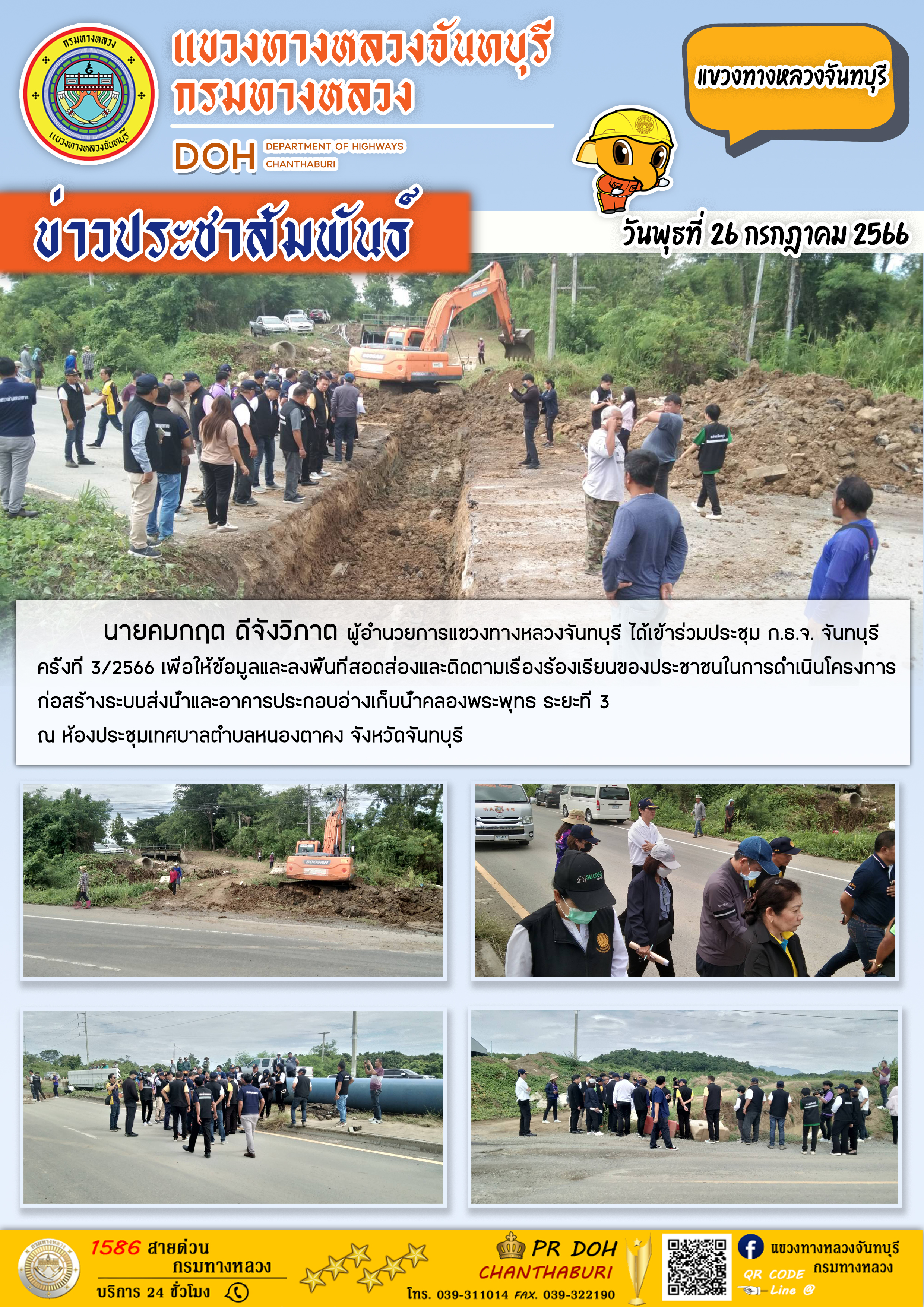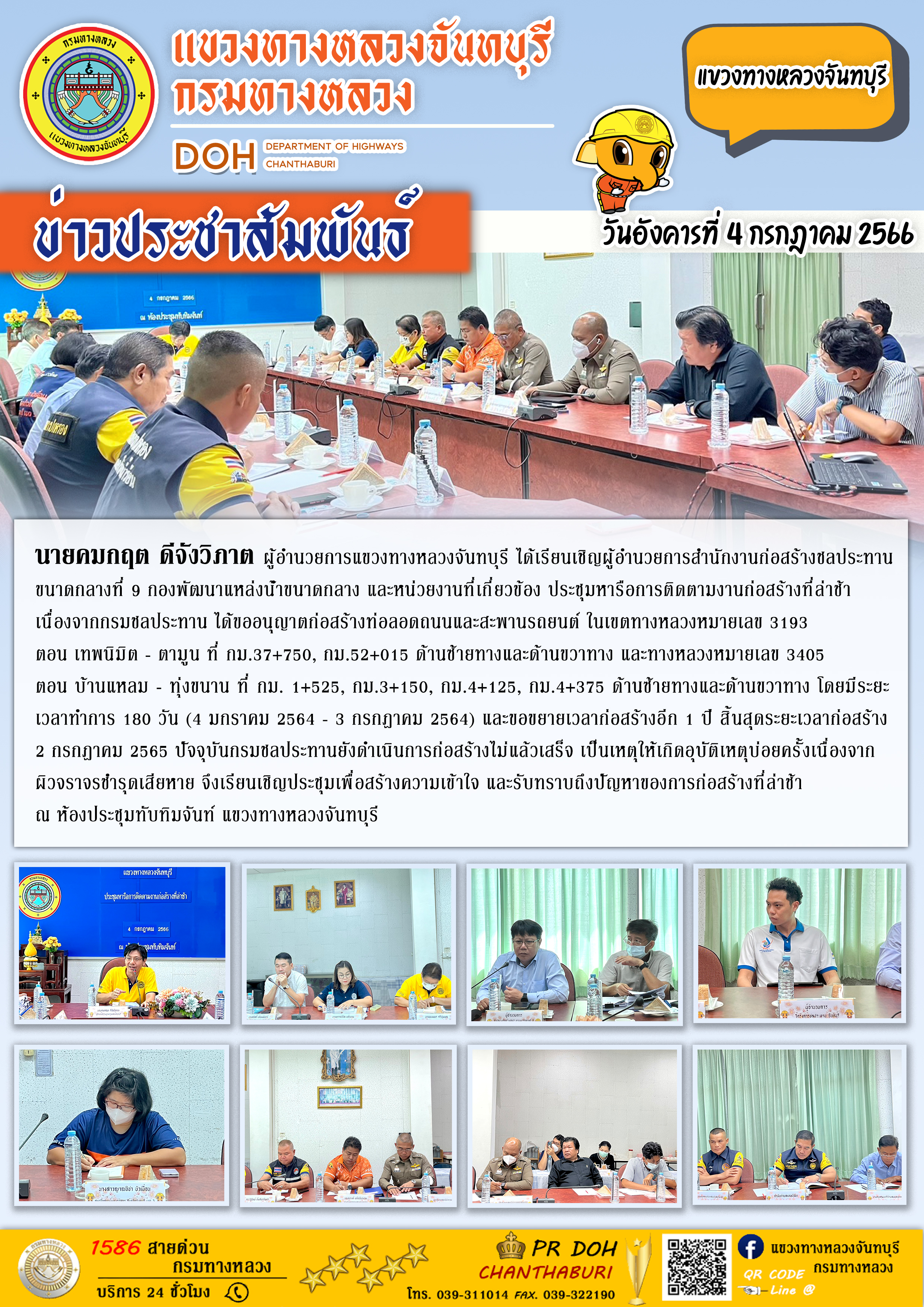 253 04/07/2566 ผู้อำนวยการแขวงทางหลวงจันทบุรี ได้เรียนเชิญผู้อำนวยการสำนักงานก่อสร้างชลประทานขนาดกลางที่ 9 กองพัฒนาแหล่งน้ำขนาดกลาง และหน่วยงานที่เกี่ยวข้อง ประชุมหารือการติดตามงานก่อสร้างที่ล่าช้า