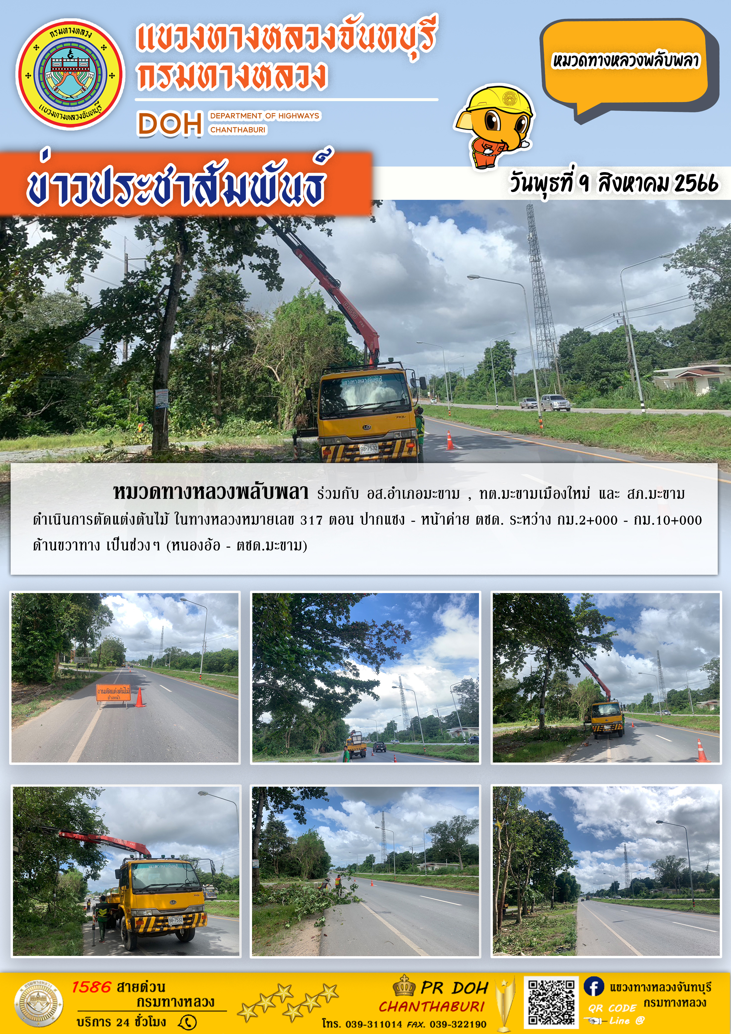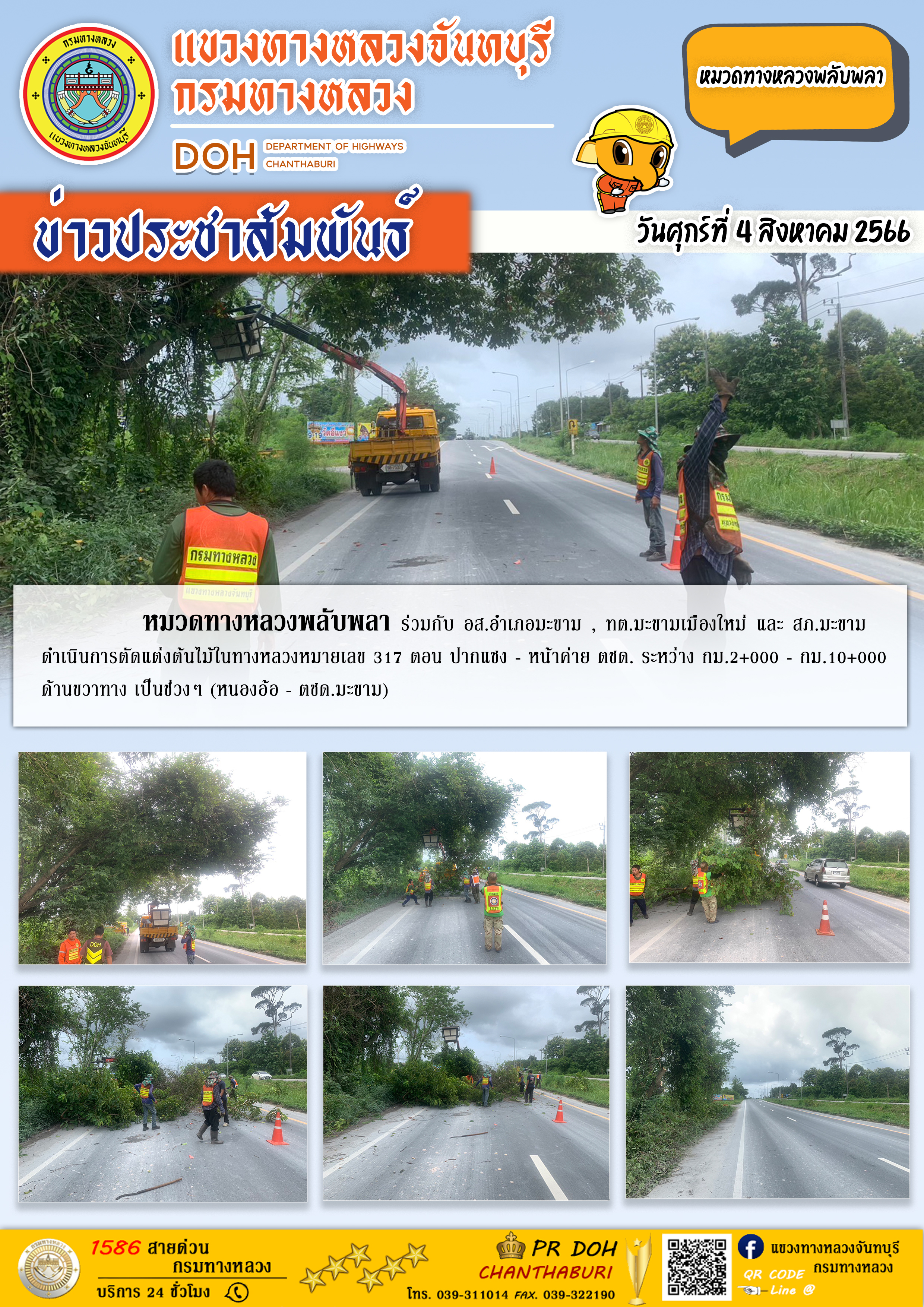 248 04/08/2566 หมวดทางหลวงพลับพลาดำเนินการตัดแต่งต้นไม้ ร่วมกับ อส.อำเภอมะขาม , ทต.มะขามเมืองใหม่ และ สภ.มะขาม