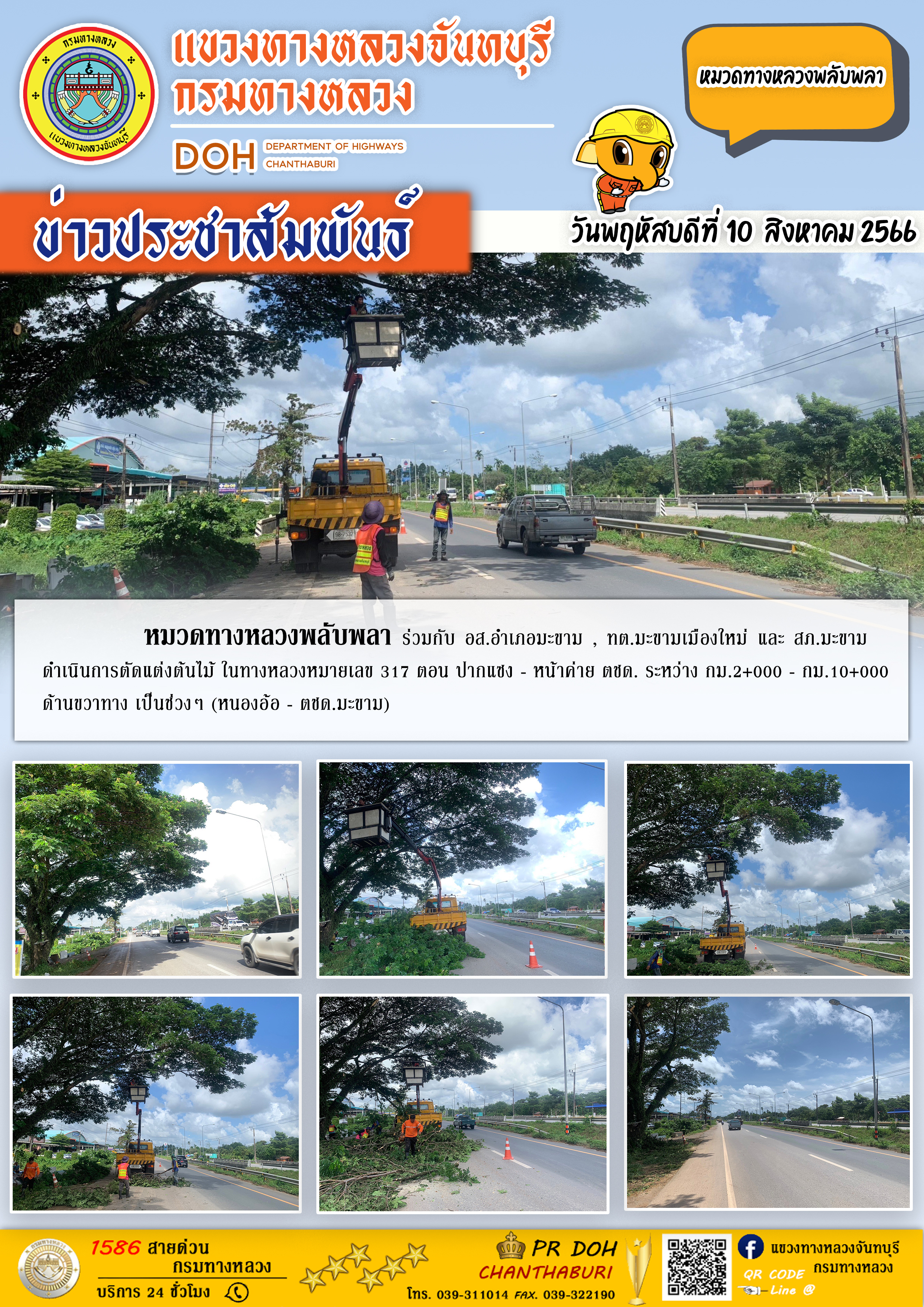 242 10/08/2566 หมวดทางหลวงพลับพลา ร่วมกับ อส.อำเภอมะขาม , ทต.มะขามเมืองใหม่ และ สภ.มะขาม ดำเนินการตัดแต่งต้นไม้