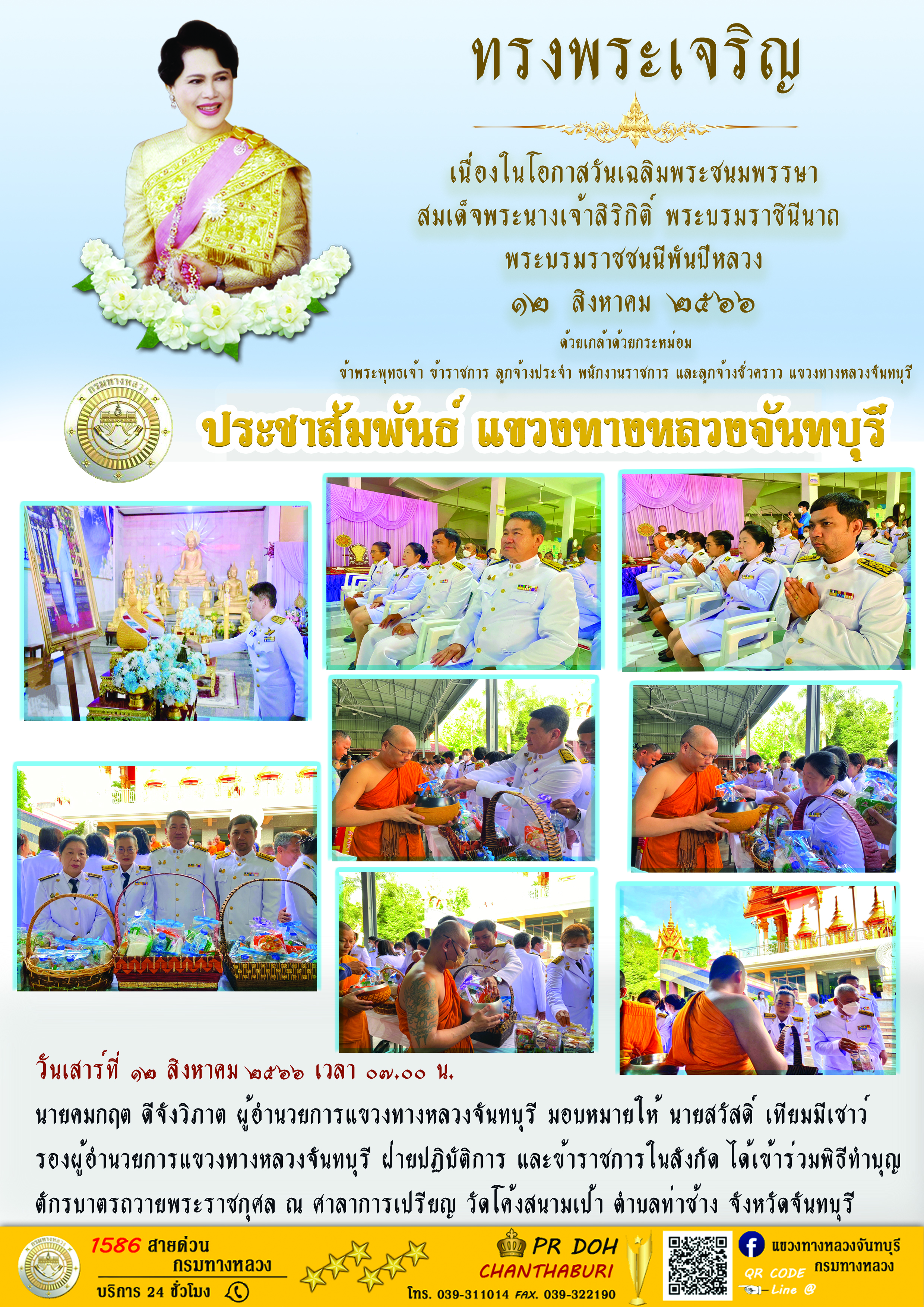 241 12/08/2566 แขวงทางหลวงจันทบุรี ได้เข้าร่วมพิธีถวายเครื่องราชสักการะและวางพานพุ่ม และพิธีจุดเทียนถวายพระพรชัยมงคล