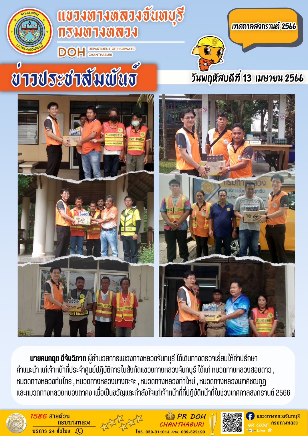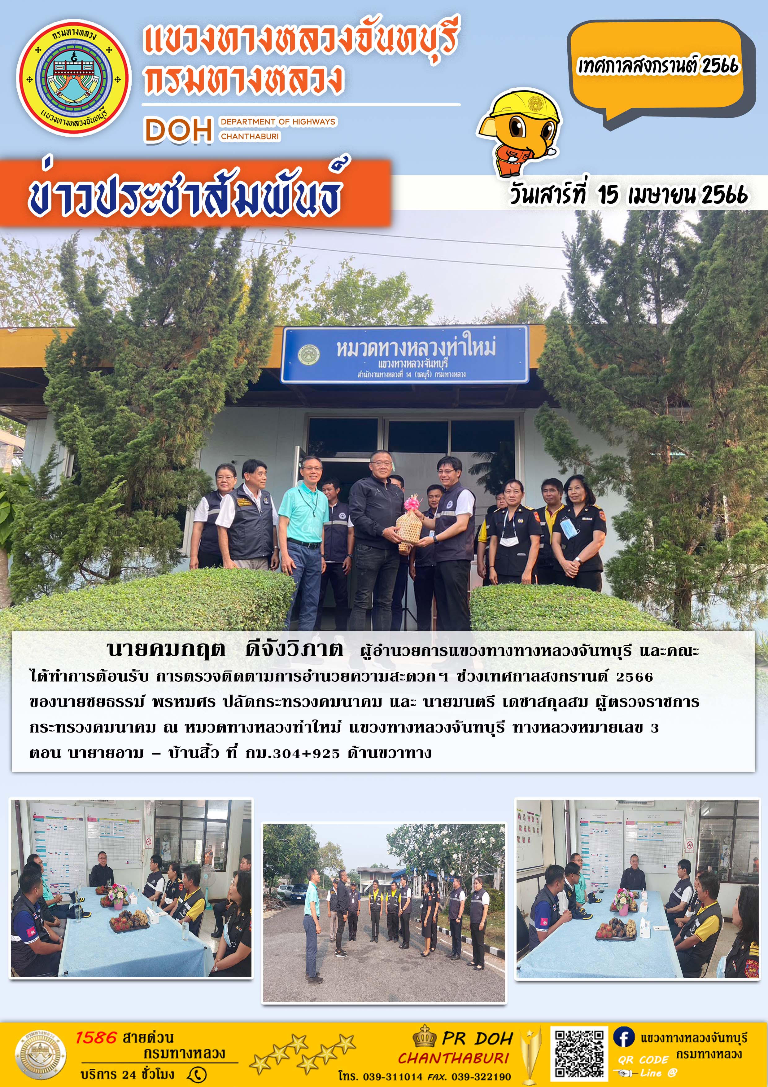 แขวงทางทางหลวงจันทบุรี และคณะ ได้ทำการต้อนรับ การตรวจติดตามการอำนวยความสะดวกฯ ช่วงเทศกาลสงกรานต์ 2566 ของนายชยธรรม์ พรหมศร ปลัดกระทรวงคมนาคม และ นายมนตรี เดชาสกุลสม ผู้ตรวจราชการกระทรวงคมนาคม