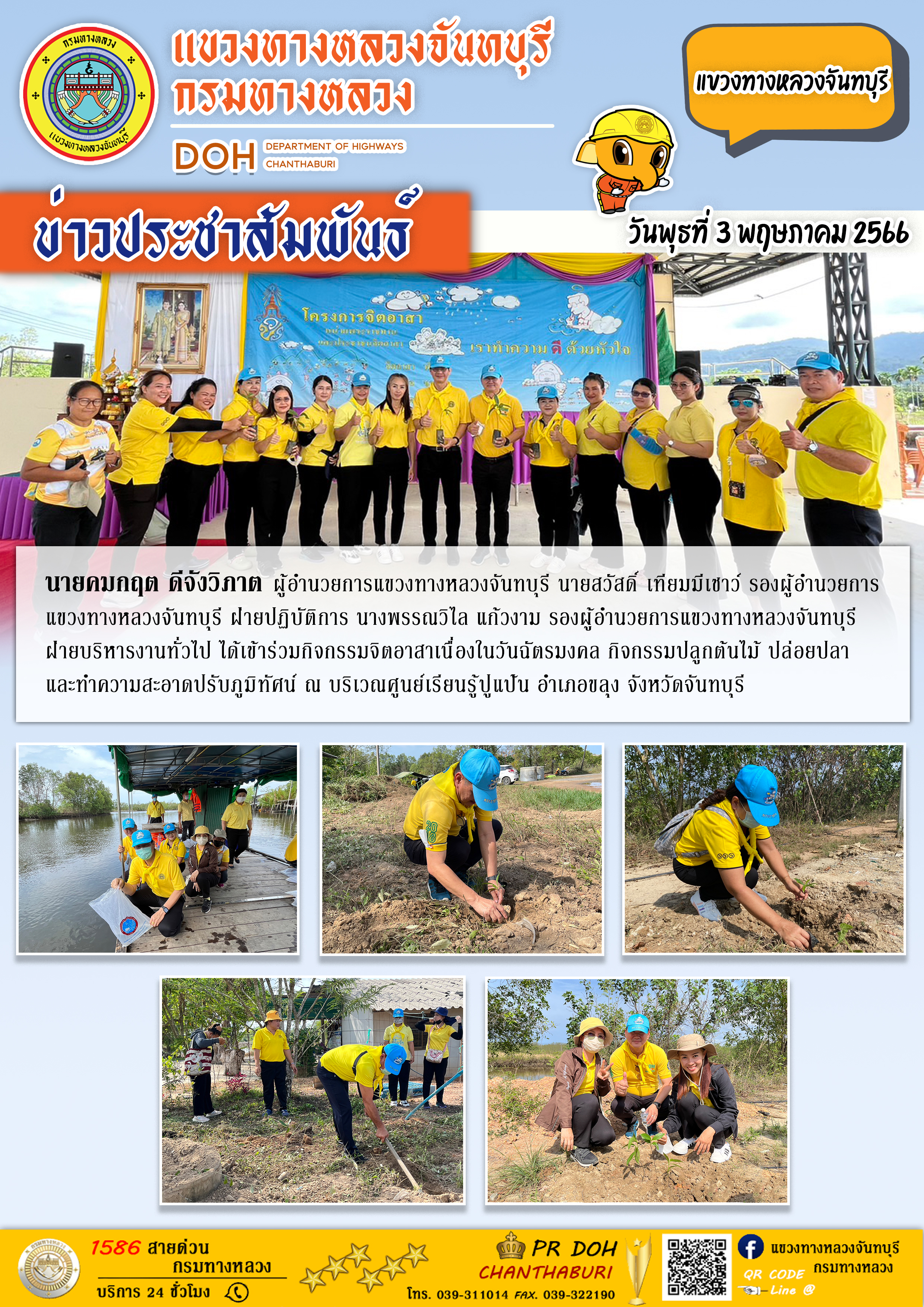 แขวงทางหลวงจันทบุรี ได้เข้าร่วมกิจกรรมจิตอาสาเนื่องในวันฉัตรมงคล กิจกรรมปลูกต้นไม้ ปล่อยปลา และทำความสะอาดปรับภูมิทัศน์
