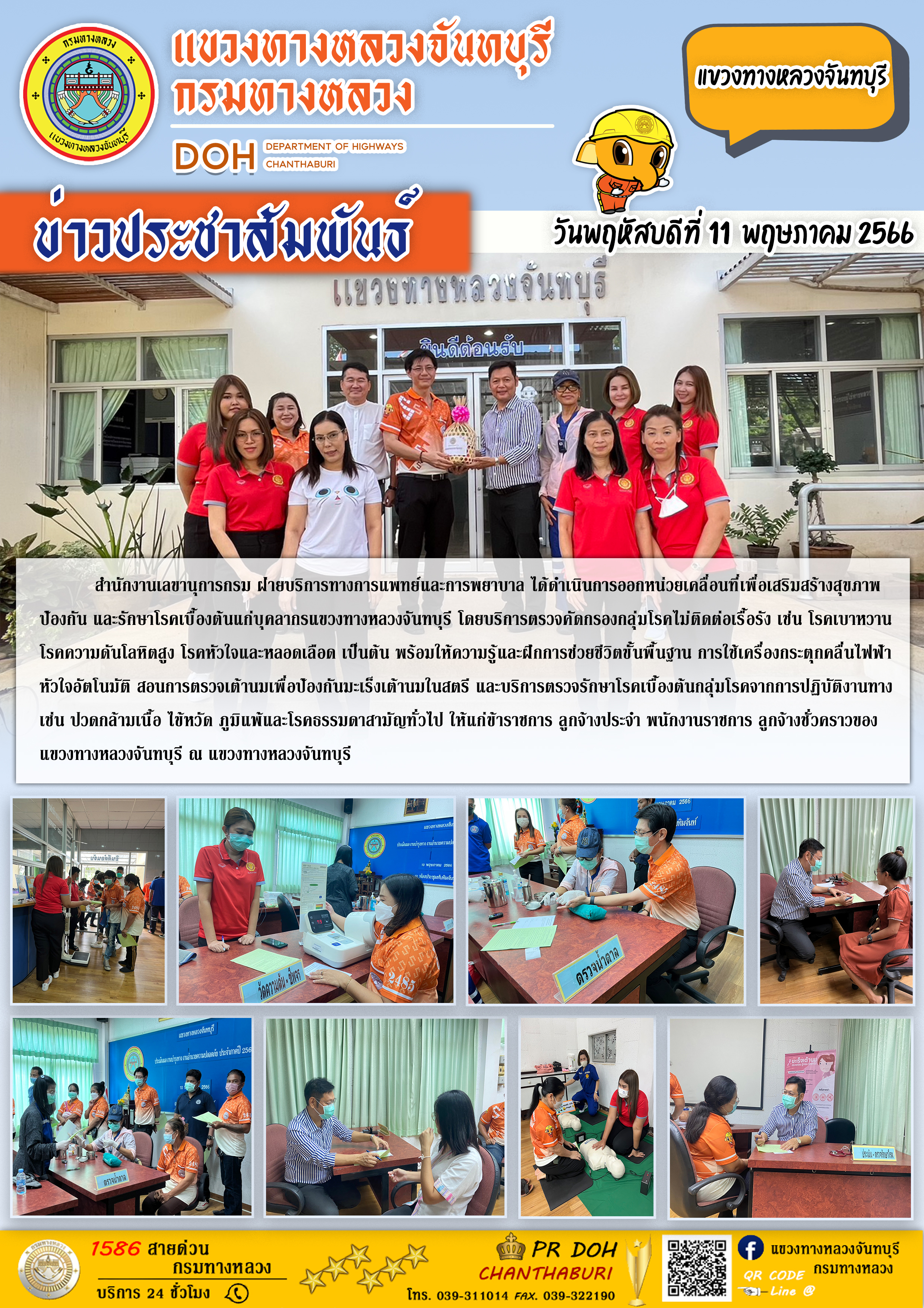 สำนักงานเลขานุการกรม ฝ่ายบริการทางการแพทย์และการพยาบาล ได้ดำเนินการออกหน่วยเคลื่อนที่เพื่อเสริมสร้างสุขภาพ ป้องกัน และรักษาโรคเบื้องต้นแก่บุคลากรแขวงทางหลวงจันทบุรี