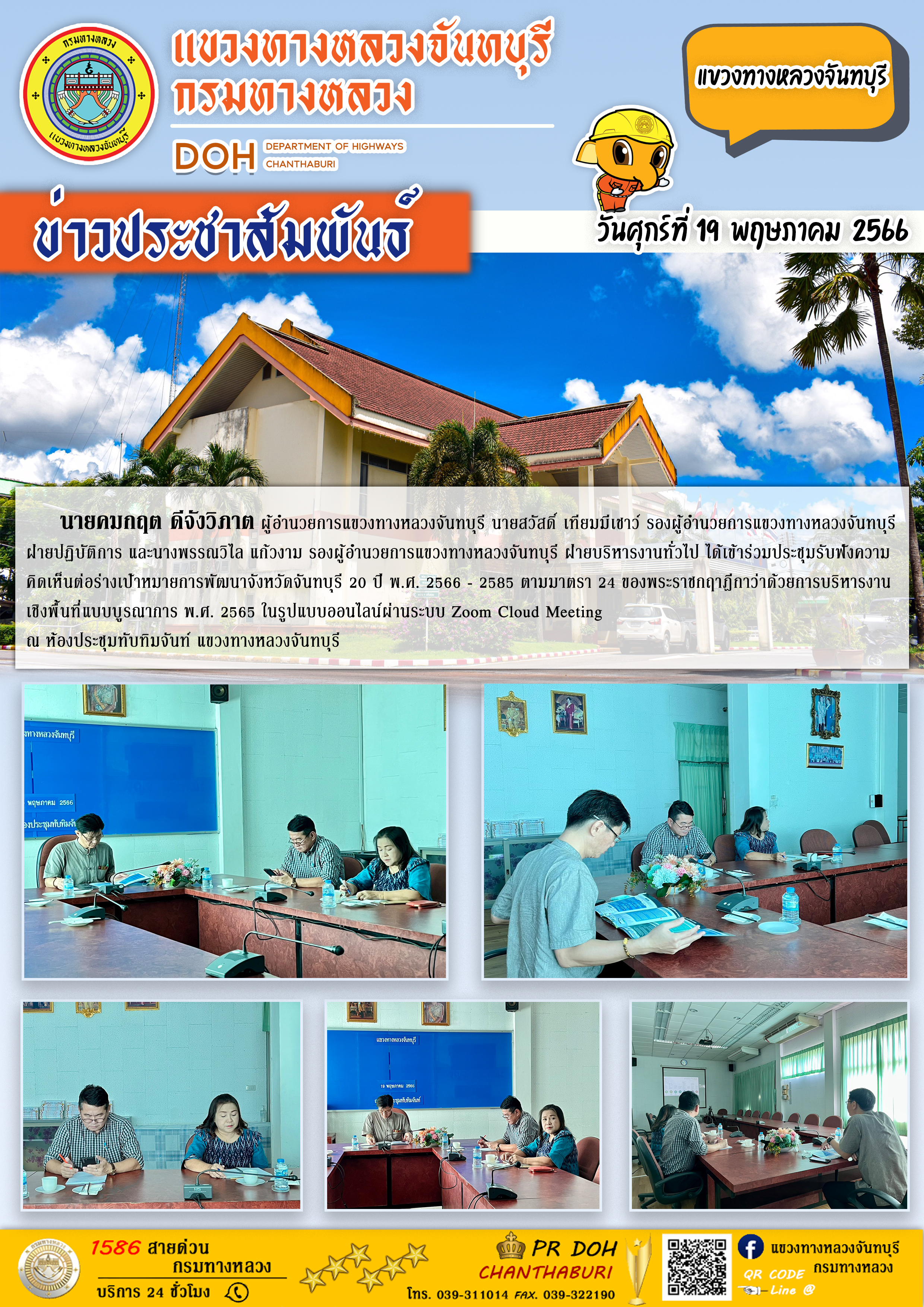 แขวงทางหลวงจันทบุรี ได้เข้าร่วมประชุมรับฟังความคิดเห็นต่อร่างเป้าหมายการพัฒนาจังหวัดจันทบุรี 20 ปี พ.ศ. 2566 - 2585 ตามมาตรา 24 ของพระราชกฤาฎีกาว่าด้วยการบริหารงานเชิงพื้นที่แบบบูรณาการ พ.ศ. 2565