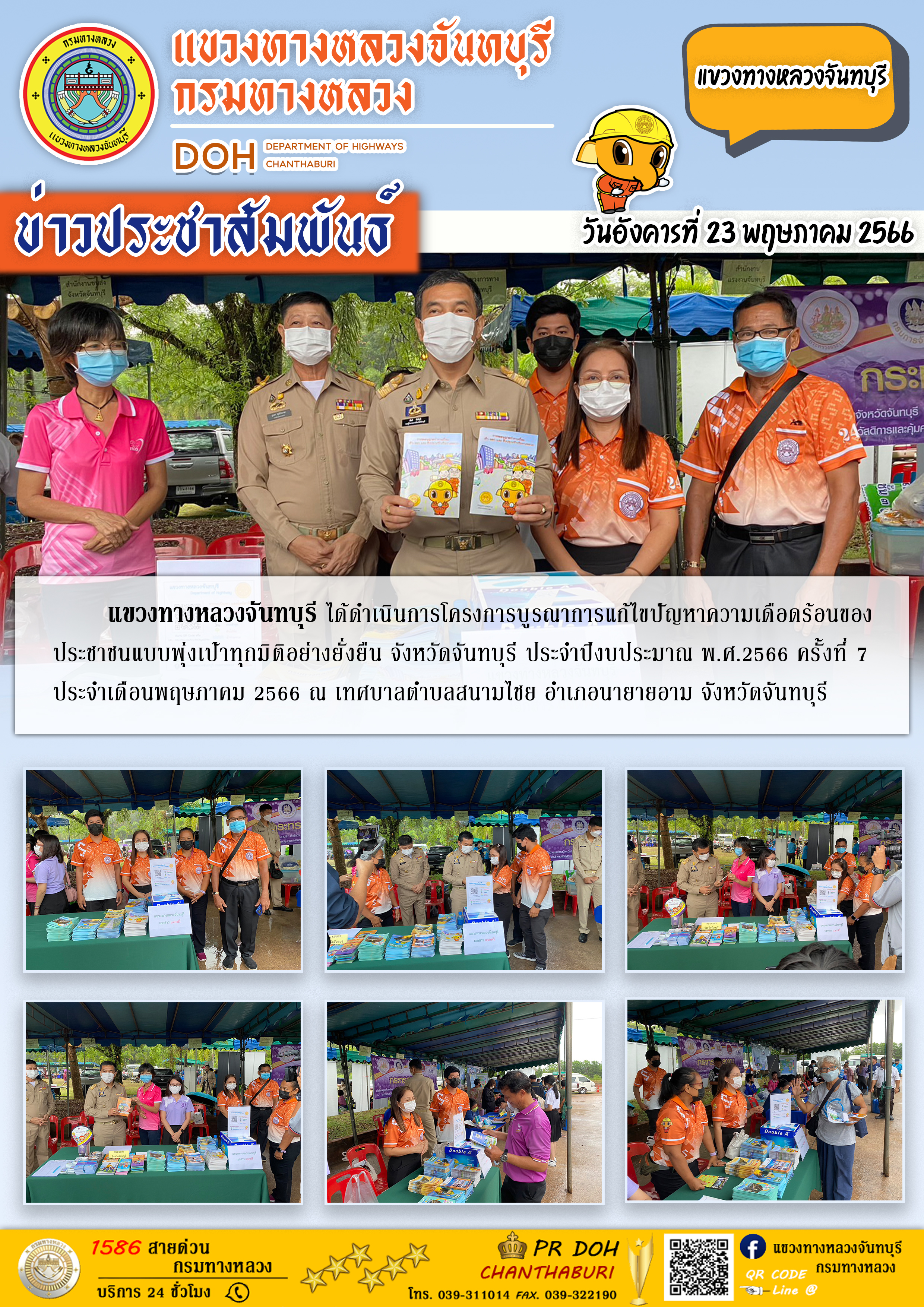 แขวงทางหลวงจันทบุรี ได้ดำเนินการโครงการบูรณาการแก้ไขปัญหาความเดือดร้อนของประชาชนแบบพุ่งเป้าทุกมิติอย่างยั่งยืน จังหวัดจันทบุรี ประจำปีงบประมาณ พ.ศ.2566 ครั้งที่ 7 ประจำเดือนพฤษภาคม 2566