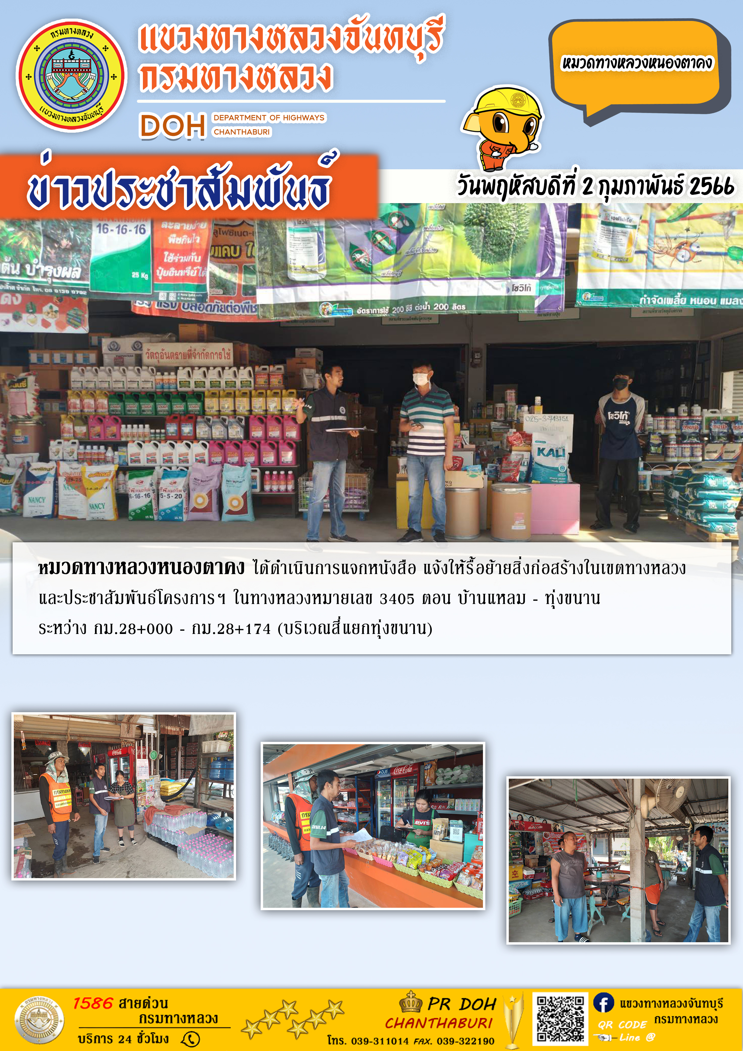 หมวดทางหลวงหนองตาคง ได้ดำเนินการแจกหนังสือ แจ้งให้รื้อย้ายสิ่งก่อสร้างในเขตทางหลวง และประชาสัมพันธ์โครงการฯ