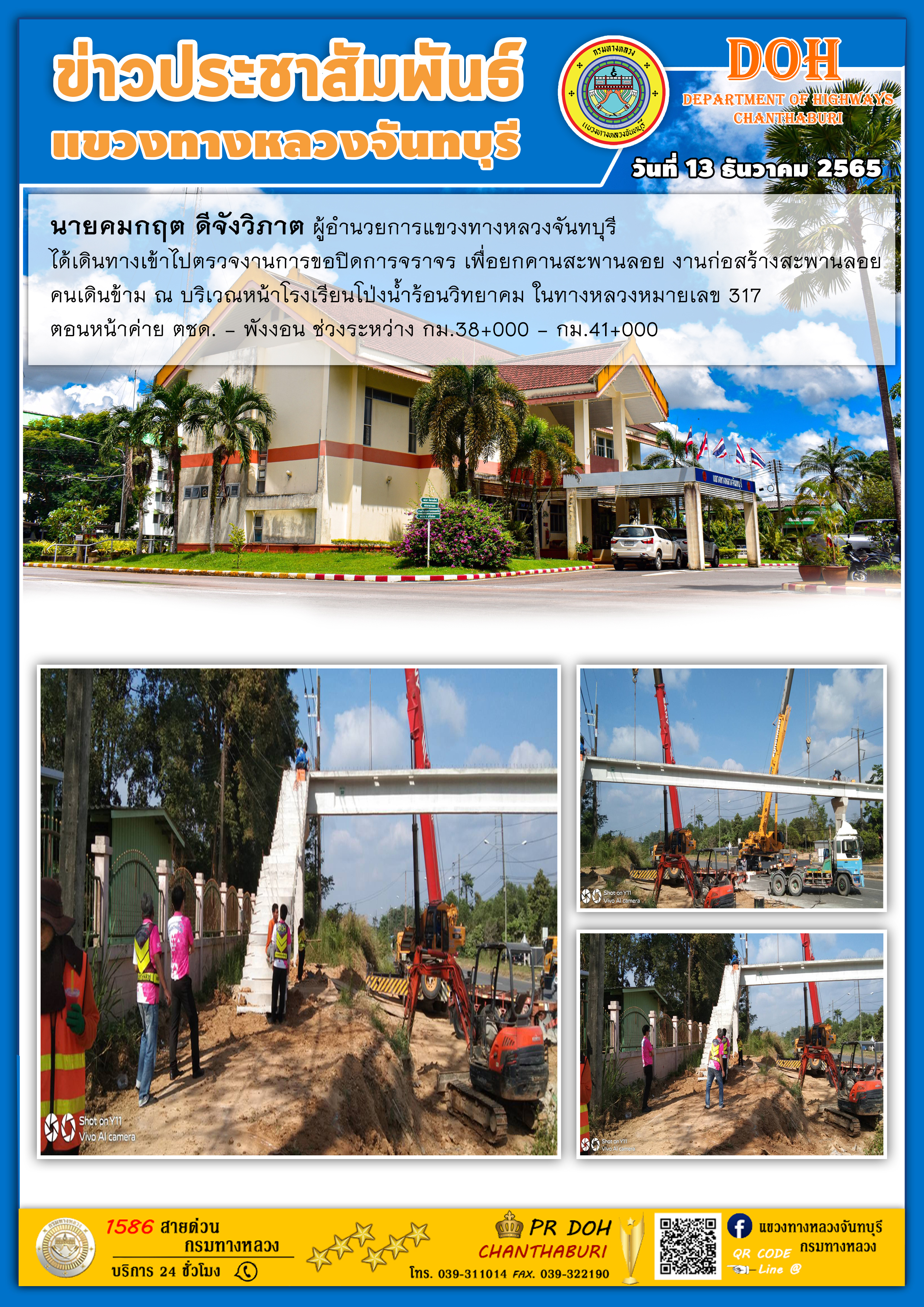 งานการขอปิดการจราจร เพื่อยกคานสะพานลอย งานก่อสร้างสะพานลอย คนเดินข้าม ณ บริเวณหน้าโรงเรียนโป่งน้ำร้อนวิทยาคม