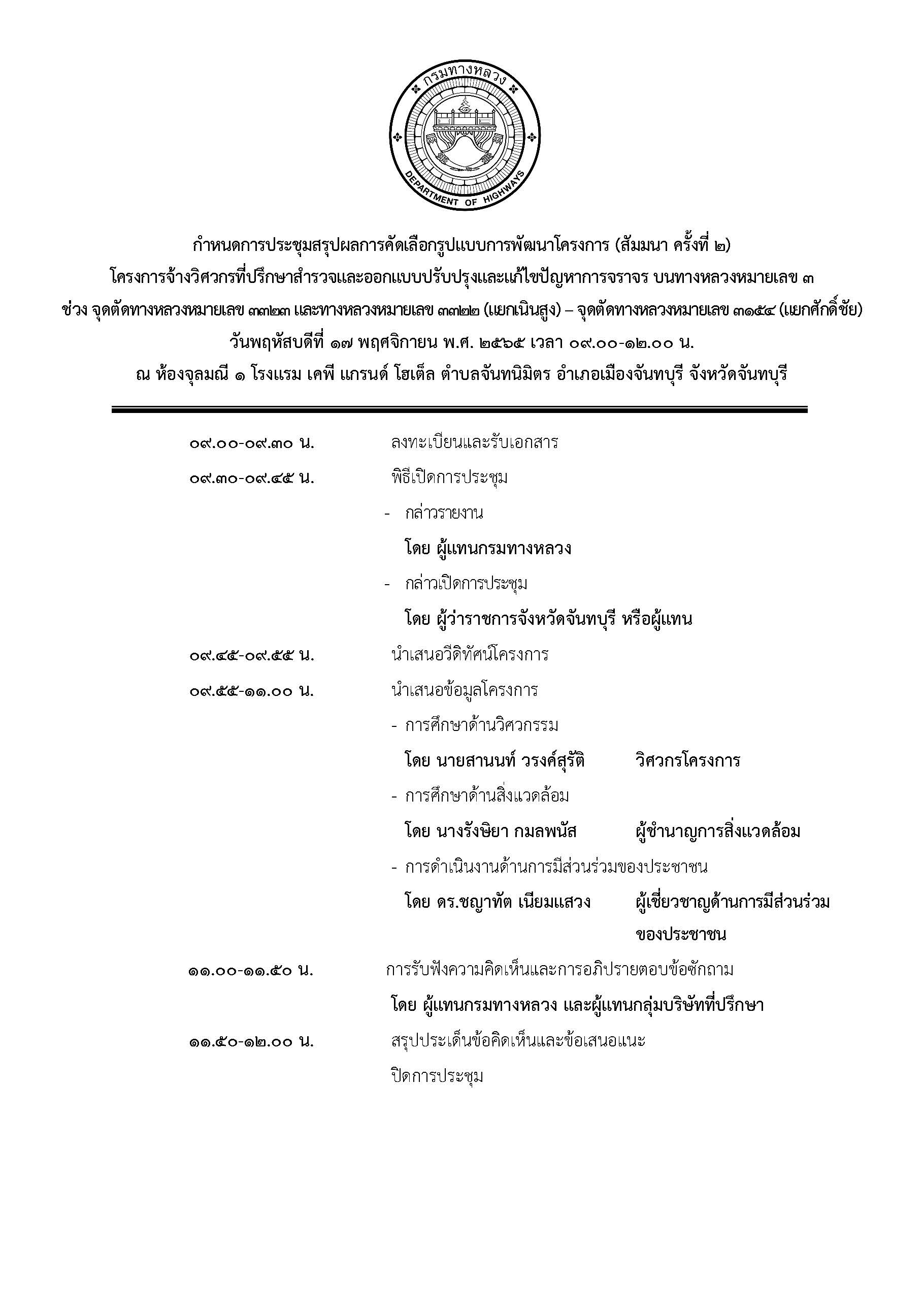 การประชุมสรุปผลการคัดเลือกรูปแบบการพัฒนาโครงการ (สัมมนา ครั้งที่ 2) งานบริการด้านวิศวกรรมการสำรวจและออกแบบรายละเอียดโครงการจ้างวิศวกรที่ปรึกาาสำรวจและออกแบบปรับปุงและแก้ไขปัญหาการจราจรบนทางหลวงหมายเลข 3 ช่วง จุดตัดทางหลวงหมายเลข 3323 และทางหลวงหมายเลข 3322 (แยกเนินสูง) - จุดตัดทางหลวงหมายเลข 3154 (แยกศักดิ์ชัย)
