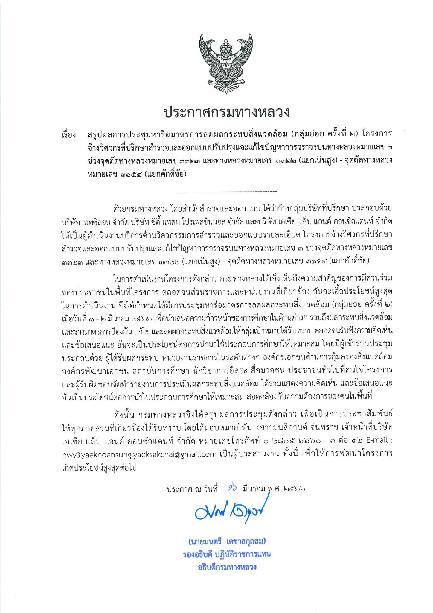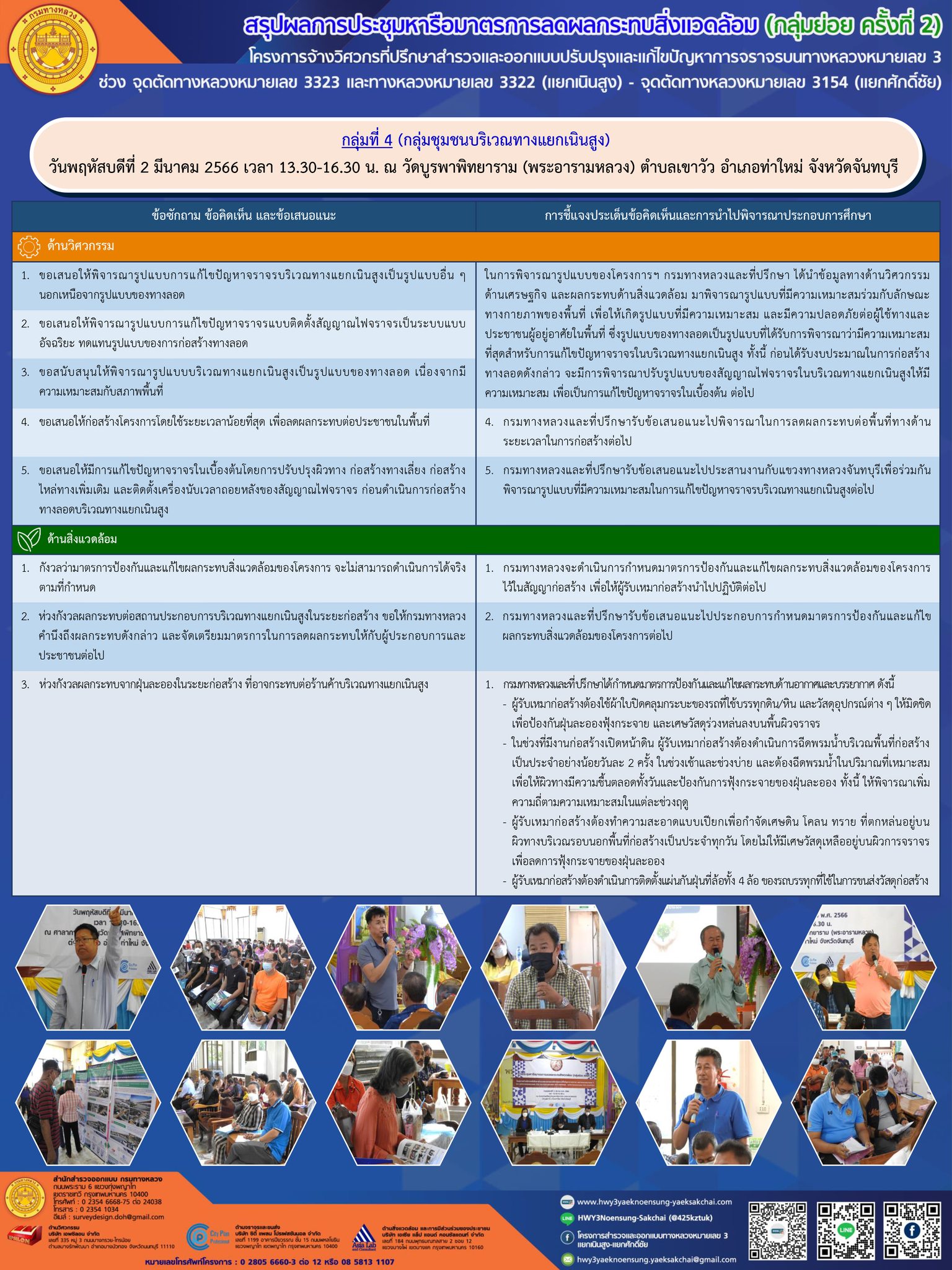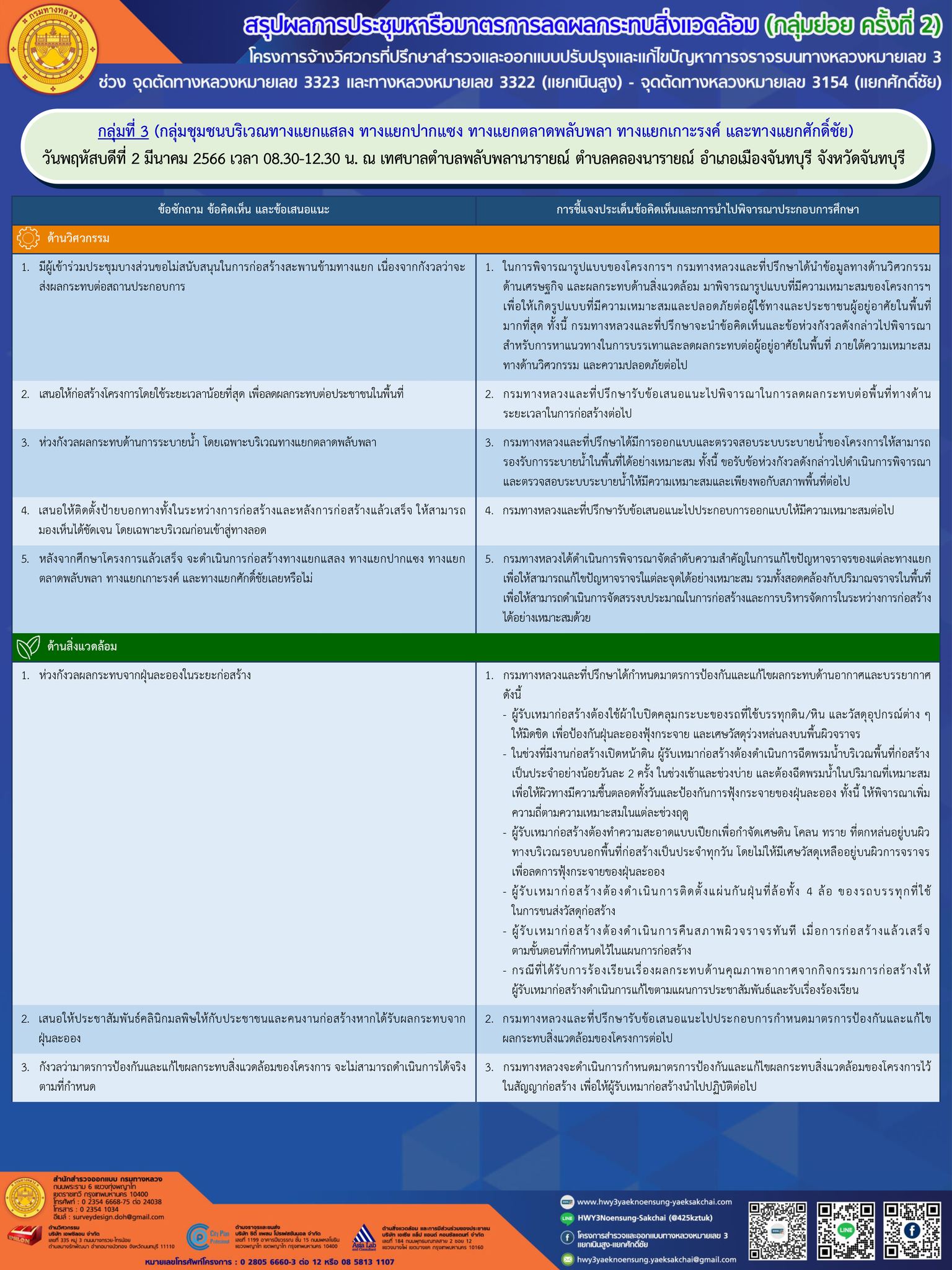 สรุปผลการประชุมหารือมาตรการลดผลกระทบสิ่งแวดล้อม (กลุ่มย่อย ครั้งที่ 2) โครงการจ้างวิศวกรที่ปรึกษาสำรวจและออกแบบปรับปรุงและแก้ไขปัญหาการจราจรบนทางหลวงหมายเลข 3 ช่วงจุดตัดทางหลวงหมายเลข 3323 และทางหลวงหมายเลข 3322 (แยกเนินสูง) - จุดตัดทางหลวงหมายเลข 3154 (แยกศักดิ์ชัย)