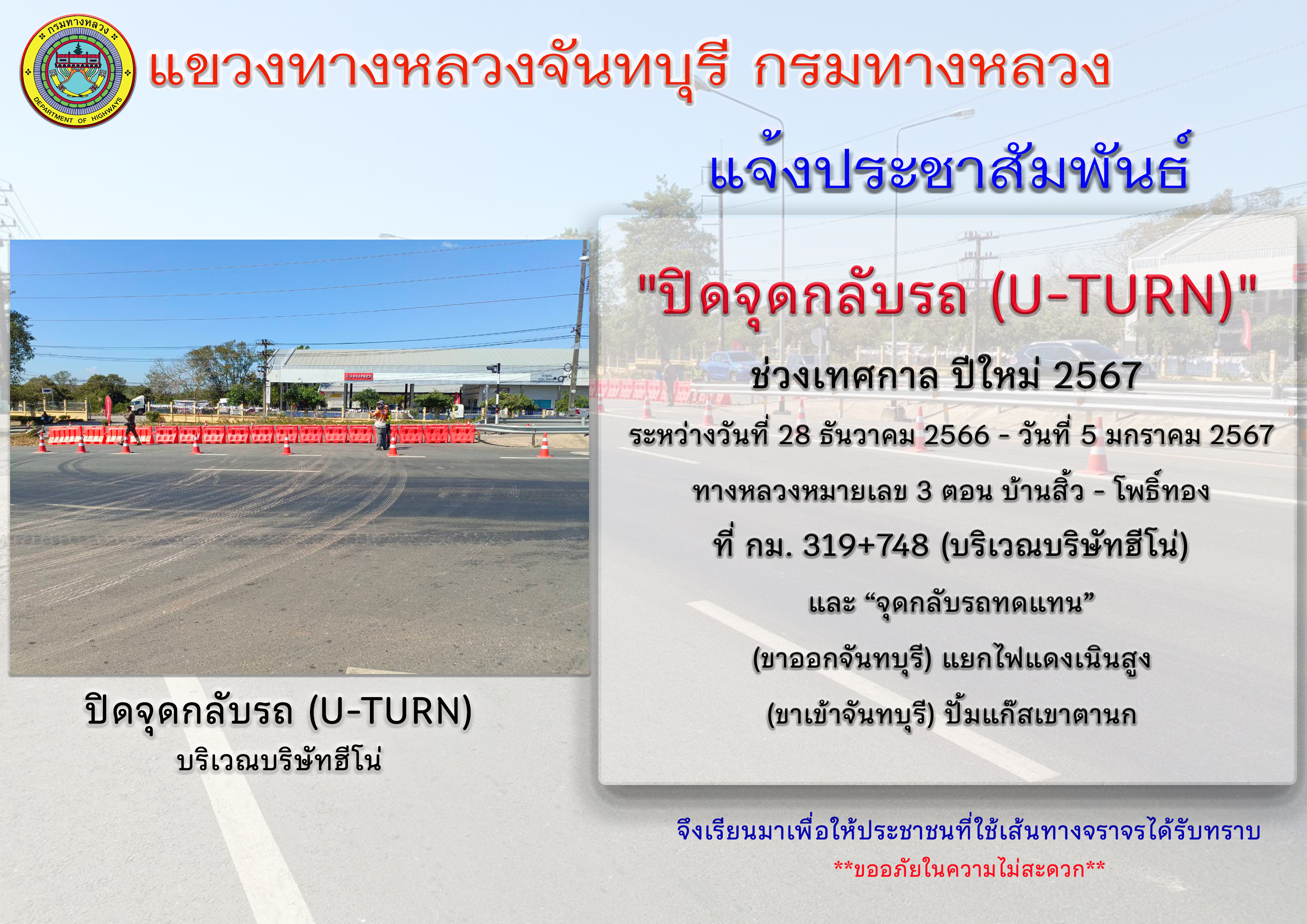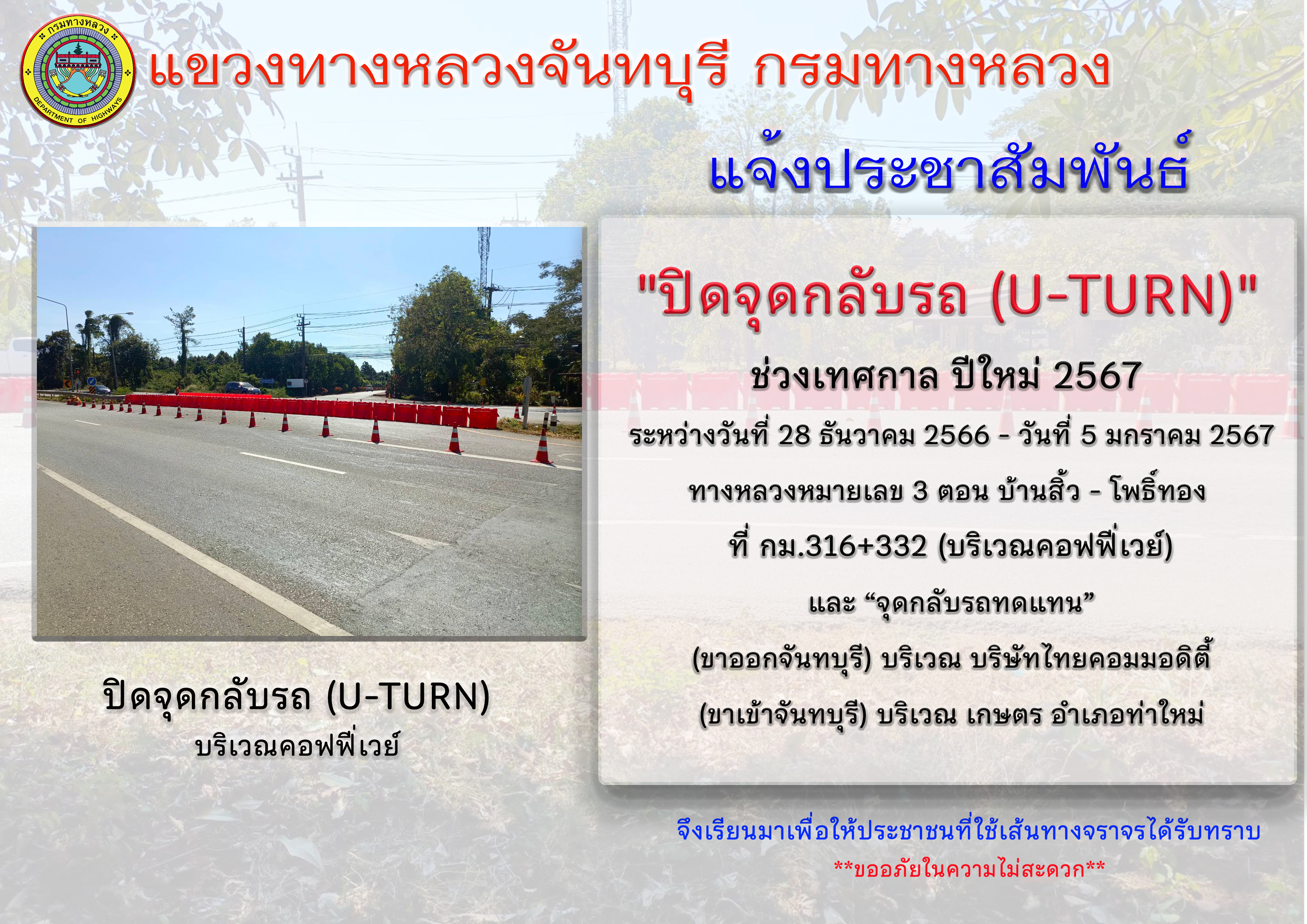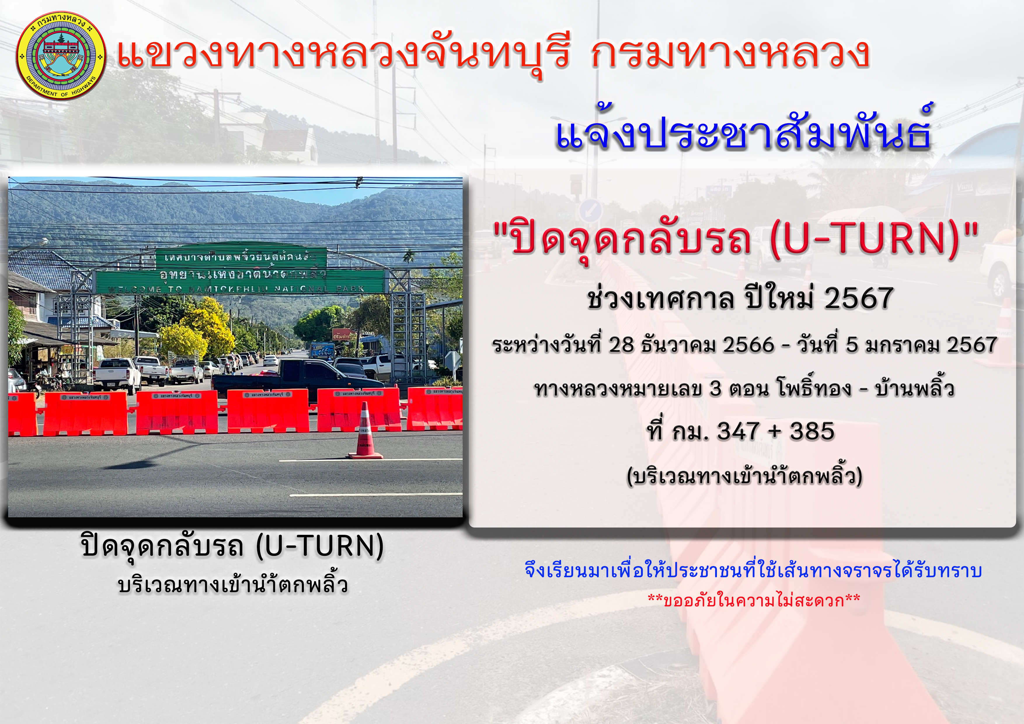 "ปิดจุดกลับรถ (U-TURN)" ช่วงเทศกาลปีใหม่ 2567 ตั้งแต่วันที่ 28 ธันวาคม 2566 - 5 มกราคม 2567