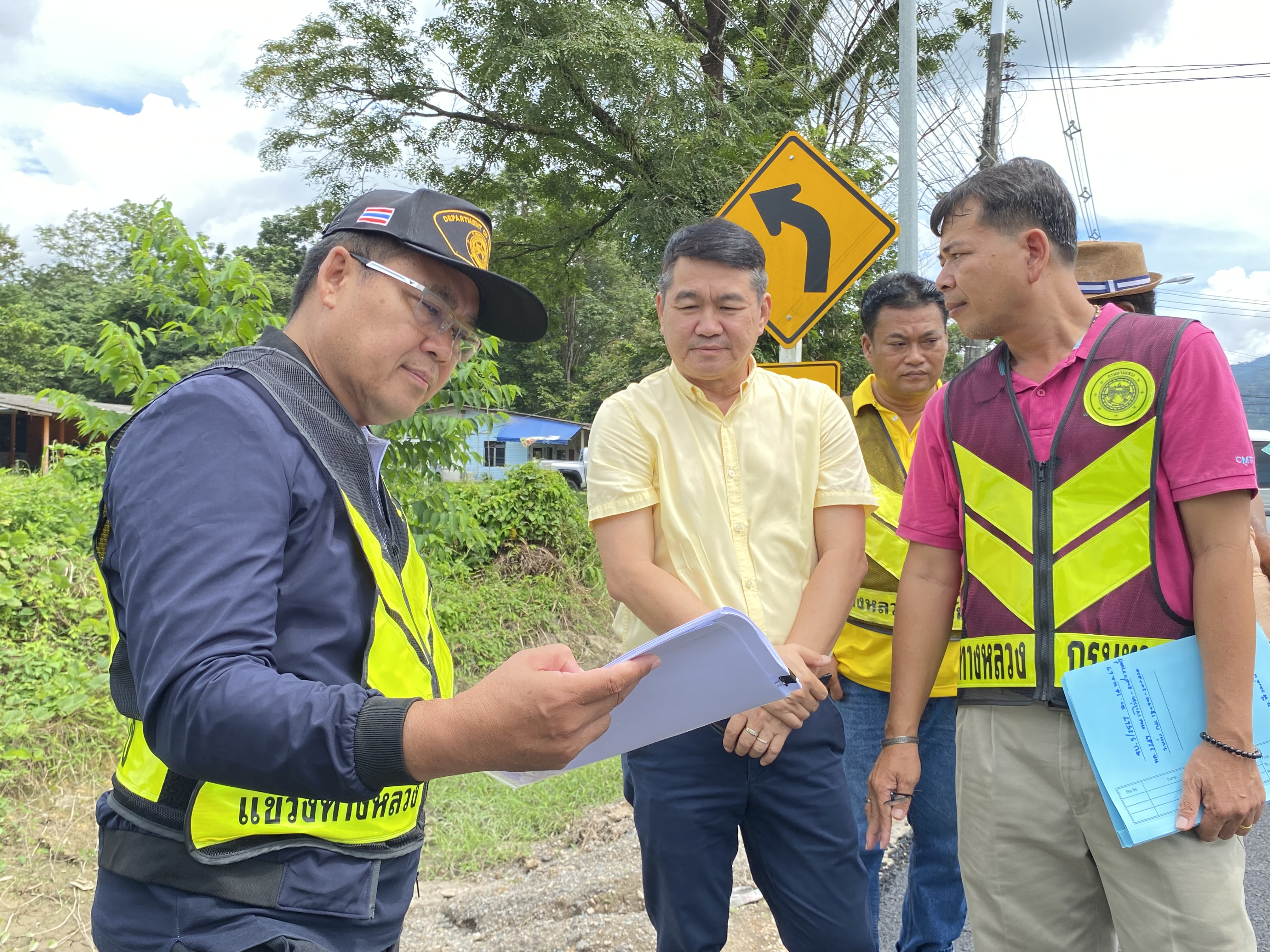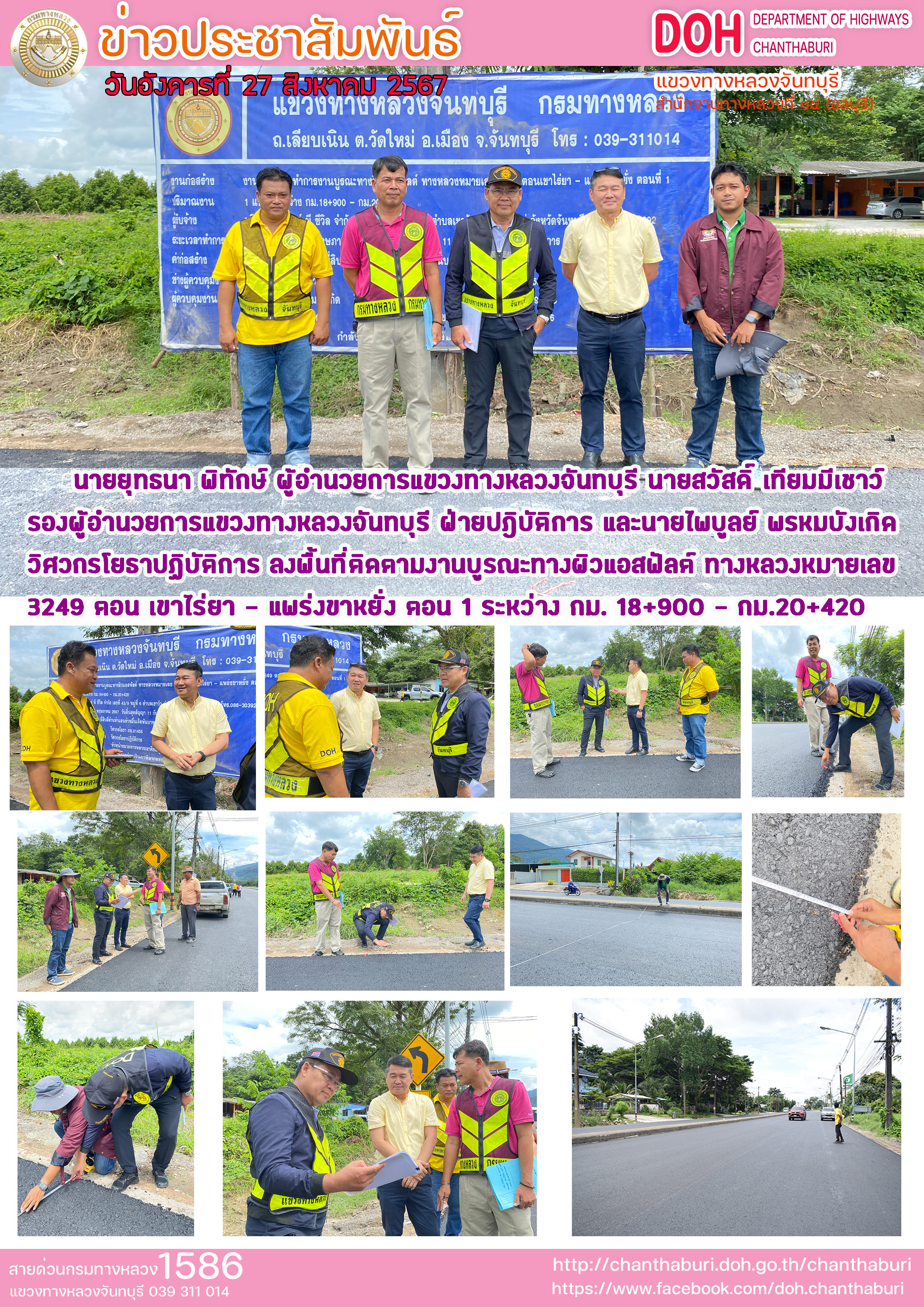 นายยุทธนา พิทักษ์ ผู้อำนวยการแขวงทางหลวงจันทบุรี นายสวัสดิ์ เทียมมีเชาว์ รองผู้อำนวยการแขวงทางหลวงจันทบุรี ฝ่ายปฎิบัติการ และนายไพบูลย์ พรหมบังเกิด วิศวกรโยธาปฏิิบัติการ ลงพื้นที่ติดตามงานบูรณะทางผิวแอสฟัลต์ ทางหลวงหมายเลข3249 ตอน เขาไร่ยา - แพร่งขาหยั่ง ตอน 1 ระหว่าง กม. 18+900 - กม.20+420
