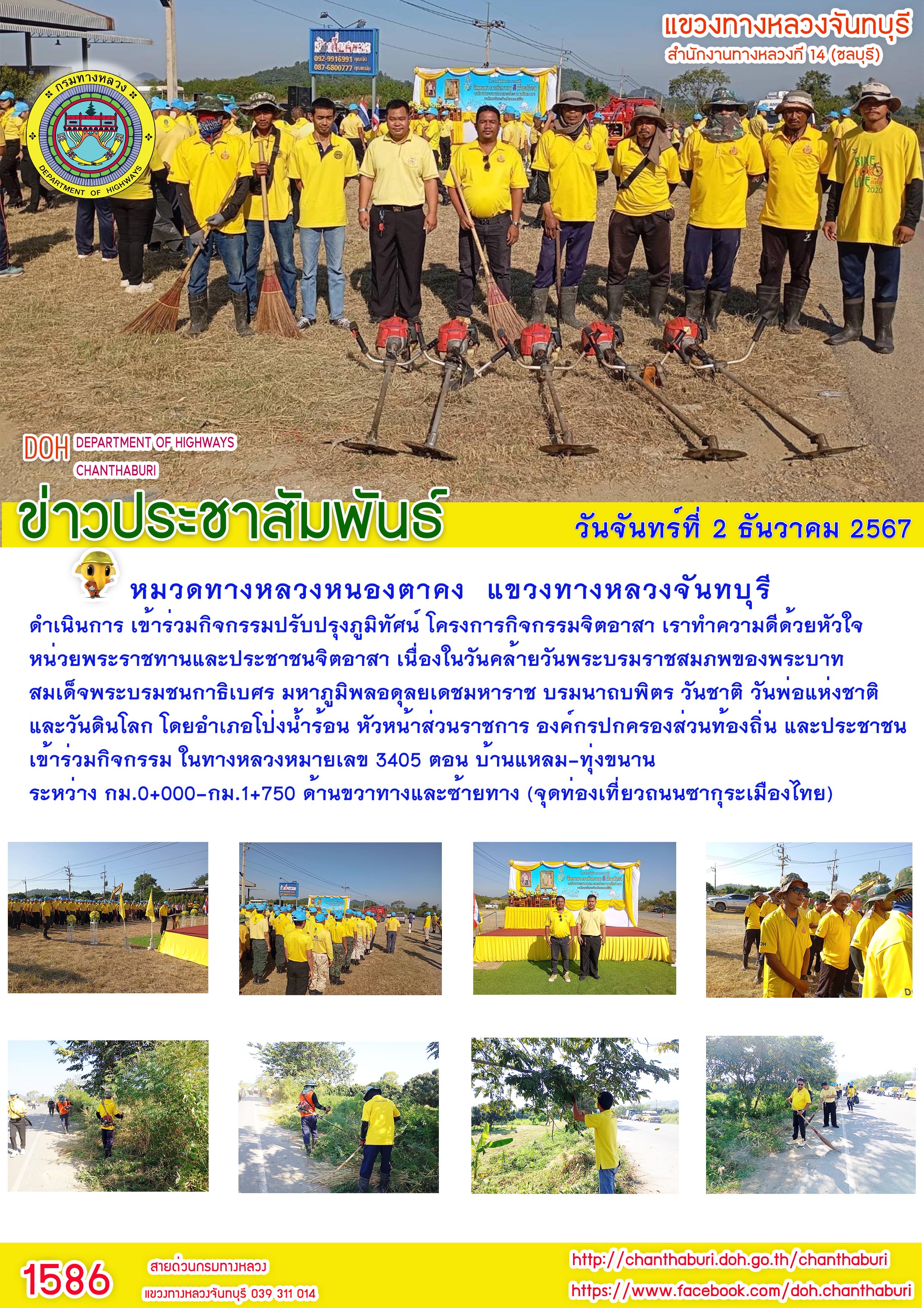ดำเนินการ เข้าร่วมกิจกรรมปรับปรุงภูมิทัศน์ โครงการกิจกรรมจิตอาสา เราทำความดีด้วยหัวใจ หน่วยพระราชทานและประชาชนจิตอาสา เนื่องในวันคล้ายวันพระบรมราชสมภพของพระบาทสมเด็จพระบรมชนกาธิเบศร มหาภูมิพลอดุลยเดชมหาราช บรมนาถบพิตร วันชาติ วันพ่อแห่งชาติ และวันดินโลก โดยอำเภอโป่งน้ำร้อน หัวหน้าส่วนราชการ องค์กรปกครองส่วนท้องถิ่น และประชาชนเข้าร่วมกิจกรรม ในทางหลวงหมายเลข 3405 ตอน บ้านแหลม-ทุ่งขนาน ระหว่าง กม.0+000-กม.1+750 ด้านขวาทางและด้านซ้ายทาง (จุดท่องเที่ยวถนนซากุระเมืองไทย)