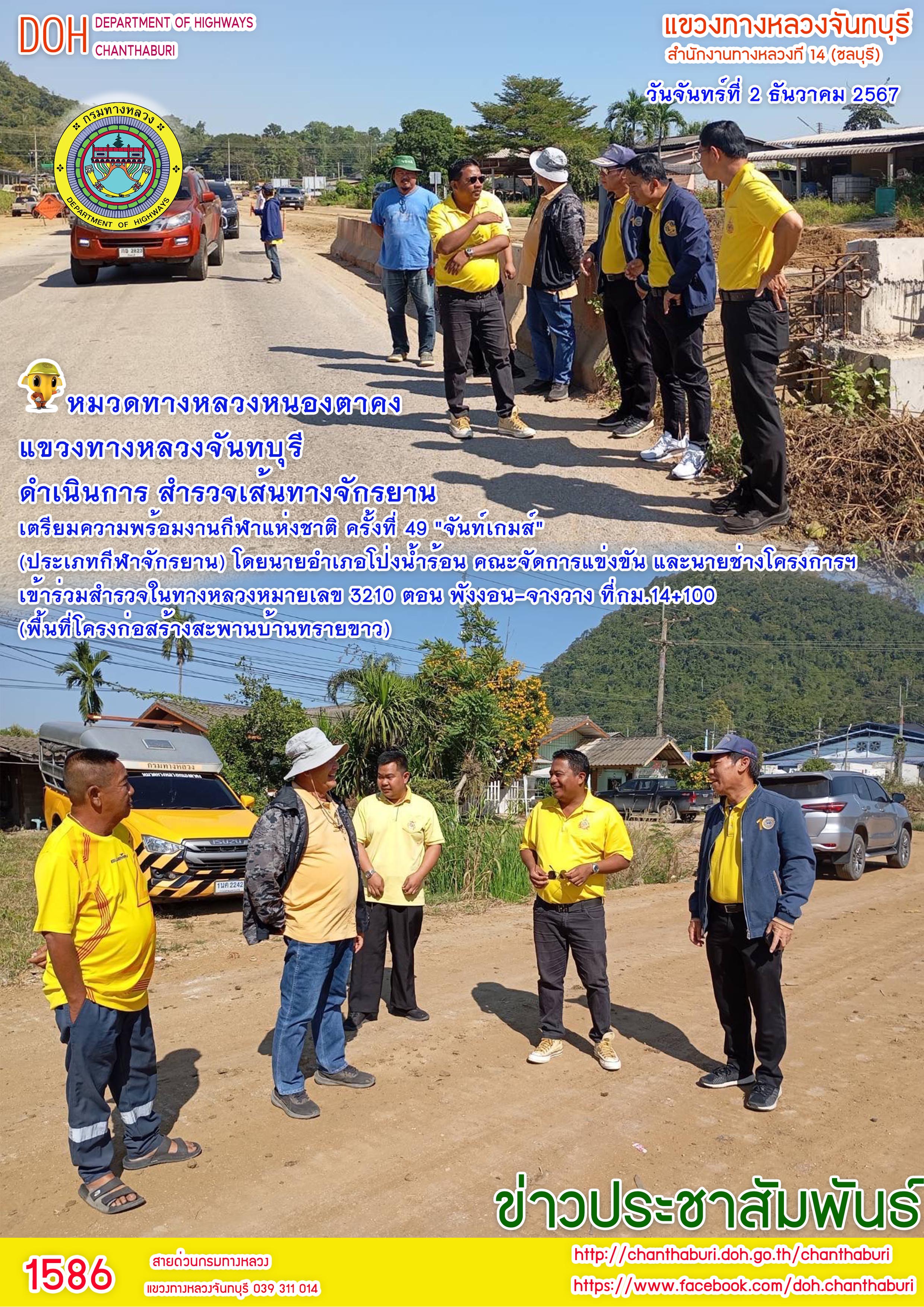 ดำเนินการ สำรวจเส้นทางจักรยาน เตรียมความพร้อมงานกีฬาแห่งชาติ ครั้งที่ 49 "จันท์เกมส์" (ประเภทกีฬาจักรยาน) โดยนายอำเภอโป่งน้ำร้อน คณะจัดการแข่งขัน และนายช่างโครงการฯ เข้าร่วมสำรวจ ในทางหลวงหมายเลข 3210 ตอน พังงอน-จางวาง ที่ กม.14+100 (พื้นที่โครงก่อสร้างสะพานบ้านทรายขาว)