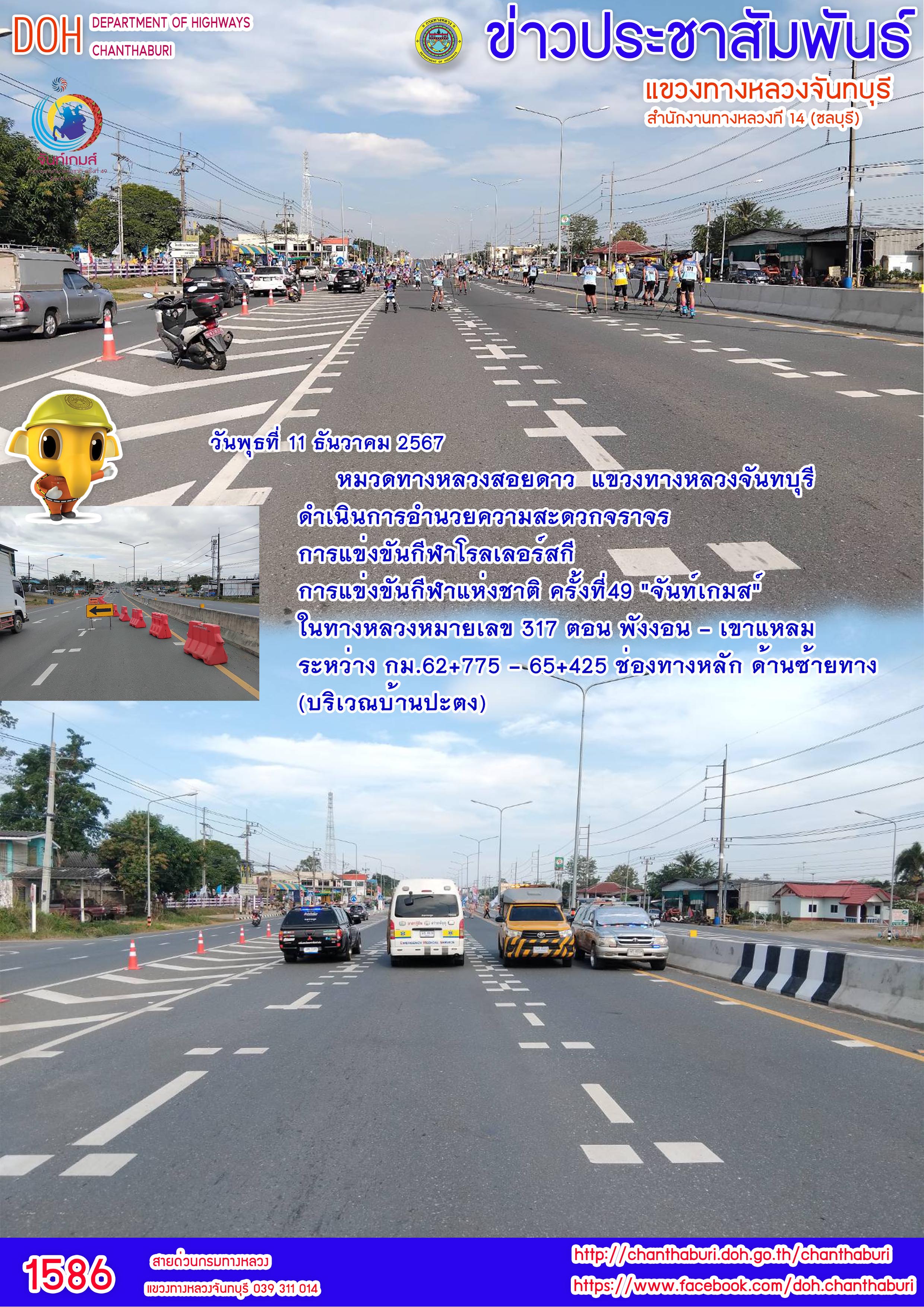 ดำเนินการอำนวยความสะดวกจราจรการแข่งขันกีฬาโรลเลอร์สกี การแข่งขันกีฬาแห่งชาติ ครั้งที่ 49 "จันท์เกมส์“ ในทางหลวงหมายเลข 317 ตอน พังงอน - เขาแหลม ระหว่าง กม.62+775 - กม.65+425 ช่องทางหลัก ด้านซ้ายทาง (บริเวณบ้านปะตง)