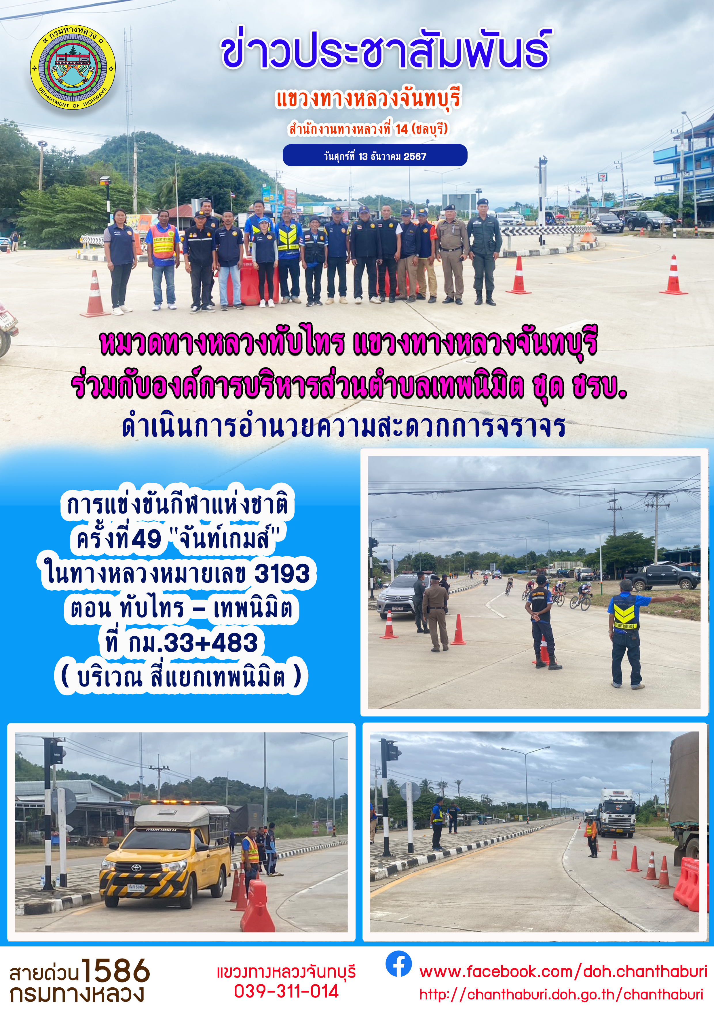 หมวดทางหลวงทับไทร แขวงทางหลวงจันทบุรี ร่วมกับ องค์การบริหารส่วนตำบลเทพนิมิต ชุด ชรบ. ดำเนินการอำนวยความสะดวกการจราจร การแข่งขันกีฬาแห่งชาติ ครั้งที่49 "จันท์เกมส์" ในทางหลวงหมายเลข 3193 ตอน ทับไทร - เทพนิมิต ที่ กม.33+483 ( บริเวณ สี่แยกเทพนิมิต )