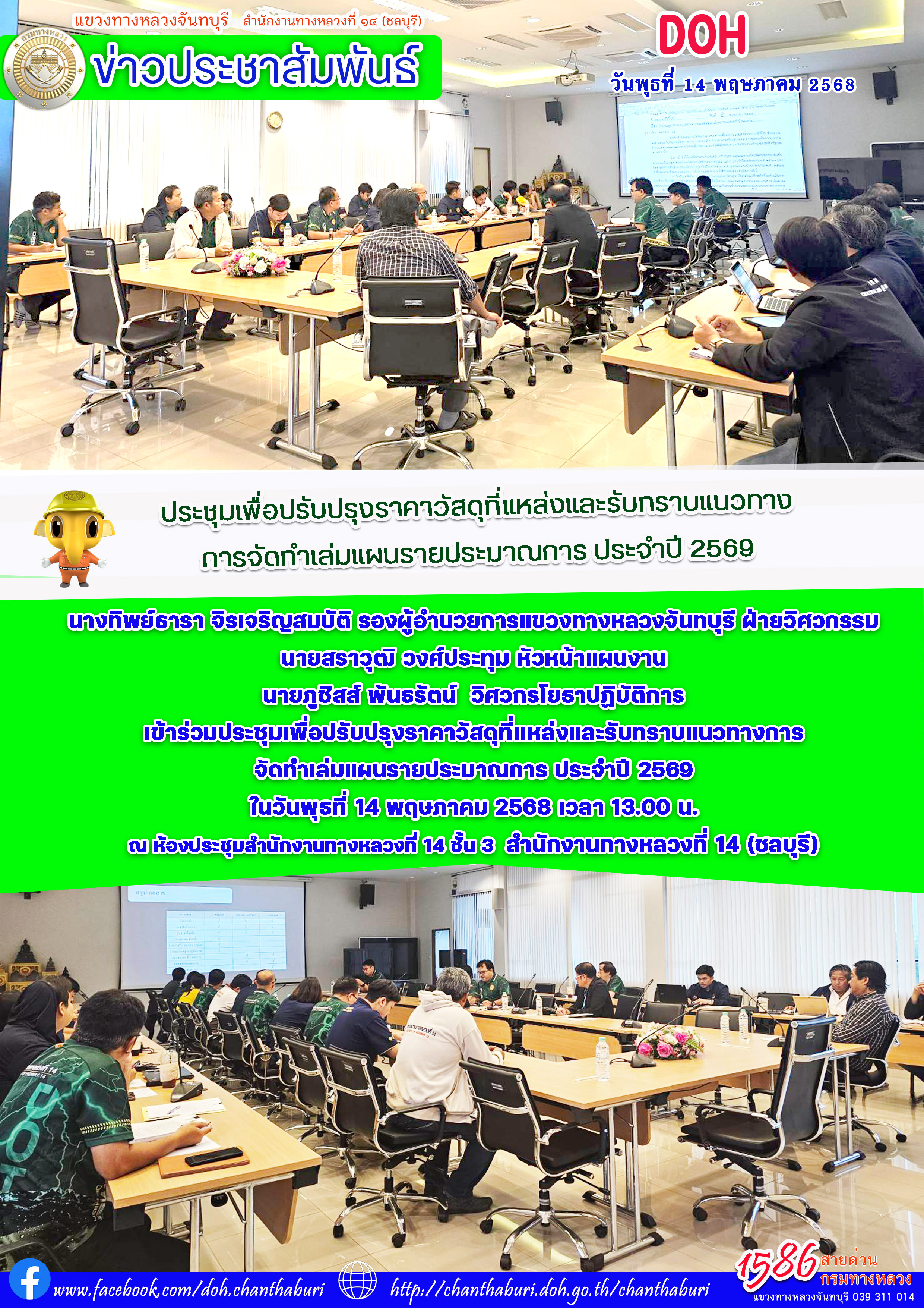 นางทิพย์ธารา จิรเจริญสมบัติ รองผู้อำนวยการแขวงทางหลวงจันทบุรี ฝ่ายวิศวกรรม นายสราวุฒิ วงศ์ประทุม หัวหน้าแผนงาน นายภูชิสส์ พันธรัตน์ วิศวกรโยธาปฏิบัติการ เข้าร่วมประชุมเพื่อปรับปรุงราคาวัสดุที่แหล่งและรับทราบแนวทางการ จัดทำเล่มแผนรายประมาณการ ประจำปี 2569 ในวันพุธที่ 14 พฤษภาคม 2568 เวลา 13.00 น. ณ ห้องประชุมสำนักงานทางหลวงที่ 14 ชั้น 3 สำนักงานทางหลวงที่ 14 (ชลบุรี)