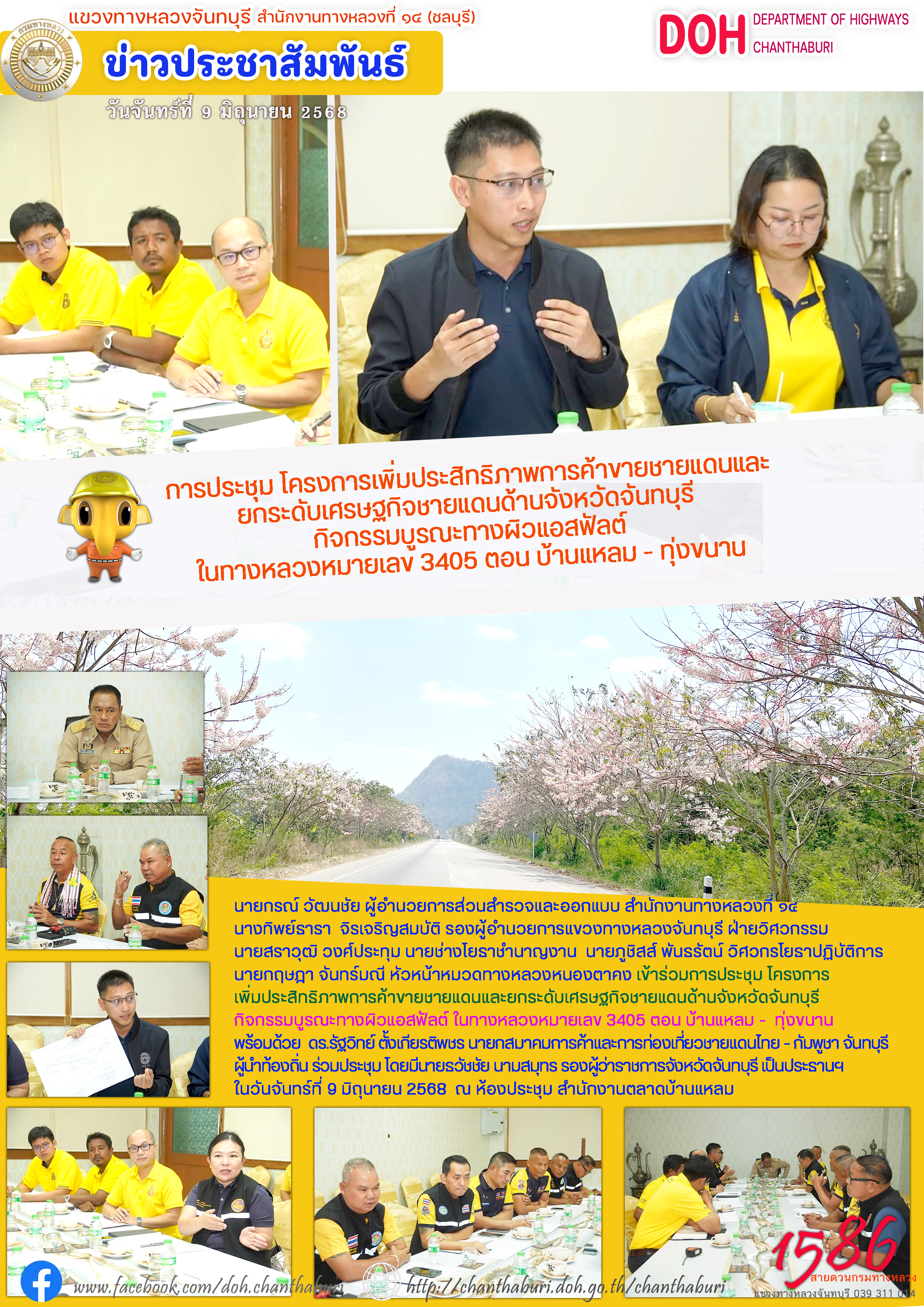 นายกรณ์ วัฒนชัย ผู้อำนวยการส่วนสำรวจและออกแบบ สำนักงานทางหลวงที่ ๑๔ นางทิพย์ธารา จิรเจริญสมบัติ รองผู้อำนวยการแขวงทางหลวงจันทบุรี ฝ่ายวิศวกรรม นายสราวุฒิ วงศ์ประทุม นายช่างโยธาชำนาญงาน นายภูชิสส์ พันธรัตน์ วิศวกรโยธาปฏิบัติการ นายกฤษฎา จันทร์มณี หัวหน้าหมวดทางหลวงหนองตาคง เข้าร่วมการประชุม โครงการเพิ่มประสิทธิภาพการค้าขายชายแดนและยกระดับเศรษฐกิจชายแดนด้านจังหวัดจันทบุรี กิจกรรมบูรณะทางผิวแอสฟัลต์ ในทางหลวงหมายเลข 3405 ตอน บ้านแหลม - ทุ่งขนาน พร้อมด้วย ดร.รัฐวิทย์ ตั้งเกียรติพชร นายกสมาคมการค้าและการท่องเที่ยวชายแดนไทย - กัมพูชา จันทบุรี ผู้นำท้องถิ่น ร่วมประชุม โดยมีนายธวัชชัย นามสมุทร รองผู้ว่าราชการจังหวัดจันทบุรี เป็นประธานฯ ในวันจันทร์ที่ 9 มิถุนายน 2568 ณ ห้องประชุม สำนักงานตลาดบ้านแหลม
