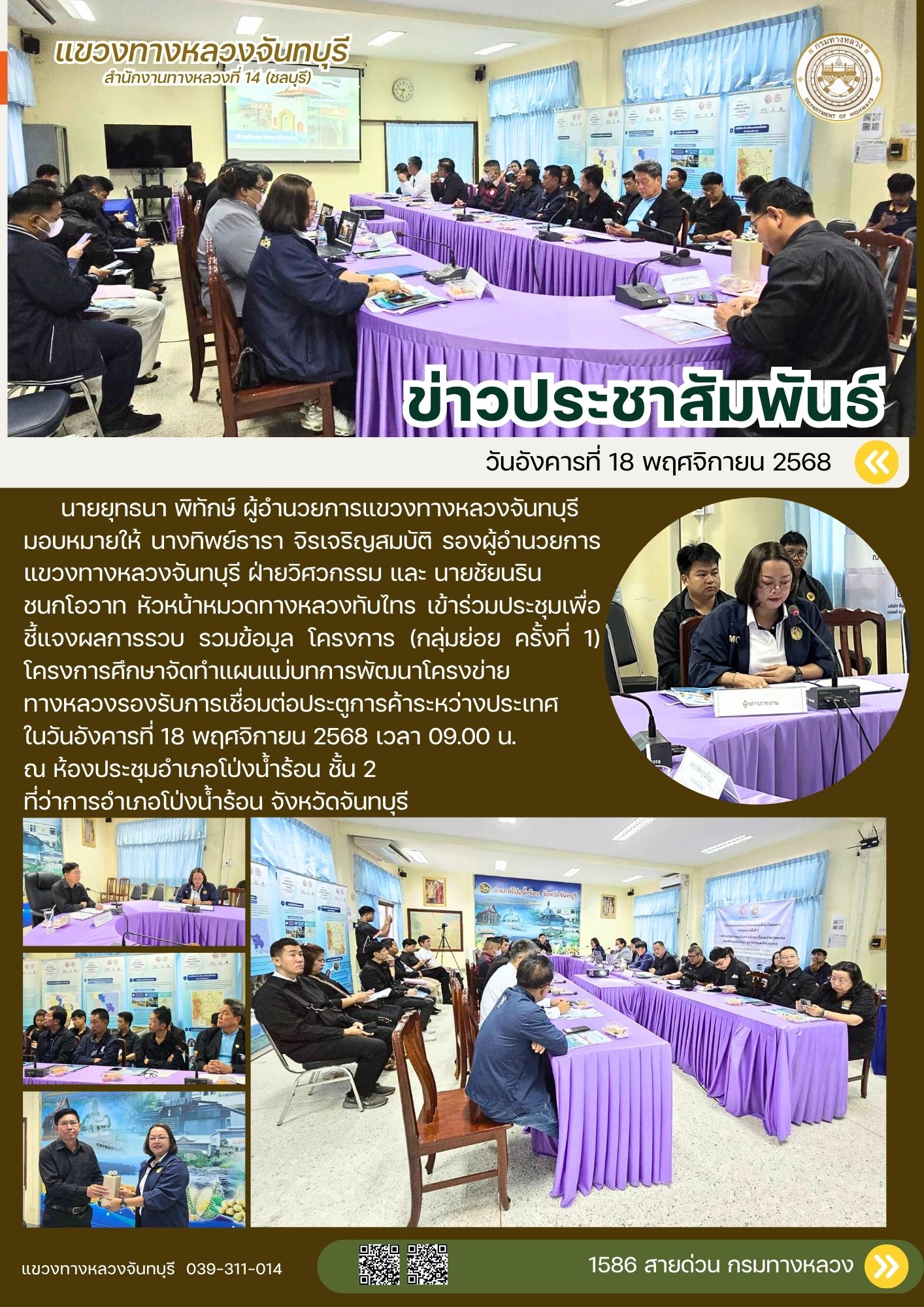 นายยุทธนา พิทักษ์ ผู้อำนวยการแขวงทางหลวงจันทบุรี มอบหมายให้ นางทิพย์ธารา จิรเจริญสมบัติ รองผู้อำนวยการแขวงทางหลวงจันทบุรี ฝ่ายวิศวกรรม และ นายชัยนริน ชนกโอวาท หัวหน้าหมวดทางหลวงทับไทร เข้าร่วมประชุมเพื่อชี้แจงผลการรวบรวมข้อมูล โครงการ (กลุ่มย่อย ครั้งที่ 1) โครงการศึกษาจัดทำแผนแม่บทการพัฒนาโครงข่ายทางหลวงรองรับการเชื่อมต่อประตูการค้าระหว่างประเทศ