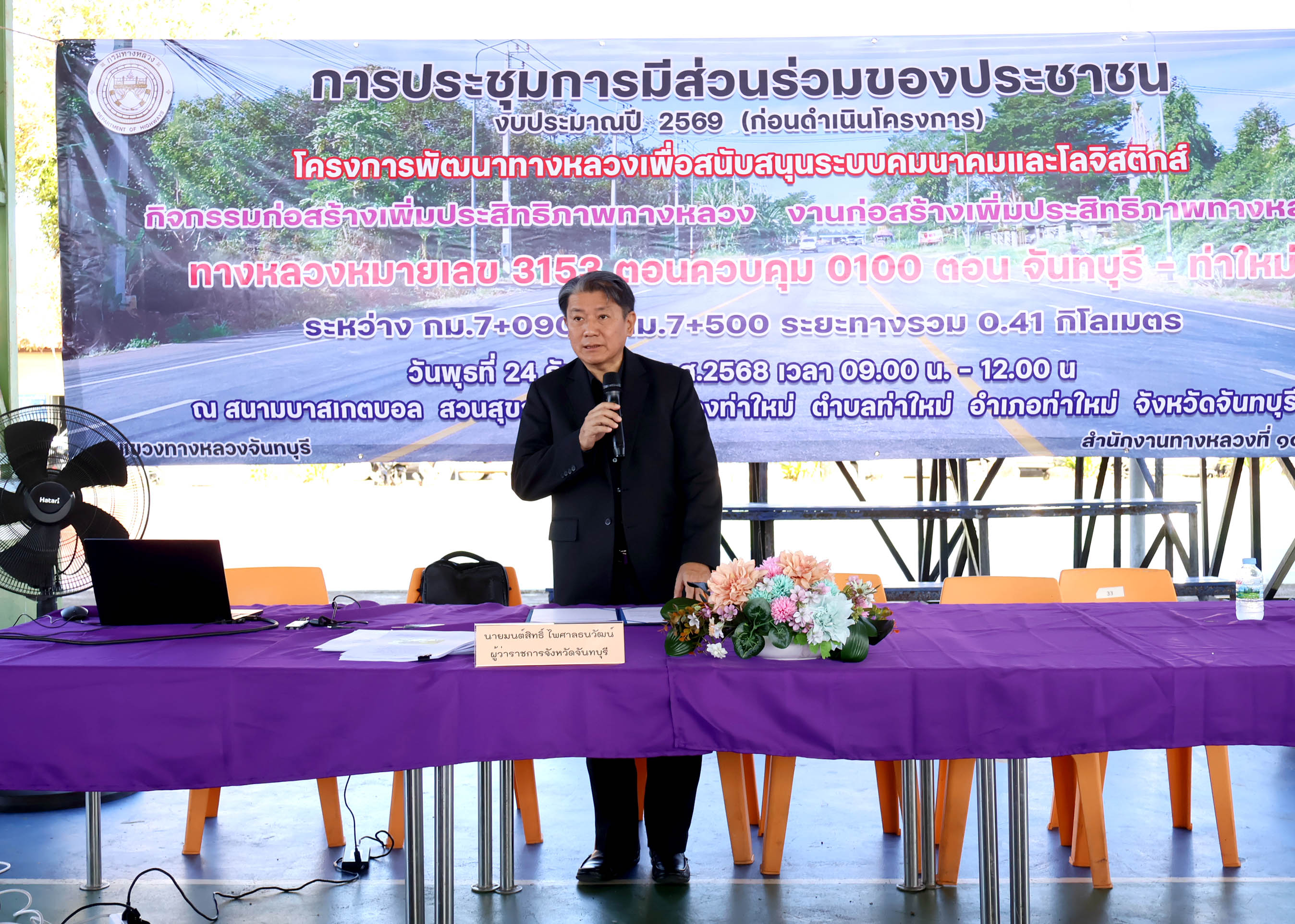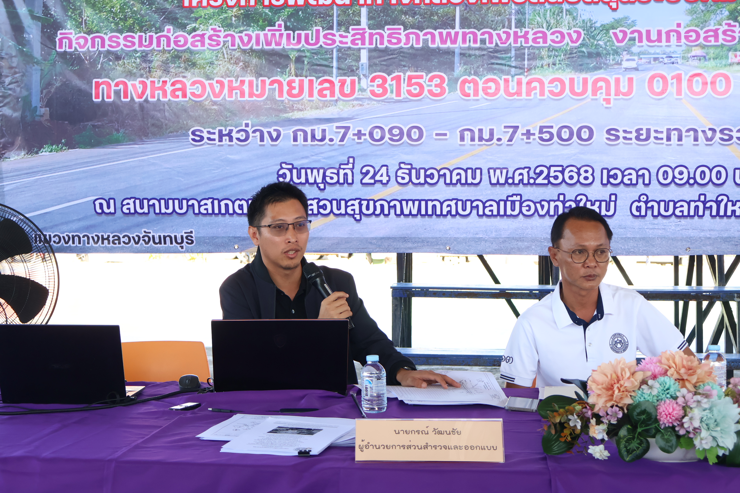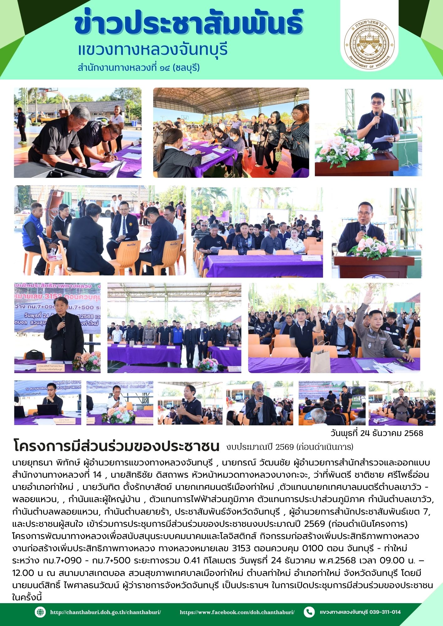 นายยุทธนา พิทักษ์ ผู้อำนวยการแขวงทางหลวงจันทบุรี , นายกรณ์ วัฒนชัย ผู้อำนวยการสำนักสำรวจและออกแบบ สำนักงานทางหลวงที่ 14 , นายสิทธิชัย ดิสถาพร หัวหน้าหมวดทางหลวงบางกะจะ, ว่าที่พันตรี ชาติชาย ศรีโพธิ์อ่อนนายอำเภอท่าใหม่ , นายวันทิต ตั้งรักษาสัตย์ นายกเทศมนตรีเมืองท่าใหม่ ,ตัวแทนนายกเทศบาลมนตรีตำบลเขาวัว - พลอยแหวน, , กำนันและผู้ใหญ่บ้าน , ตัวแทนการไฟฟ้าส่วนภูมิภาค ตัวแทนการประปาส่วนภูมิภาค กำนันตำบลเขาวัว, กำนันตำบลพลอยแหวน, กำนันตำบลยายร้า, ประชาสัมพันธ์จังหวัดจันทบุรี , ผู้อำนวยการสำนักประชาสัมพันธ์เขต 7, และประชาชนผู้สนใจ เข้าร่วมการประชุมการมีส่วนร่วมของประชาชนงบประมาณปี 2569 (ก่อนดำเนินโครงการ) โครงการพัฒนาทางหลวงเพื่อสนับสนุนระบบคมนาคมและโลจิสติกส์ กิจกรรมก่อสร้างเพิ่มประสิทธิภาพทางหลวง งานก่อสร้างเพิ่มประสิทธิภาพทางหลวง ทางหลวงหมายเลข 3153 ตอนควบคุม 0100 ตอน จันทบุรี - ท่าใหม่ ระหว่าง กม.7+090 - กม.7+500 ระยะทางรวม 0.41 กิโลเมตร วันพุธที่ 24 ธันวาคม พ.ศ.2568 เวลา 09.00 น. – 12.00 น ณ สนามบาสเกตบอล สวนสุขภาพเทศบาลเมืองท่าใหม่ ตำบลท่าใหม่ อำเภอท่าใหม่ จังหวัดจันทบุรี โดยมี นายมนต์สิทธิ์ ไพศาลธนวัฒน์ ผู้ว่าราชการจังหวัดจันทบุรี เป็นประธานฯ ในการเปิดประชุมการมีส่วนร่วมของประชาชนในครั้งนี้