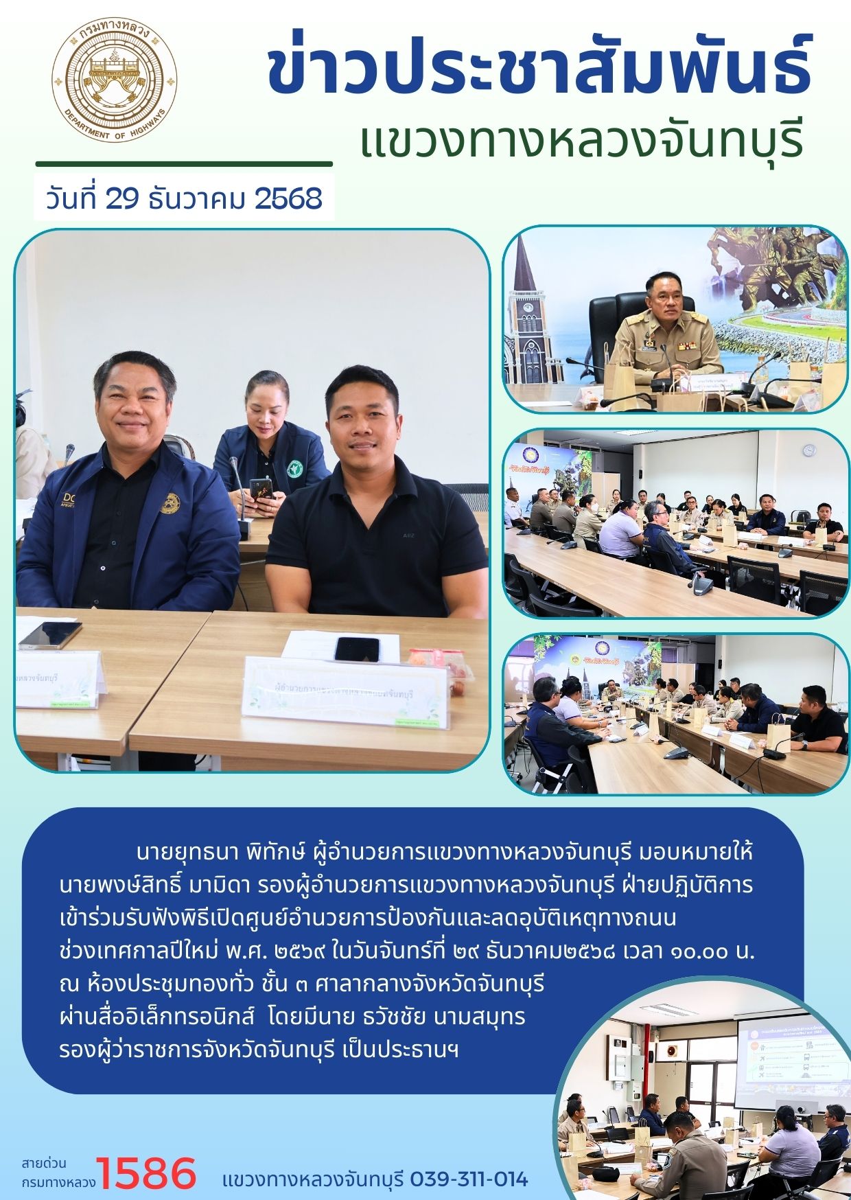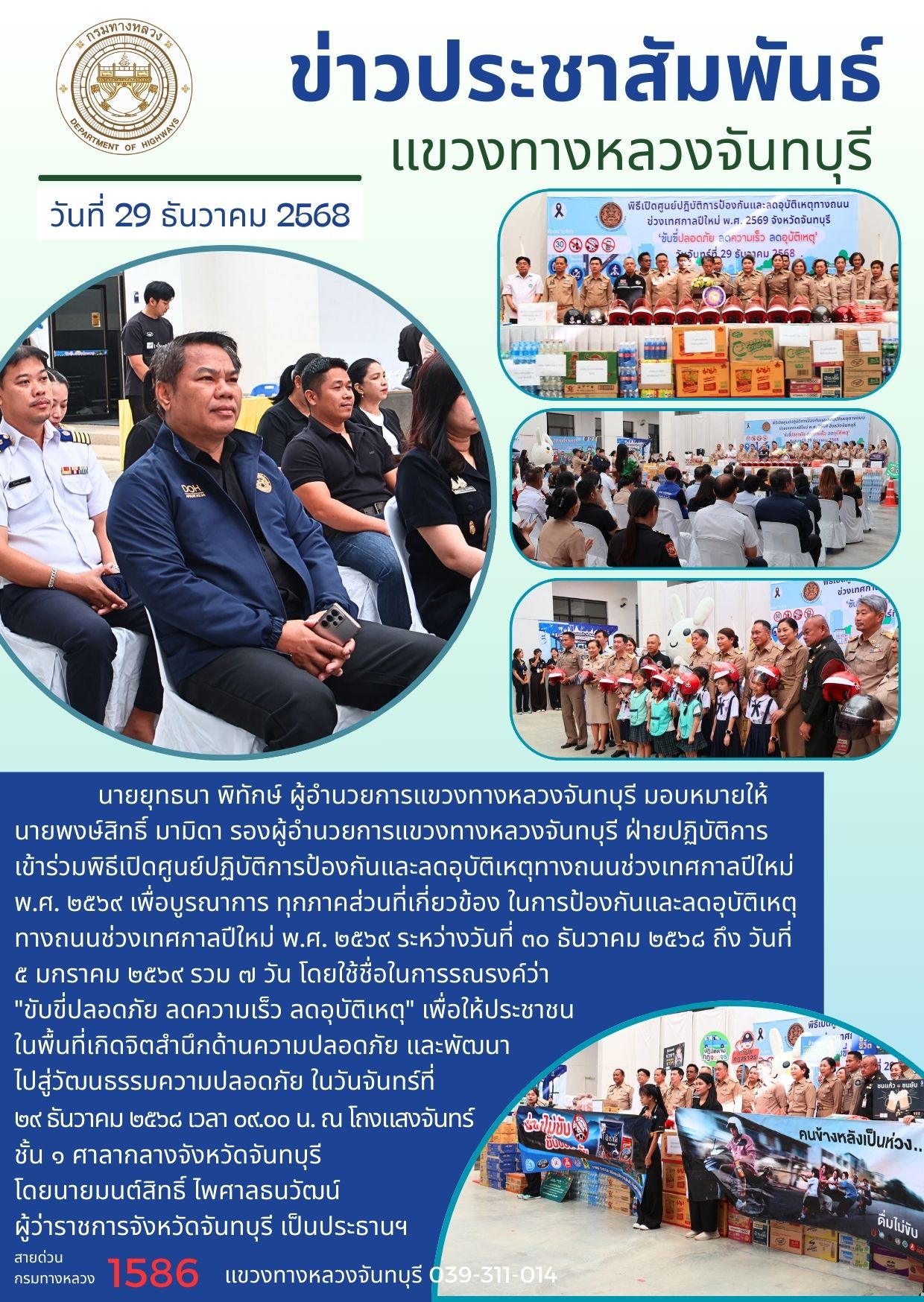 นายยุทธนา พิทักษ์ ผู้อำนวยการแขวงทางหลวงจันทบุรี มอบหมายให้ นายพงษ์สิทธิ์ มามิดา รองผู้อำนวยการแขวงทางหลวงจันทบุรี ฝ่ายปฏิบัติการ เข้าร่วมพิธีเปิดศูนย์ปฏิบัติการป้องกันและลดอุบัติเหตุทางถนนช่วงเทศกาลปีใหม่ พ.ศ. ๒๕๖๙ เพื่อบูรณาการ ทุกภาคส่วนที่เกี่ยวข้อง ในการป้องกันและลดอุบัติเหตุทางถนนช่วงเทศกาลปีใหม่ พ.ศ. ๒๕๖๙ ระหว่างวันที่ ๓๐ ธันวาคม ๒๕๖๘ ถึง วันที่ ๕ มกราคม ๒๕๖๙ รวม ๗ วัน โดยใช้ชื่อในการรณรงค์ว่า "ขับขี่ปลอดภัย ลดความเร็ว ลดอุบัติเหตุ" เพื่อให้ประชาชน