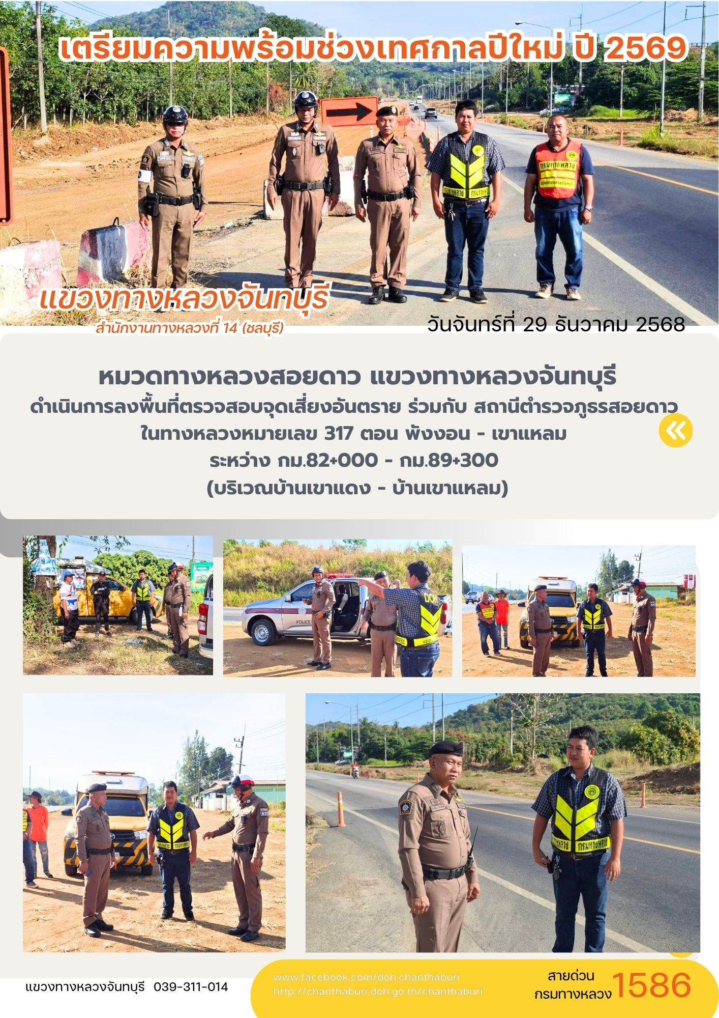 ดำเนินการลงพื้นที่ตรวจสอบจุดเสี่ยงอันตราย ร่วมกับสถานีตำรวจภูธรสอยดาว ในทางหลวงหมายเลข 317 ตอน พังงอน - เขาแหลม ระหว่าง กม.82+000 - กม.89+300 (บริเวณบ้านเขาแดง - บ้านเขาแหลม)