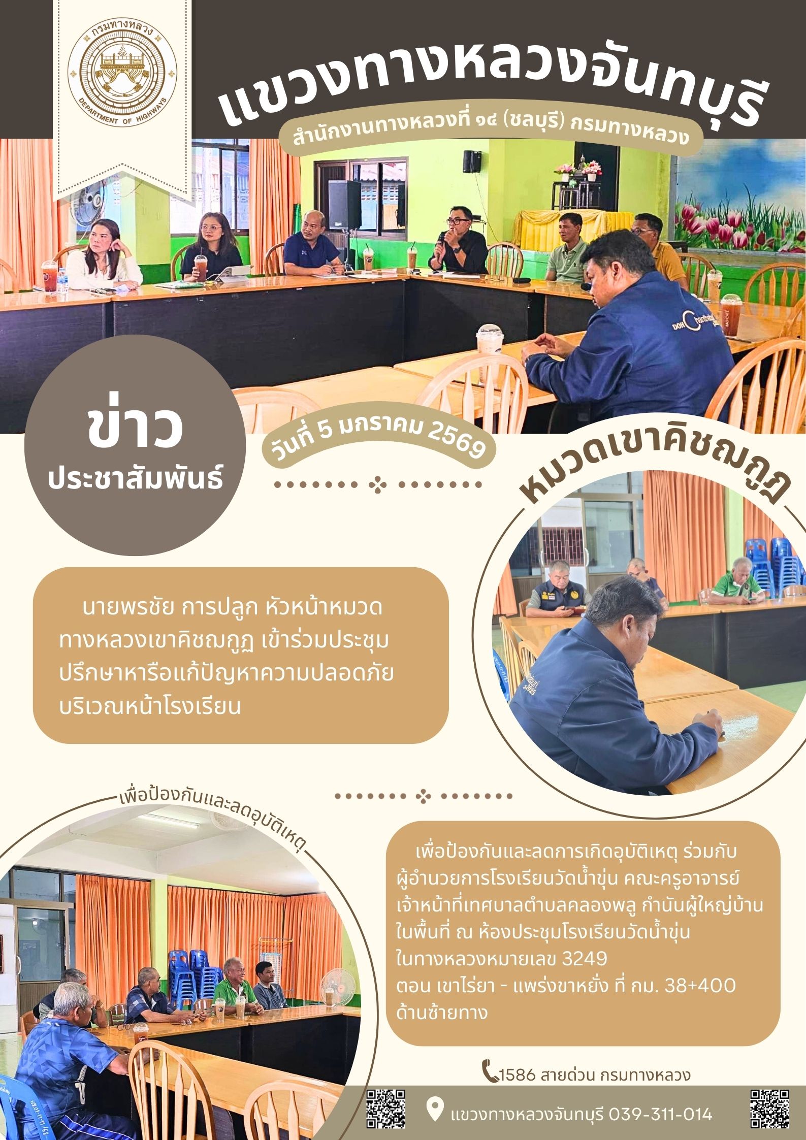 นายพรชัย การปลูก หัวหน้าหมวดทางหลวงเขาคิชฌกูฏ เข้าร่วมประชุมปรึกษาหารือแก้ปัญหาความปลอดภัยบริเวณหน้าโรงเรียน เพื่อป้องกันและลดการเกิดอุบัติเหตุ ร่วมกับ ผู้อำนวยการโรงเรียนวัดน้ำขุ่น คณะครูอาจารย์ เจ้าหน้าที่เทศบาลตำบลคลองพลู กำนันผู้ใหญ่บ้านในพื้นที่ ณ ห้องประชุมโรงเรียนวัดน้ำขุ่น ทางหลวงหมายเลข 3249 ตอน เขาไร่ยา - แพร่งขาหยั่ง