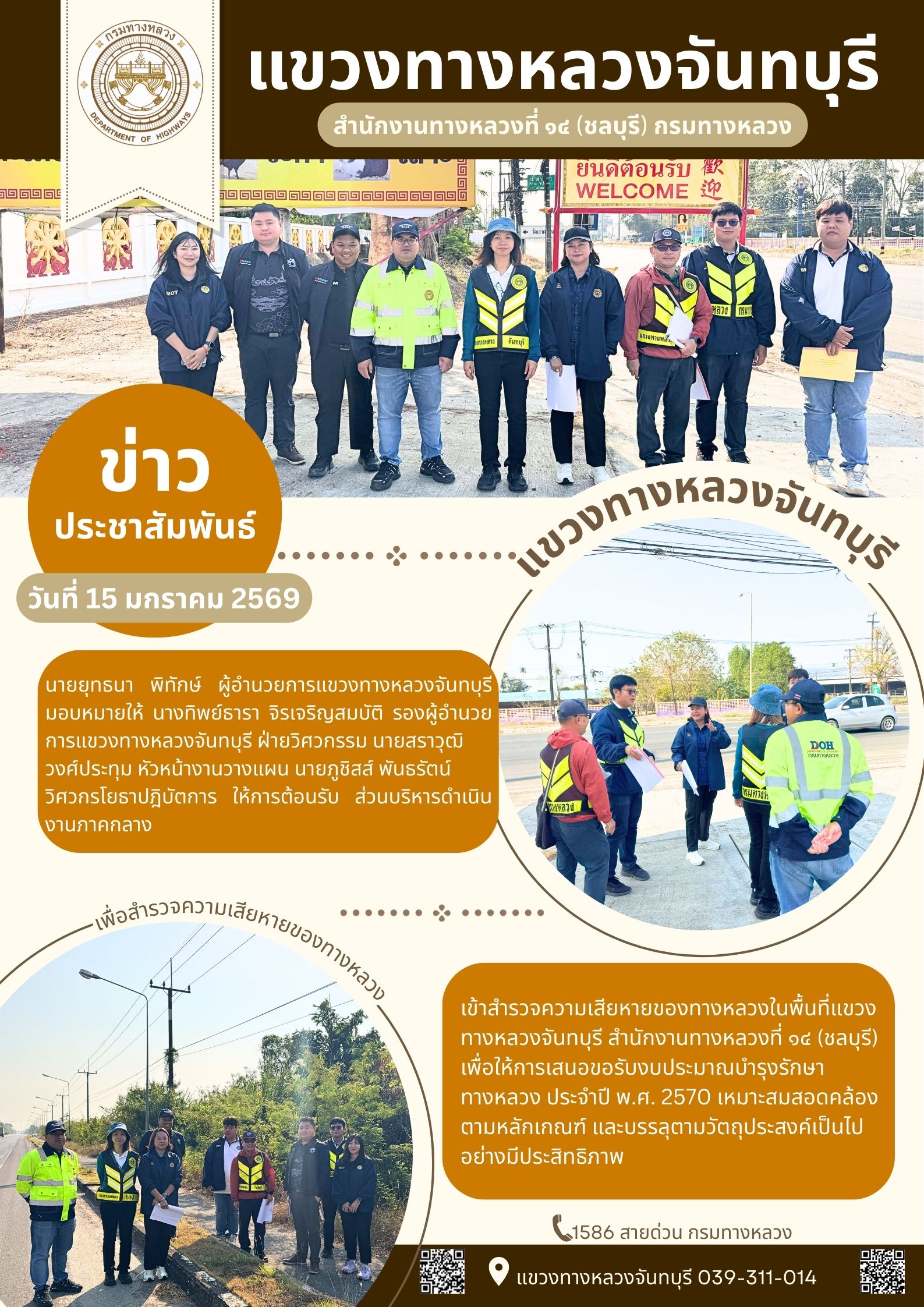 นายยุทธนา พิทักษ์ ผู้อำนวยการแขวงทางหลวงจันทบุรี มอบหมายให้ นางทิพย์ธารา จิรเจริญสมบัติ รองผู้อำนวยการแขวงทางหลวงจันทบุรี ฝ่ายวิศวกรรม นายสราวุฒิ วงศ์ประทุม หัวหน้างานวางแผน นายภูชิสส์ พันธรัตน์ วิศวกรโยธาปฎิบัตการ ให้การต้อนรับ ส่วนบริหารดำเนินงานภาคกลาง เข้าสำรวจความเสียหายของทางหลวงในพื้นที่แขวงทางหลวงจันทบุรี สำนักงานทางหลวงที่ ๑๔ (ชลบุรี) เพื่อให้การเสนอขอรับงบประมาณบำรุงรักษาทางหลวง ประจำปี พ.ศ. 2570 เหมาะสมสอดคล้องตามหลักเกณฑ์ และบรรลุตามวัตถุประสงค์เป็นไปอย่างมีประสิทธิภาพ